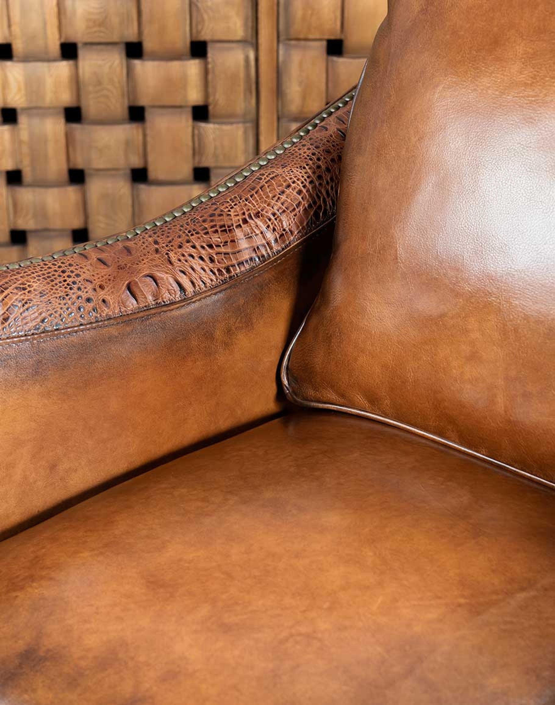 Embossed Leather Description: A leather used to accent many of today's home interiors. The leather hide is first embossed with a large crocodile grain and then colored by applying two base color coats of micro pigments. The leather is then wiped-off to give it a contrast of colors utilizing the base color combination. This color contrast is further accented by two additional top coat colors that are wiped-on by hand to give the leather a beautiful antique look. The last step is to slightly protect the hand work of the leather hide with a lacquer topcoat that provides great depth and warmth to the finished product.