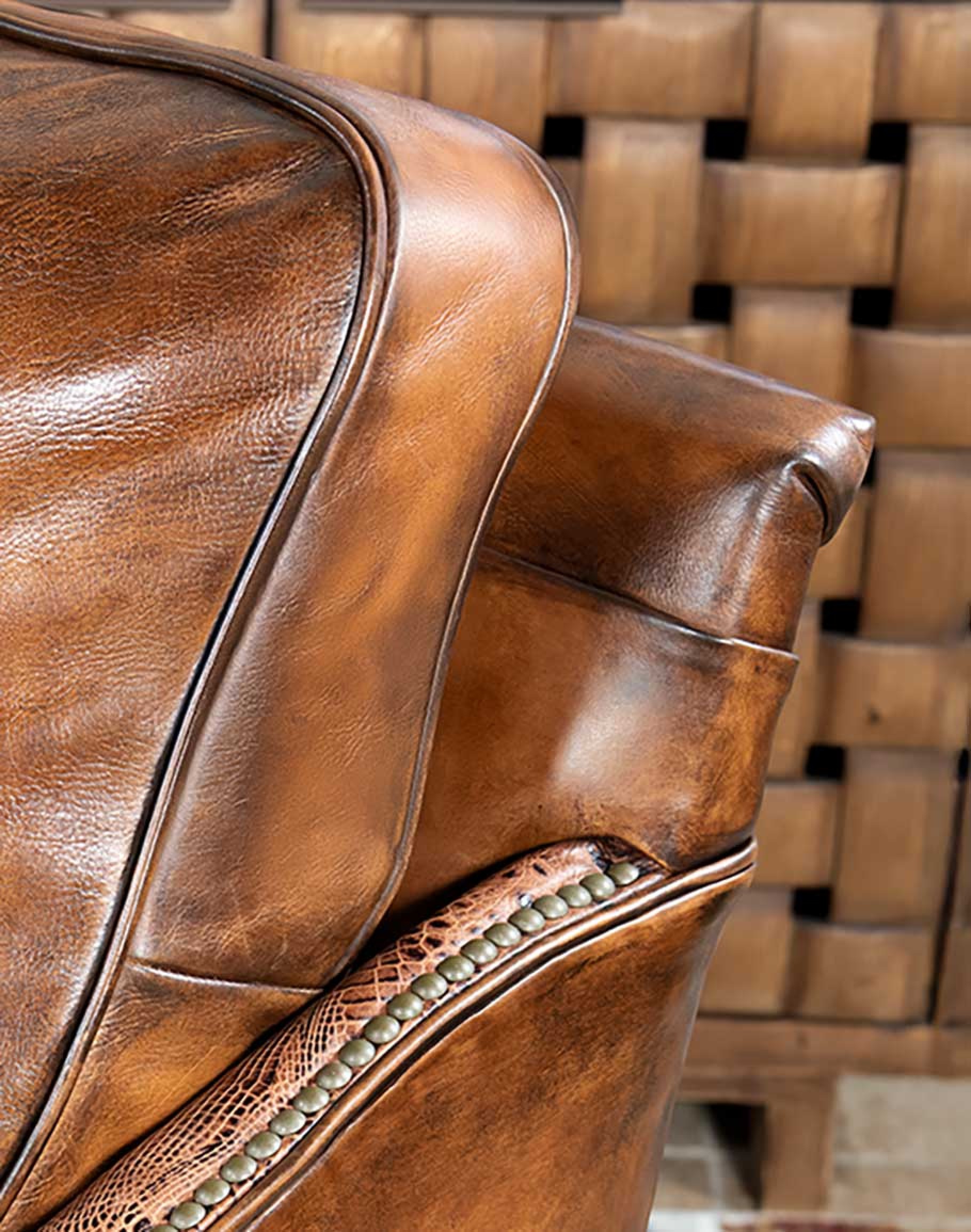 Leather Description:This is a full grain aniline leather tanned in a historic leather producing region of Italy using English hides. The century old tannery prepares this leather article by applying a hot wax, then turning the hides in old wooden tanning drums overnight to soften the natural fibers and impart it with a remarkable suppleness. The leather is then upholstered in its "crust form" on the furniture in North Carolina, After the furniture is made our leather artisans apply a multi step hand rubbed Patina using the same waxes and pigments used in Italy. Performing this process on the actual finished piece allows our artisans to develop a unique Patina, composition, and overall essence that creates a piece of furniture that has uniqueness, character and style that matches the individual who's selecting it. This leather imparts the feeling of a softer, well broken in leather one might find on a decades old chair discovered in a French country estate or the Parisian flea market. The leather is brand new from our Artisans hands... without the aging issues that sometimes come from the hands of time. Truly a unique, hand-made article in an era when only companies committed to the highest standards lavish this sort of attention and time to unique American made furniture.
