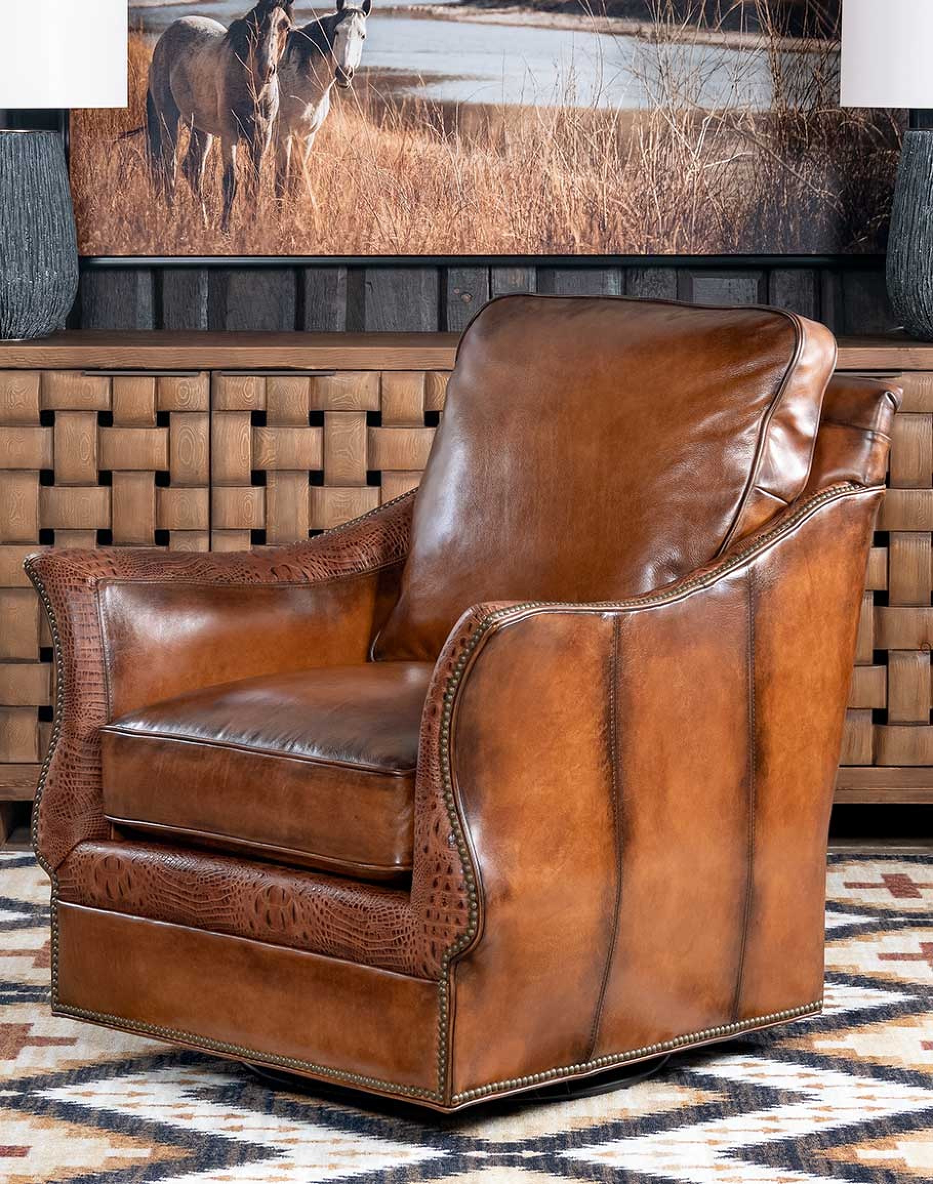 Introducing the Calexico Leather Swivel Glider Chair from the Classic Ranch collection by Remington Tanner, a true masterpiece of craftsmanship and elegance. This chair features supple, hand-burnished leather, providing an antique appearance that speaks of the loving touch of time. The embossed large crocodile grain adds a touch of exotic sophistication, making it a standout piece in any living space.