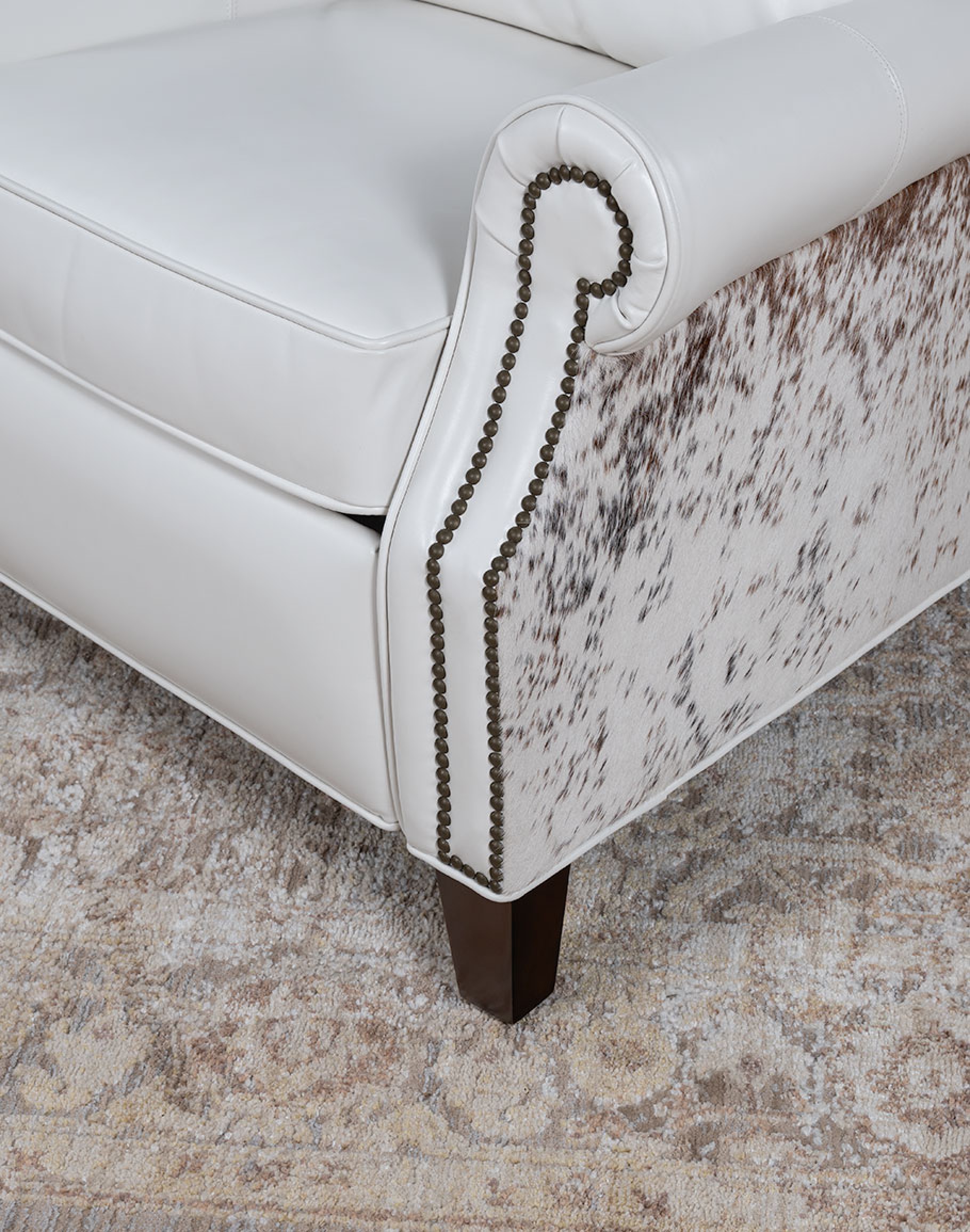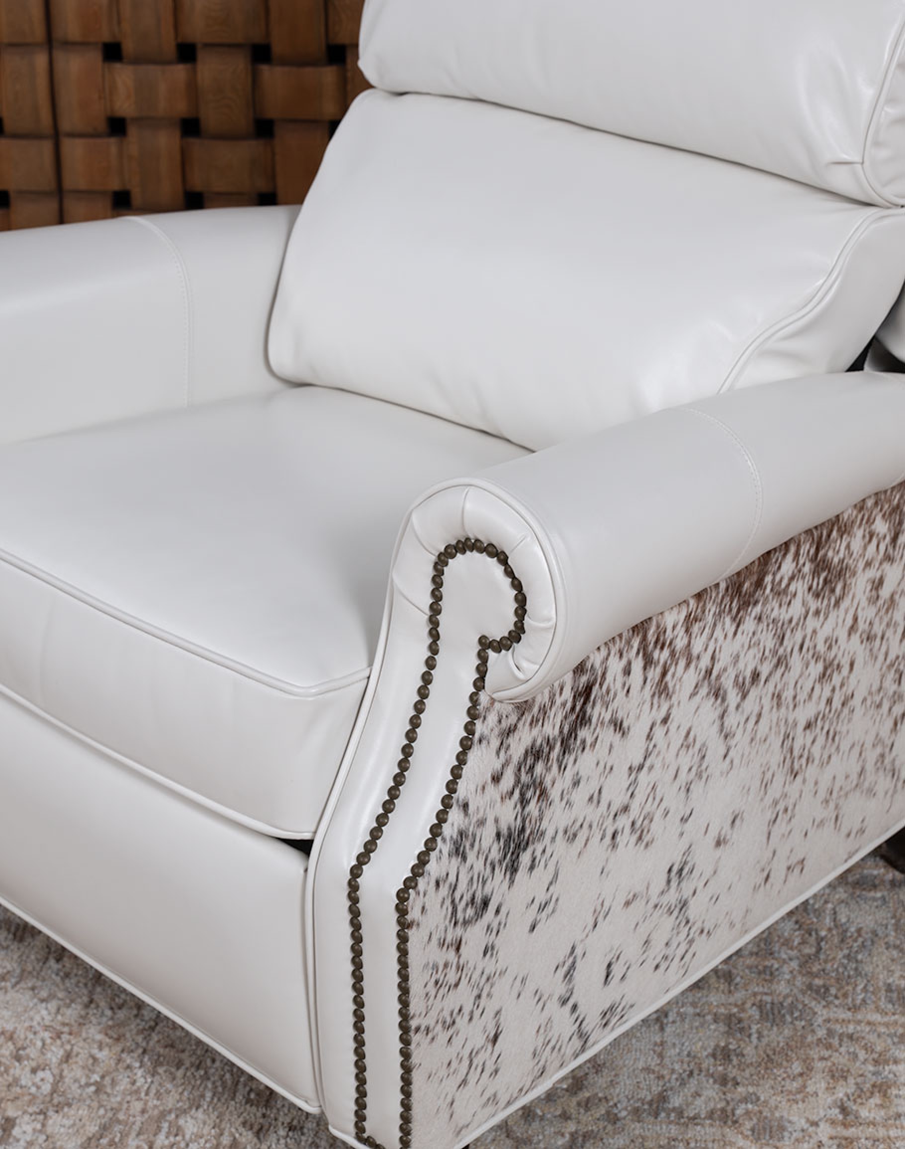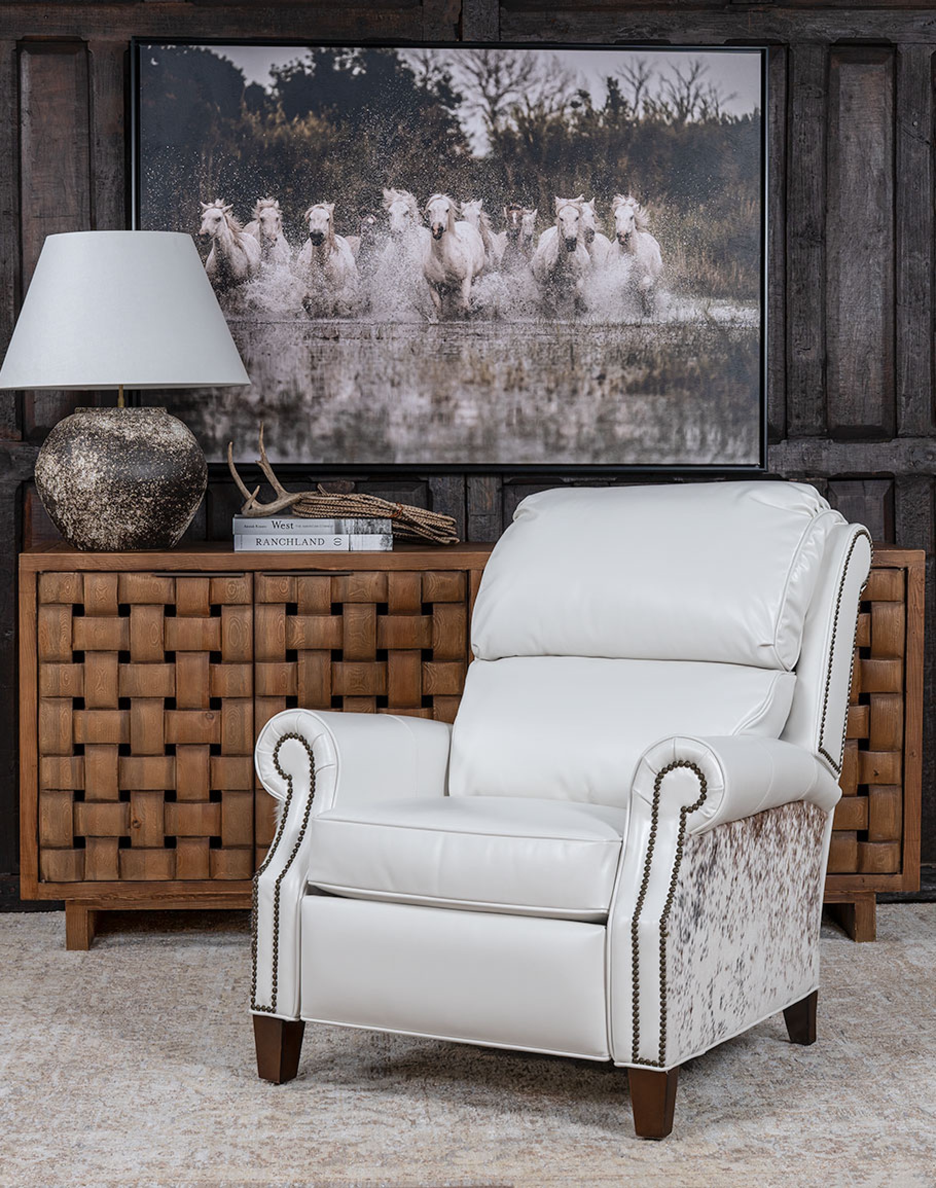 The Calhoun Leather Recliner exemplifies classic and desert ranch aesthetics, blending beauty and comfort seamlessly. Crafted with 100% top-grain leather and premium cowhide accents, its various textures and light coloring blend perfectly into several styles. The neutral, light color tones of the Calhoun Leather Recliner create a striking contrast against darker furniture and decor, brightening up any living space. The oversized bustle back provides ample neck, head, and lower back support, ensuring ultimate relaxation. 100% American-made to the highest quality standards, this luxurious leather chair is a timeless addition to your home. At Adobe Interiors, we create the furniture, and you create the memories.