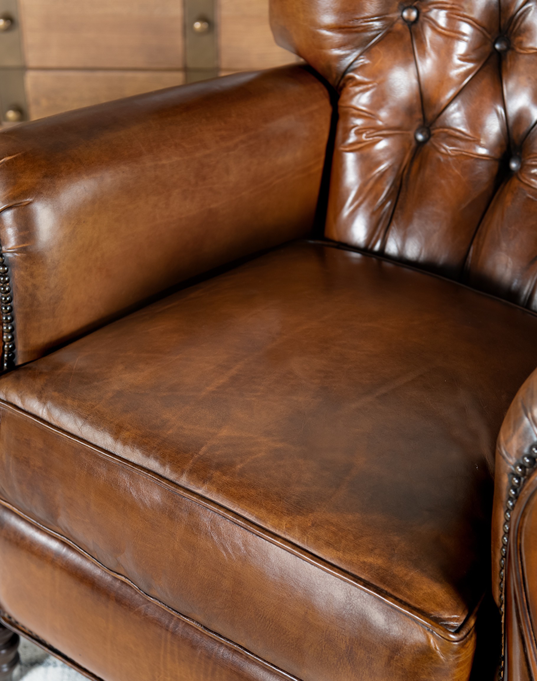 Leather Description: This is a full grain aniline leather tanned in a historic leather producing region of Italy using English hides. The century old tannery prepares this leather article by applying a hot wax, then turning the hides in old wooden tanning drums overnight to soften the natural fibers and impart it with a remarkable suppleness. The leather is then upholstered in its "crust form" on the furniture in Hickory, NC, After the furniture is made our leather artisans apply a multi step hand rubbed Patina using the same waxes and pigments used in Italy. Performing this process on the actual finished piece allows our artisans to develop a unique Patina, composition, and overall essence that creates a piece of furniture that has uniqueness, character and style that matches the individual who's selecting it. Sauvage imparts the feeling of a softer, well broken in leather one might find on a decades old chair discovered in a French country estate or the Parisian flea market. The leather is brand new from Remington Tanner's Artisans hands... without the aging issues that sometimes come from the hands of time. Truly a unique, hand-made article in an era when only companies committed to the highest standards lavish this sort of attention and time to unique American made furniture.