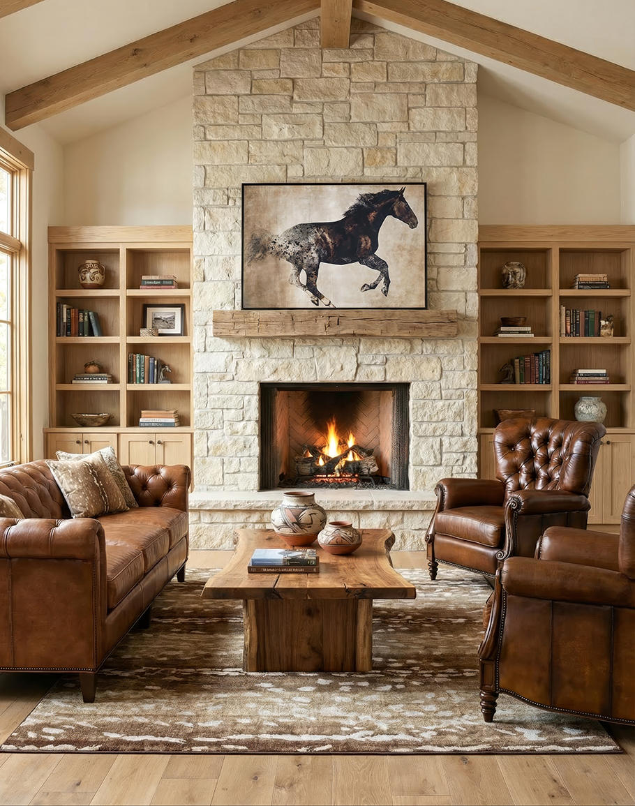 Our Jericho Leather Sofa is a striking, fashionable piece of classic ranch style. This rich hand, burnished leather sofa with a natural blonde cowhide..