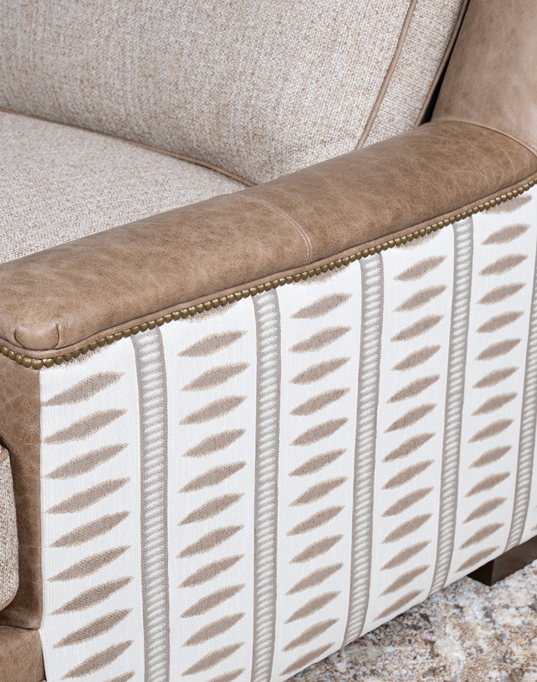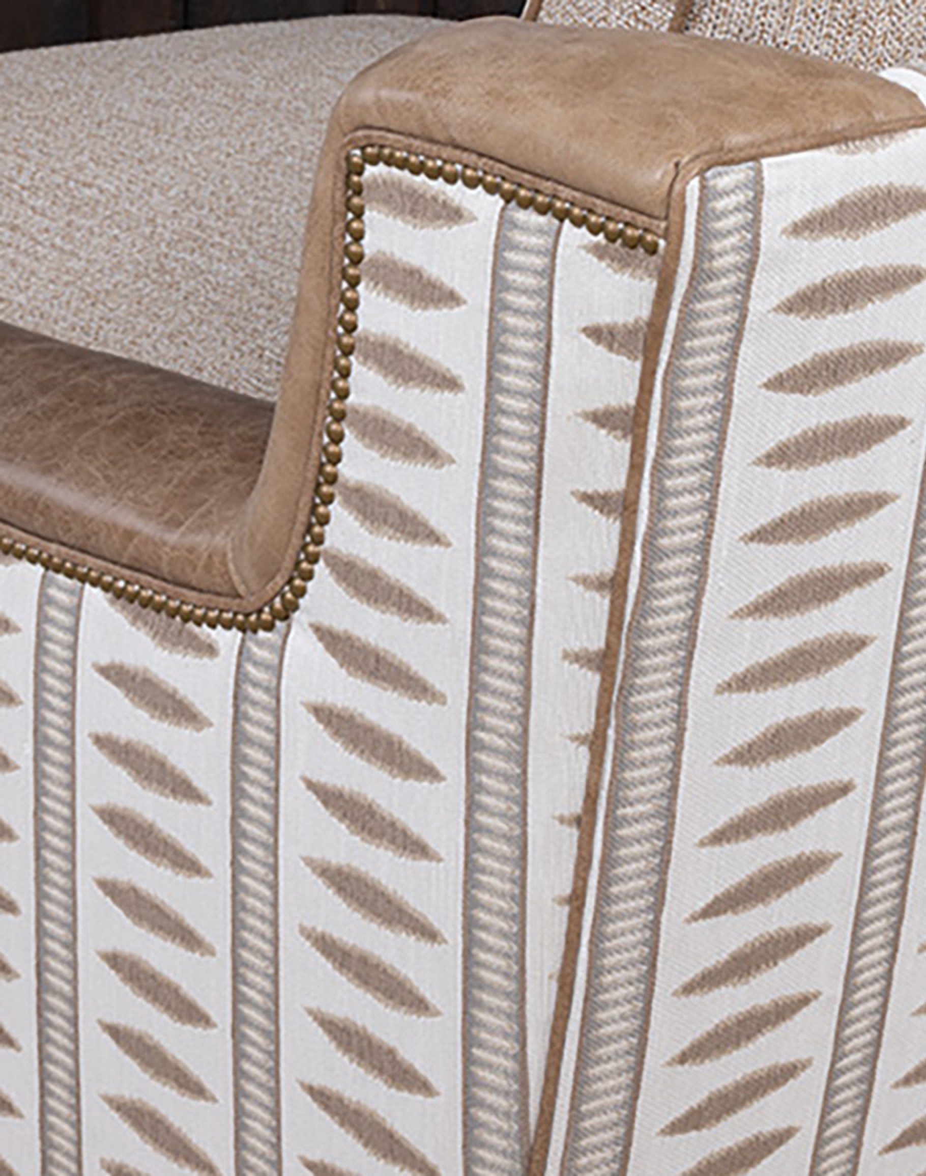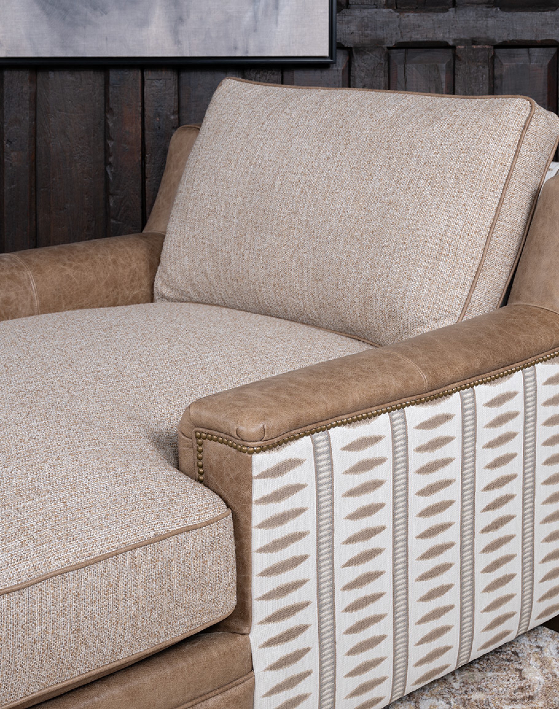 The reversible seat cushion offers versatile styling options: one side is fully upholstered in premium woven fabric, while the other includes a leather “boot rest” section for added durability and design interest. The outer back and sides are wrapped in a geometric woven textile in a soft desert sand tone, finished with antique brass nailhead trim for a tailored edge. With a deep seat and plush cushioning, the Cameron is designed for hours of lounging, reading, or relaxing by the fire. Its neutral palette and mixed materials allow it to complement Adobe’s Desert Ranch, Mountain Ranch, and Eclectic Ranch collections effortlessly. At Adobe Interiors, we create the furniture, and you create the memories.