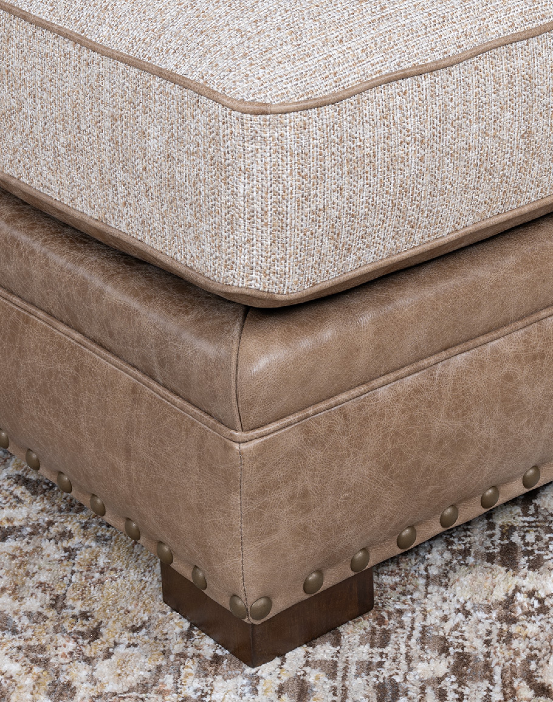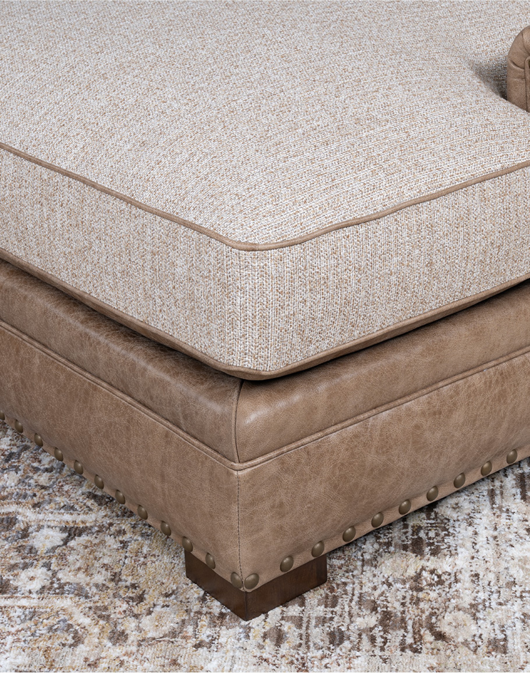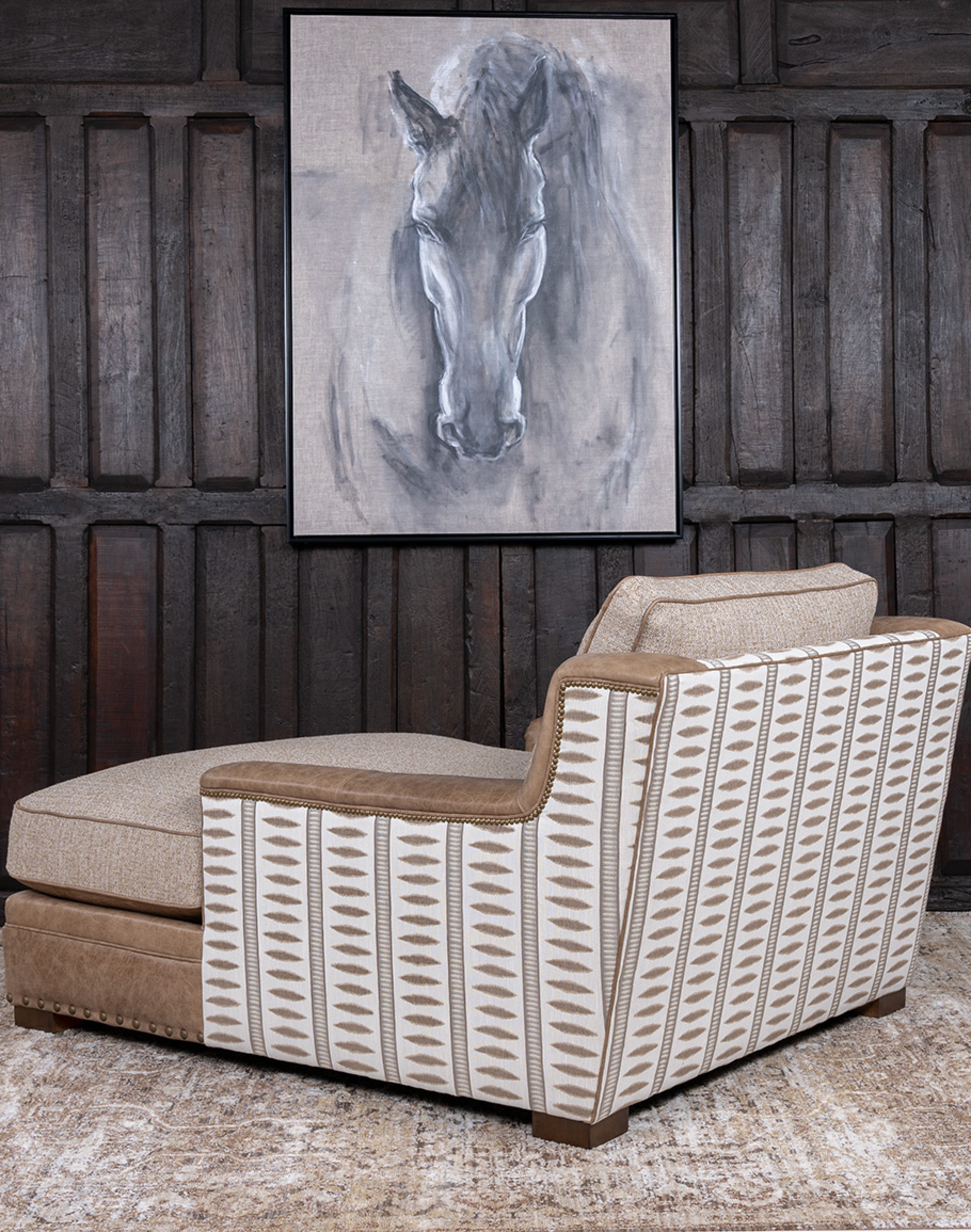 The reversible seat cushion offers versatile styling options: one side is fully upholstered in premium woven fabric, while the other includes a leather “boot rest” section for added durability and design interest. The outer back and sides are wrapped in a geometric woven textile in a soft desert sand tone, finished with antique brass nailhead trim for a tailored edge. With a deep seat and plush cushioning, the Cameron is designed for hours of lounging, reading, or relaxing by the fire. Its neutral palette and mixed materials allow it to complement Adobe’s Desert Ranch, Mountain Ranch, and Eclectic Ranch collections effortlessly. At Adobe Interiors, we create the furniture, and you create the memories.