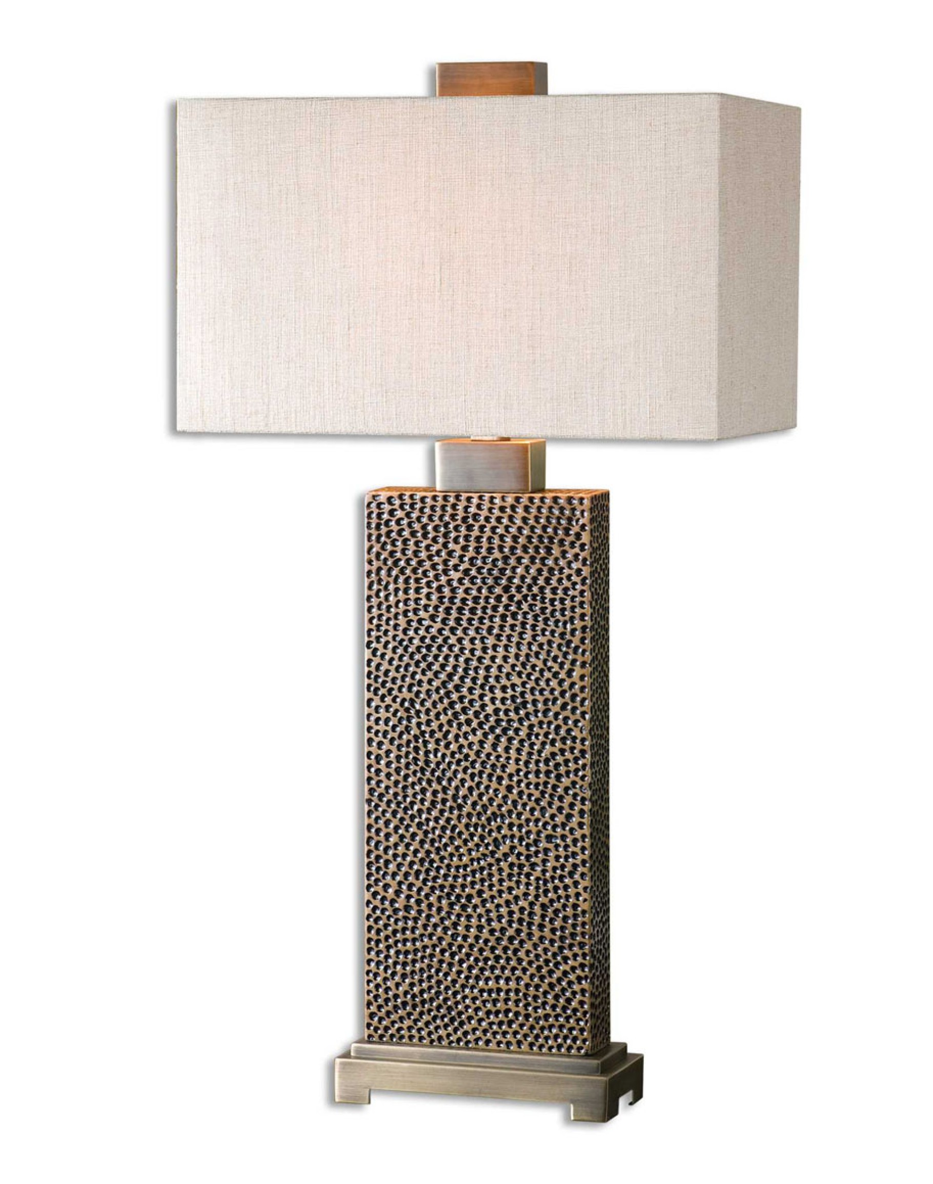 Pitted base finished in a blackened brown accented with coffee bronze plated details. The rectangle hardback shade is a beige linen fabric with light slubbing.