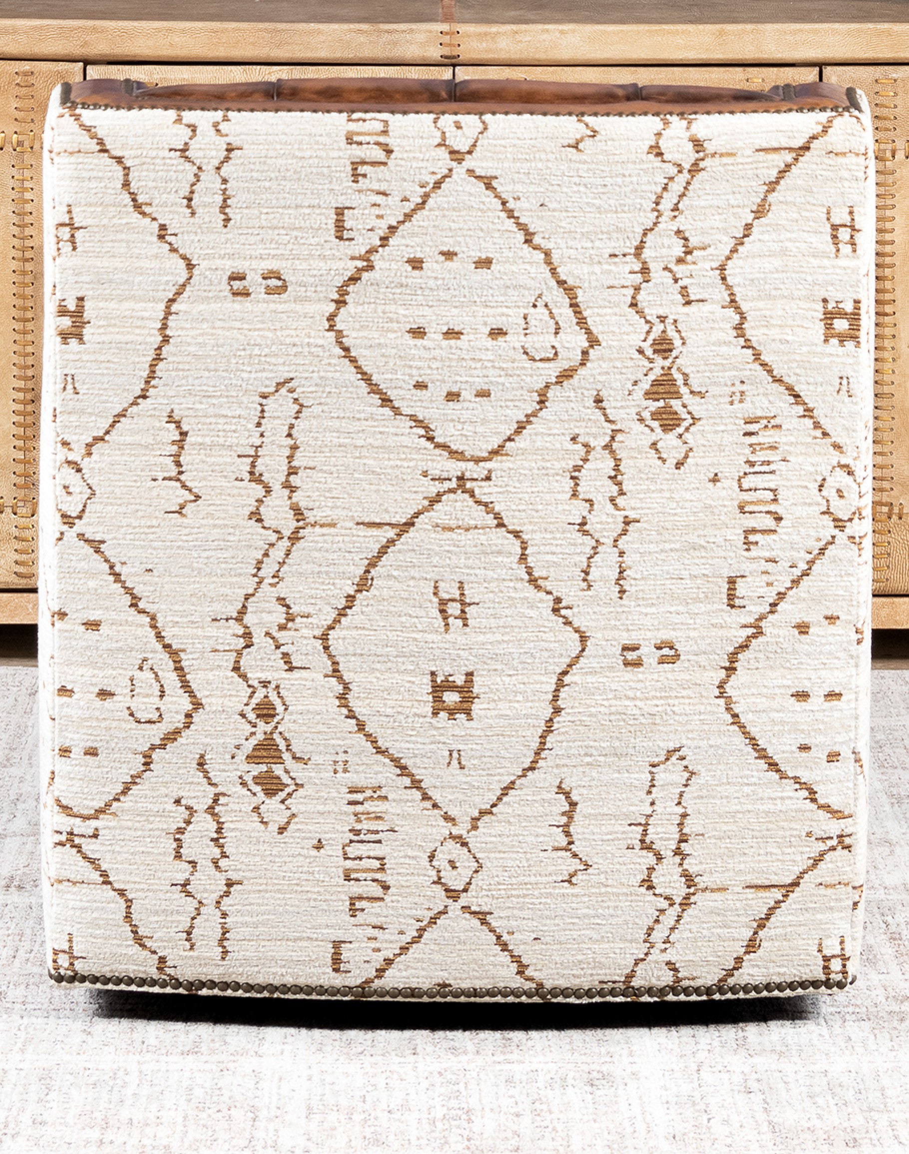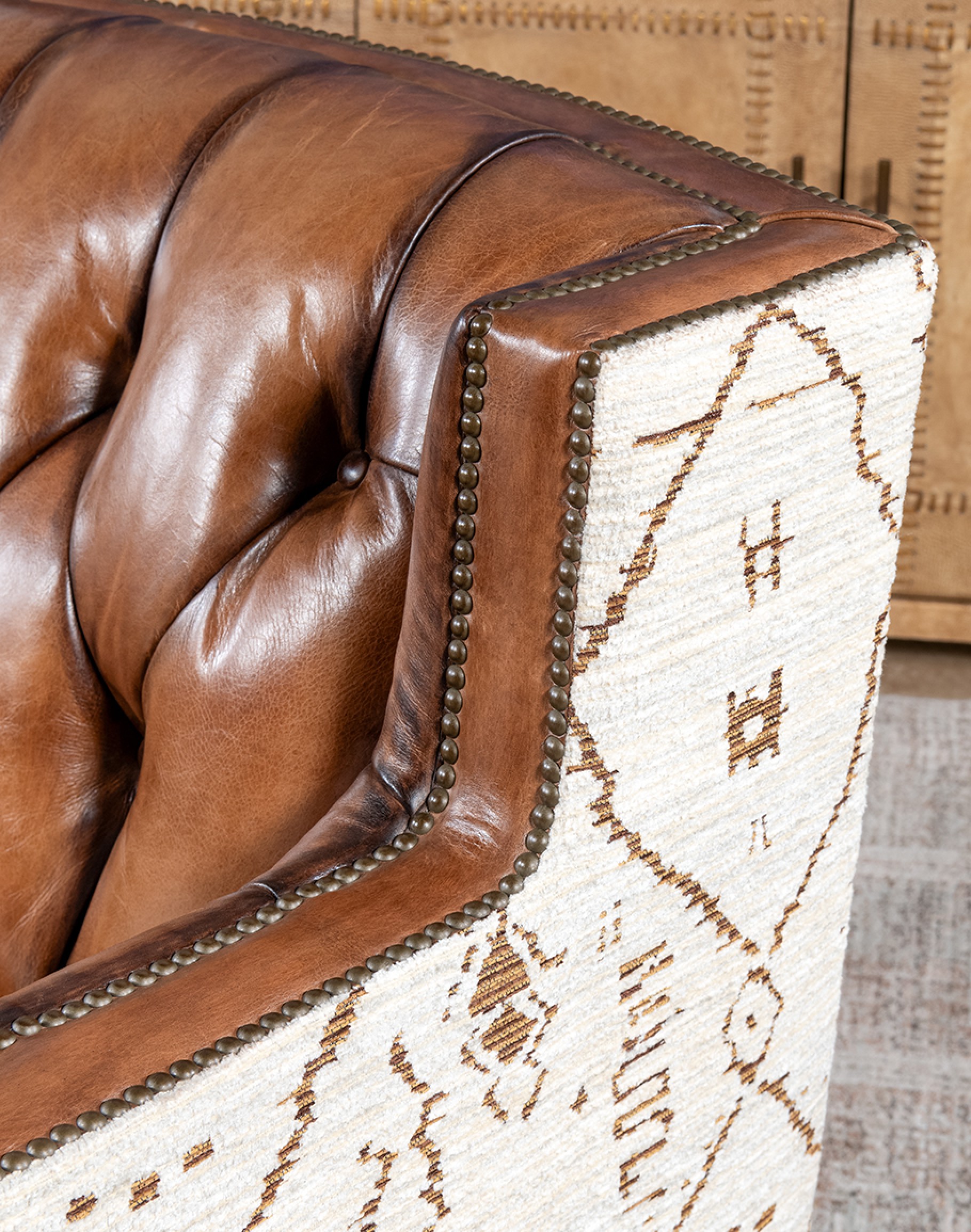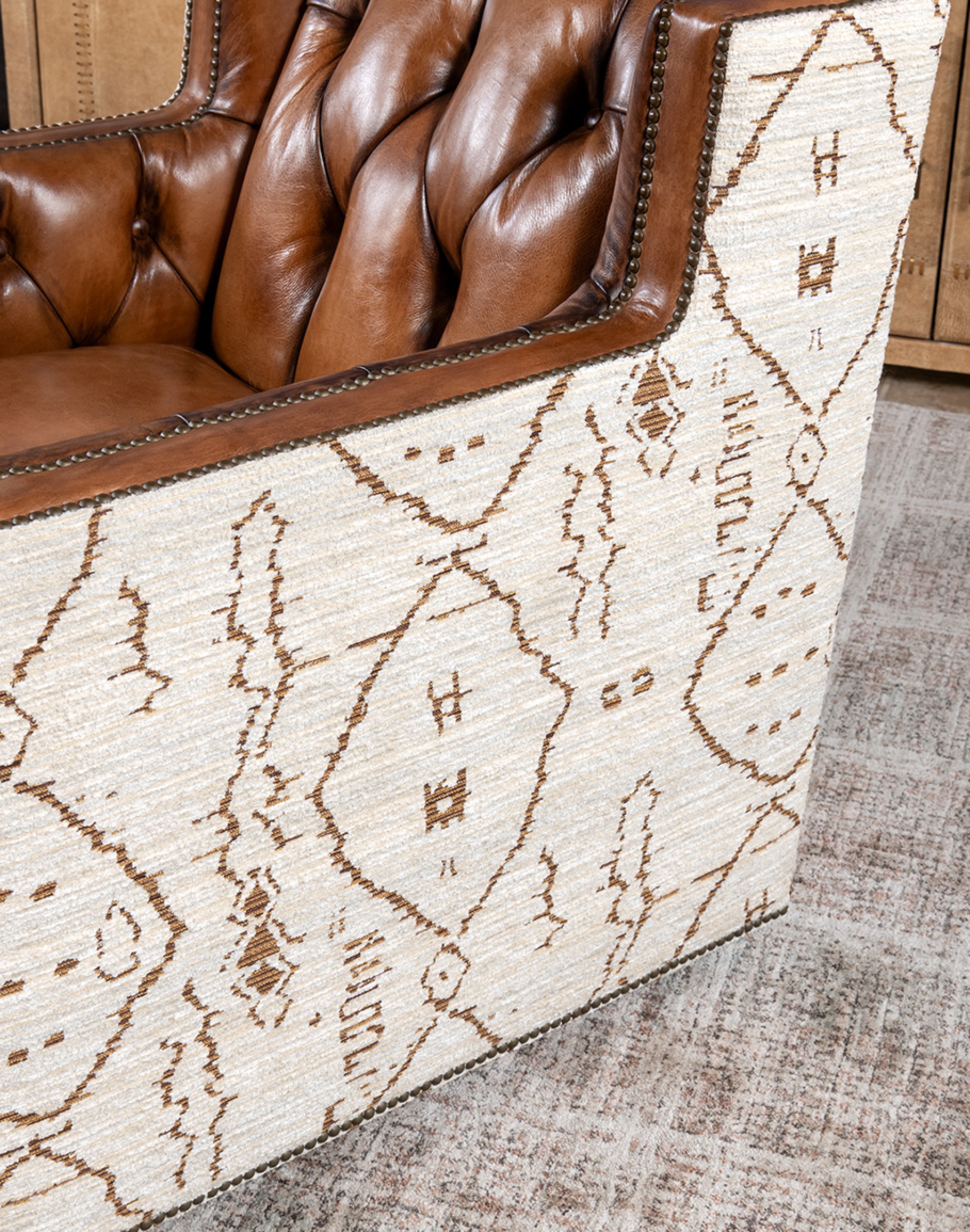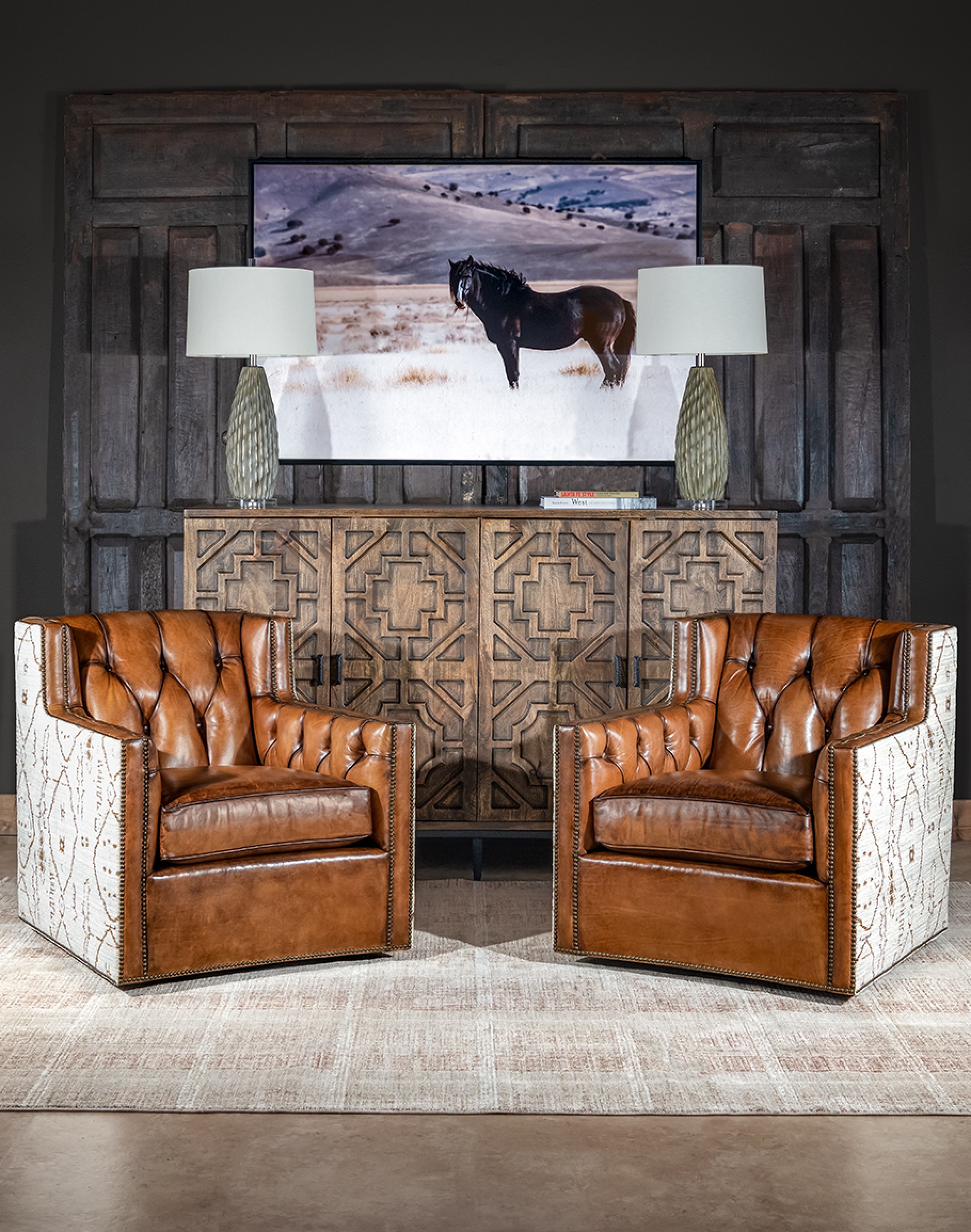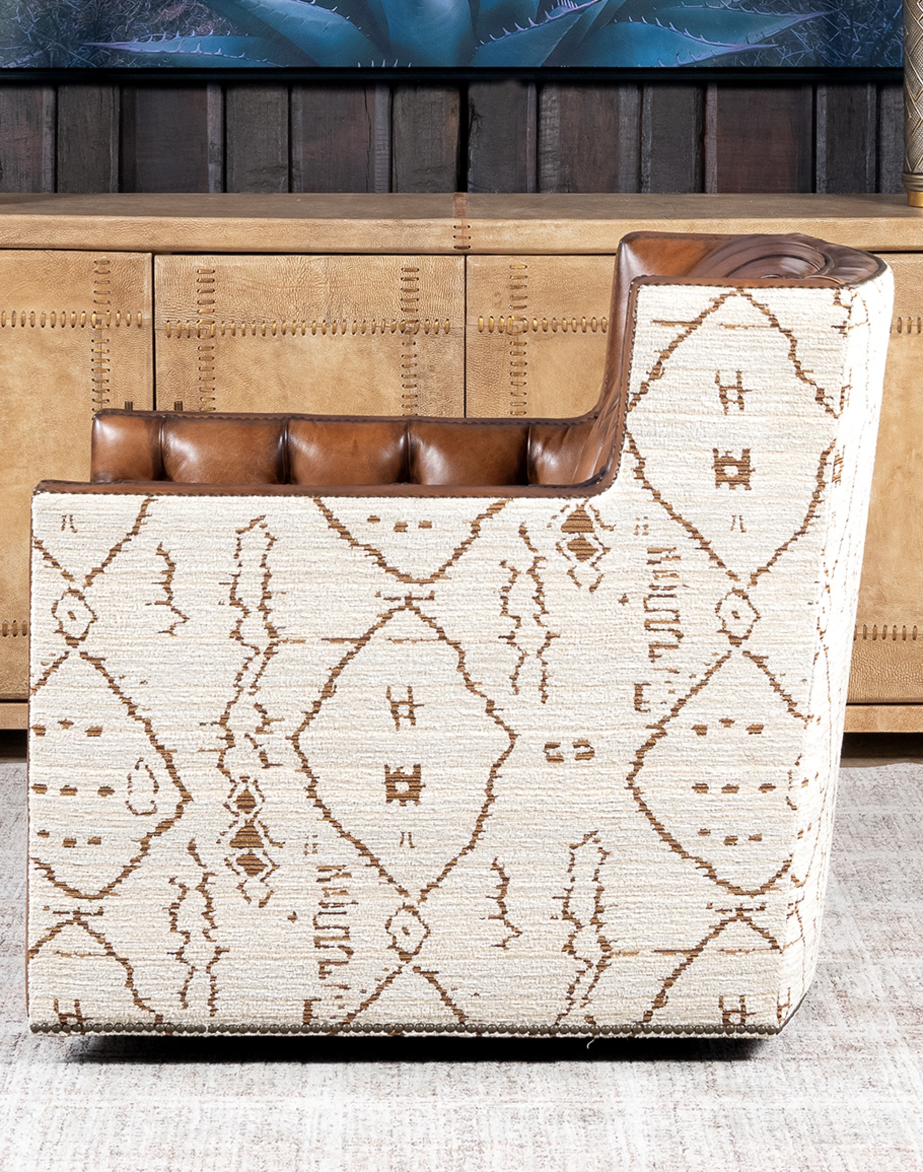 This classy piece of furniture boasts an eye-catching patterned fabric complimented by a profoundly tufted leather inside seat back and inside arms. Suitable for use in any fine rustic home, the Carlsbad Swivel Chair is a commanding accent chair in any living room, sitting room or front room, formal enough to use while entertaining guests, and comfortable enough to use while unwinding after a long day. This high-quality leather and fabric mixed swivel chair is an heirloom piece to build your living room around. At Adobe Interiors, we create the furniture, and you create the memories.