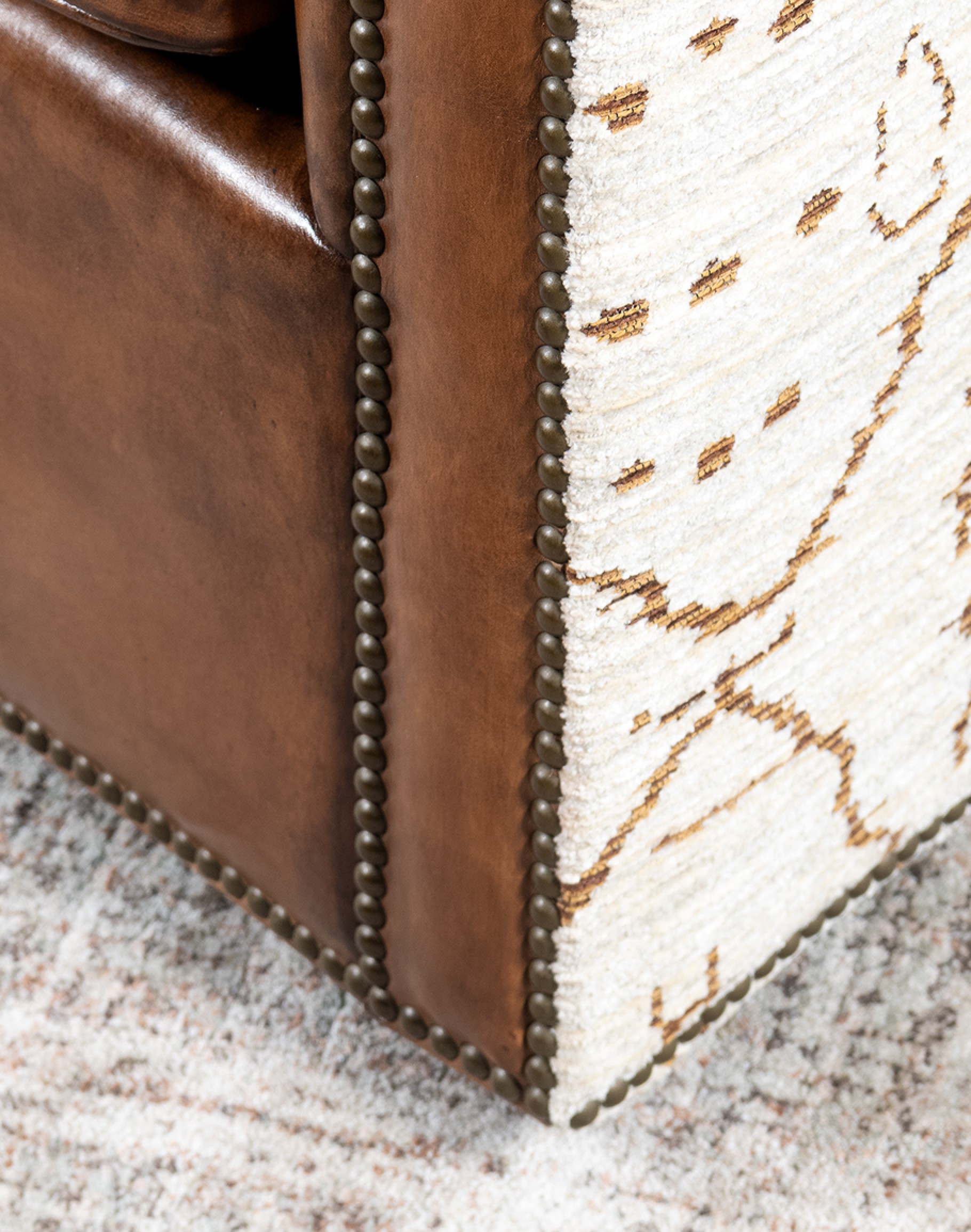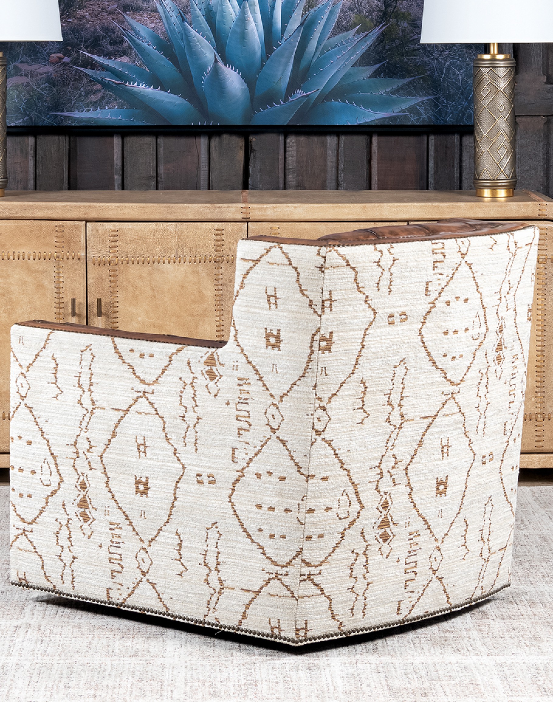 Our Carlsbad Swivel Chair is one of the most stunning examples of a rustic, elegant, southwestern swivel chair design and a star in the Desert Ranch collection. Luxurious hand-burnished mocha-colored leather accented with brass nail heads and a contrasting fabric wrapped around the outside of this fine swivel chair.