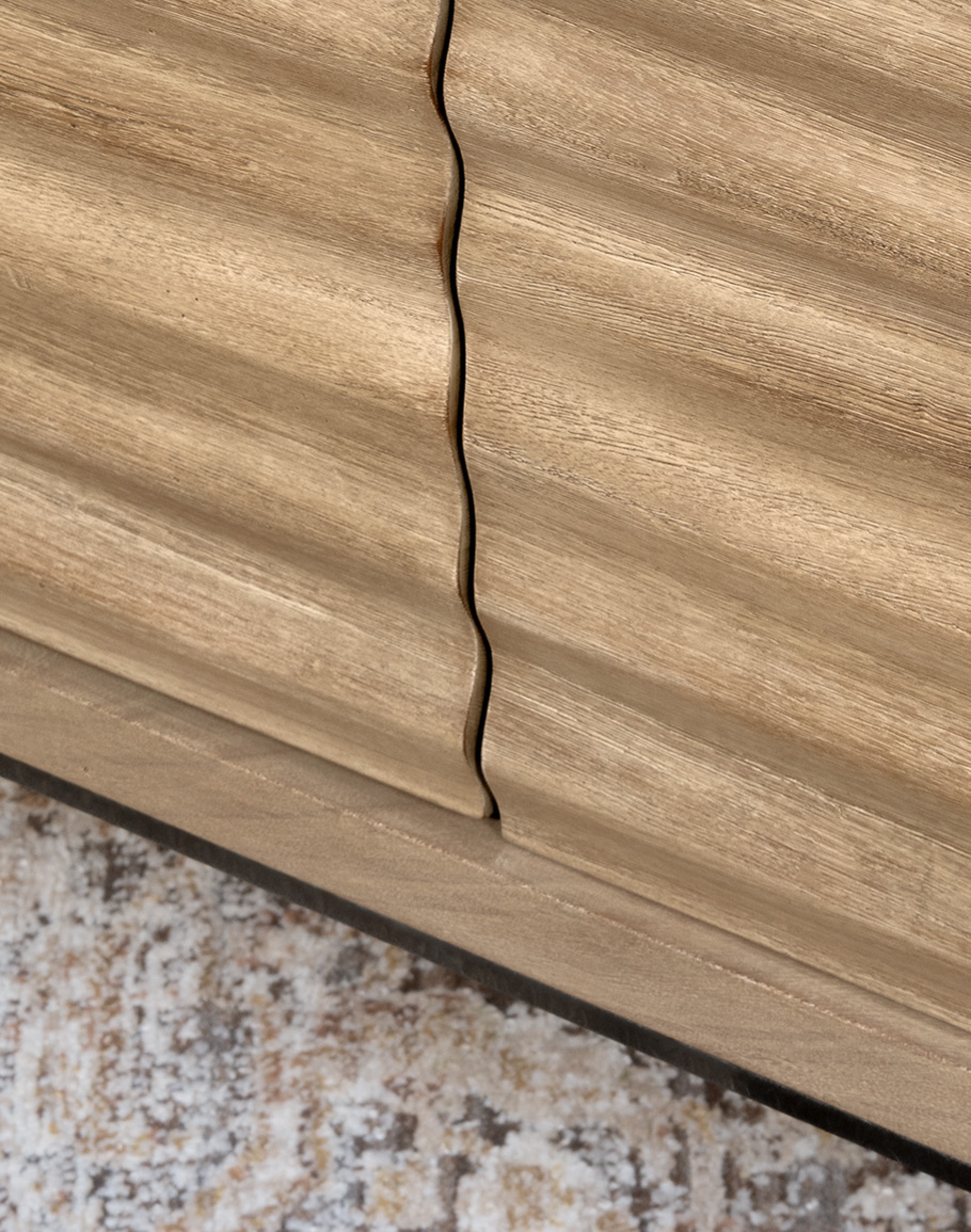 The buffet is supported by hand-forged iron legs, which add a touch of industrial elegance and ensure sturdy support. The cascading ridged details on the cabinet fronts add depth and texture, creating a striking visual appeal. Whether used as a dining room buffet, a media console, or an entry chest, this piece seamlessly adapts to various decor styles.