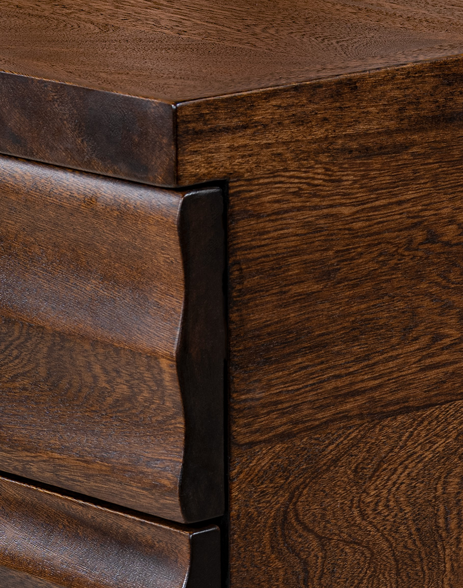 Elevate your interiors with the exquisite Cascade Brown Buffet, a stunning fusion of timeless design and everyday functionality. Handcrafted in the USA, this buffet is constructed from solid hardwood and finished in a rich Cascade Brown stain that beautifully accentuates the natural wood grain. The distinctive sculpted wave-front paneling adds a modern designer touch, while maintaining the warmth and character of classic craftsmanship. It's thoughtfully designed structure features three spacious drawers and four cabinets, complete with a center shelf, offering ample storage for dining essentials, electronics, or entryway accessories.