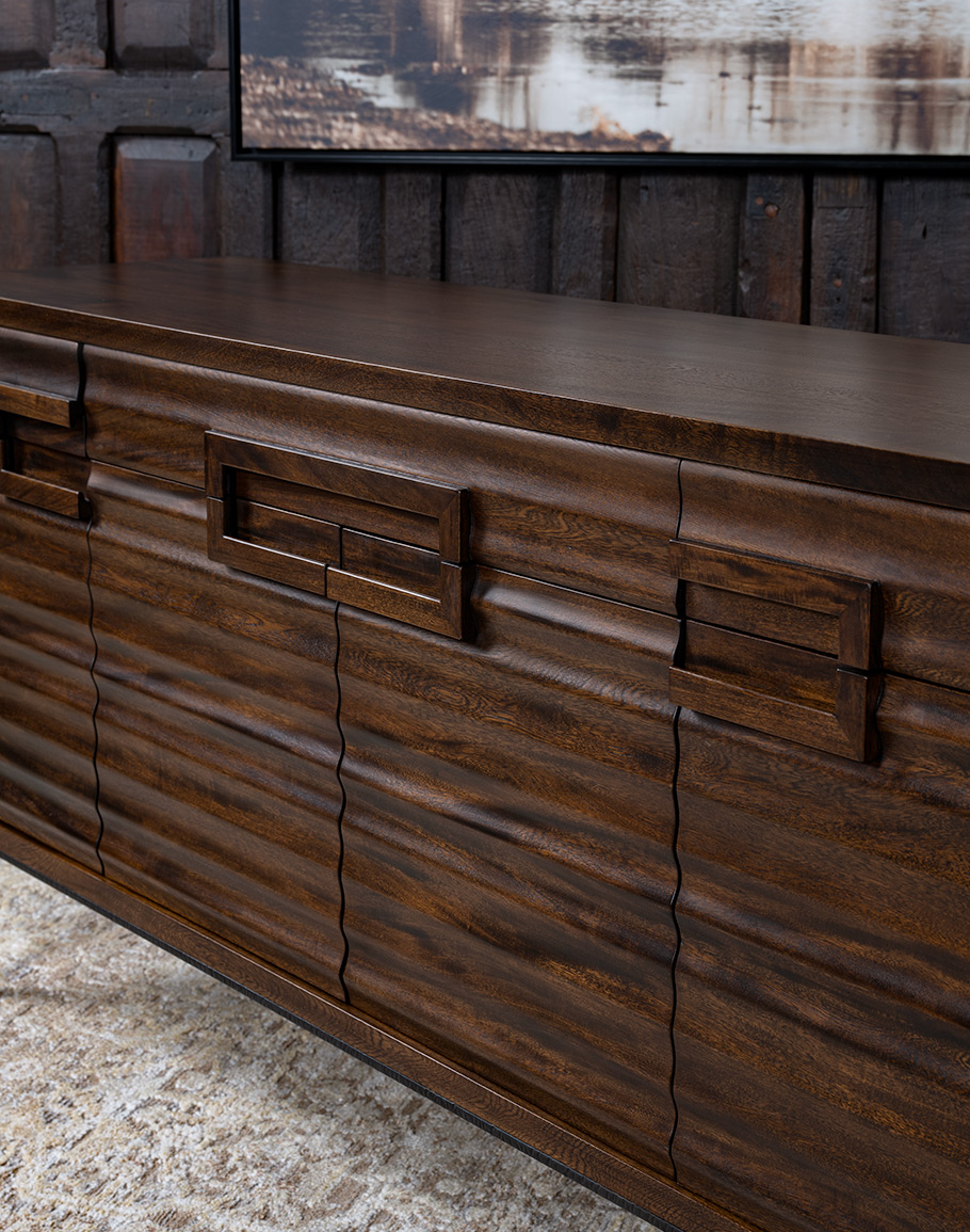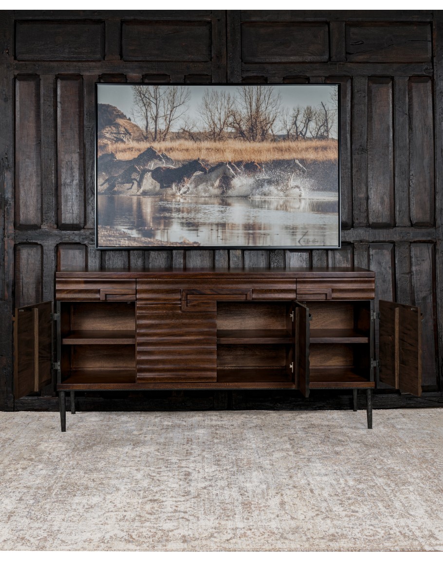 The buffet is supported by hand-forged iron legs, which add a touch of industrial elegance and ensure sturdy support. The cascading ridged details on the cabinet fronts add depth and texture, creating a striking visual appeal. Whether used as a dining room buffet, a media console, or an entry chest, this piece seamlessly adapts to various decor styles.