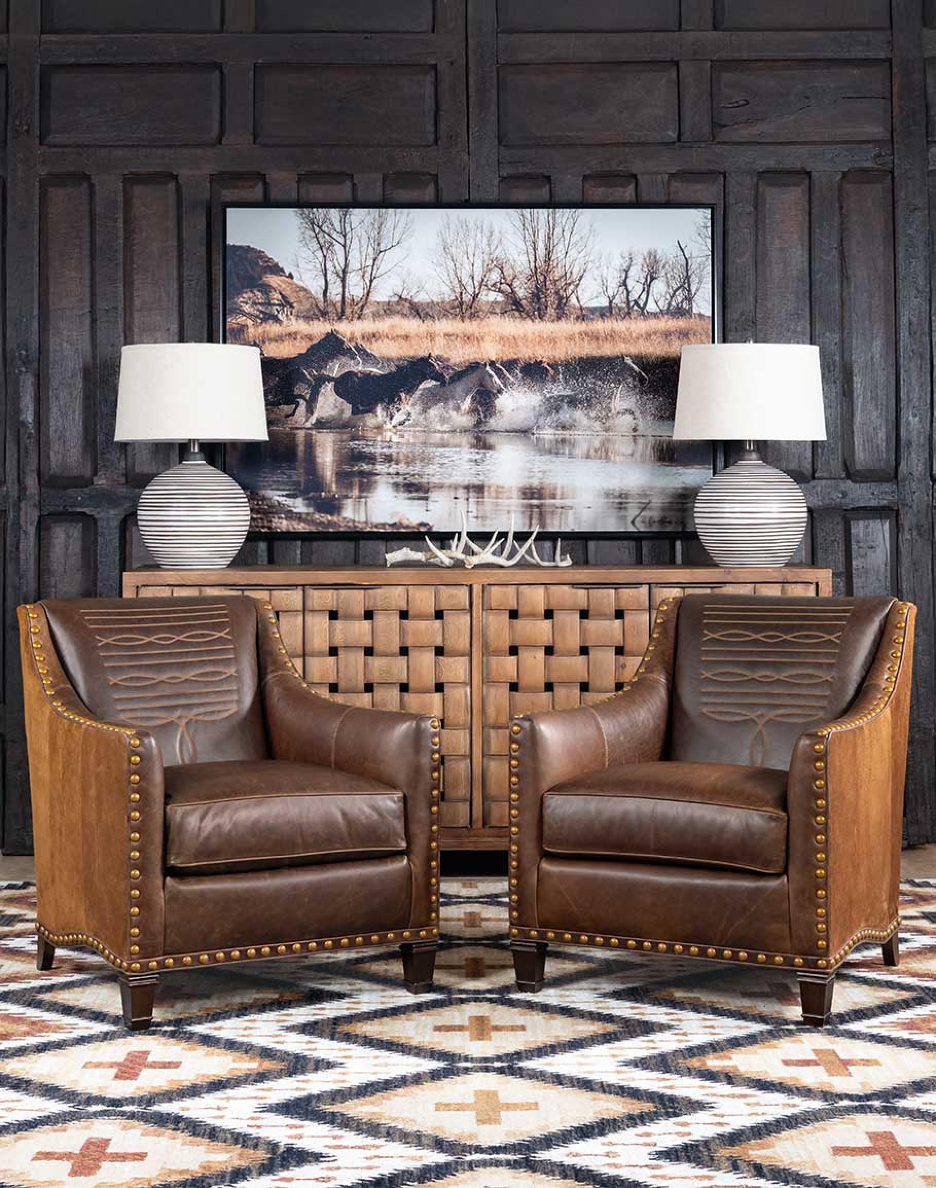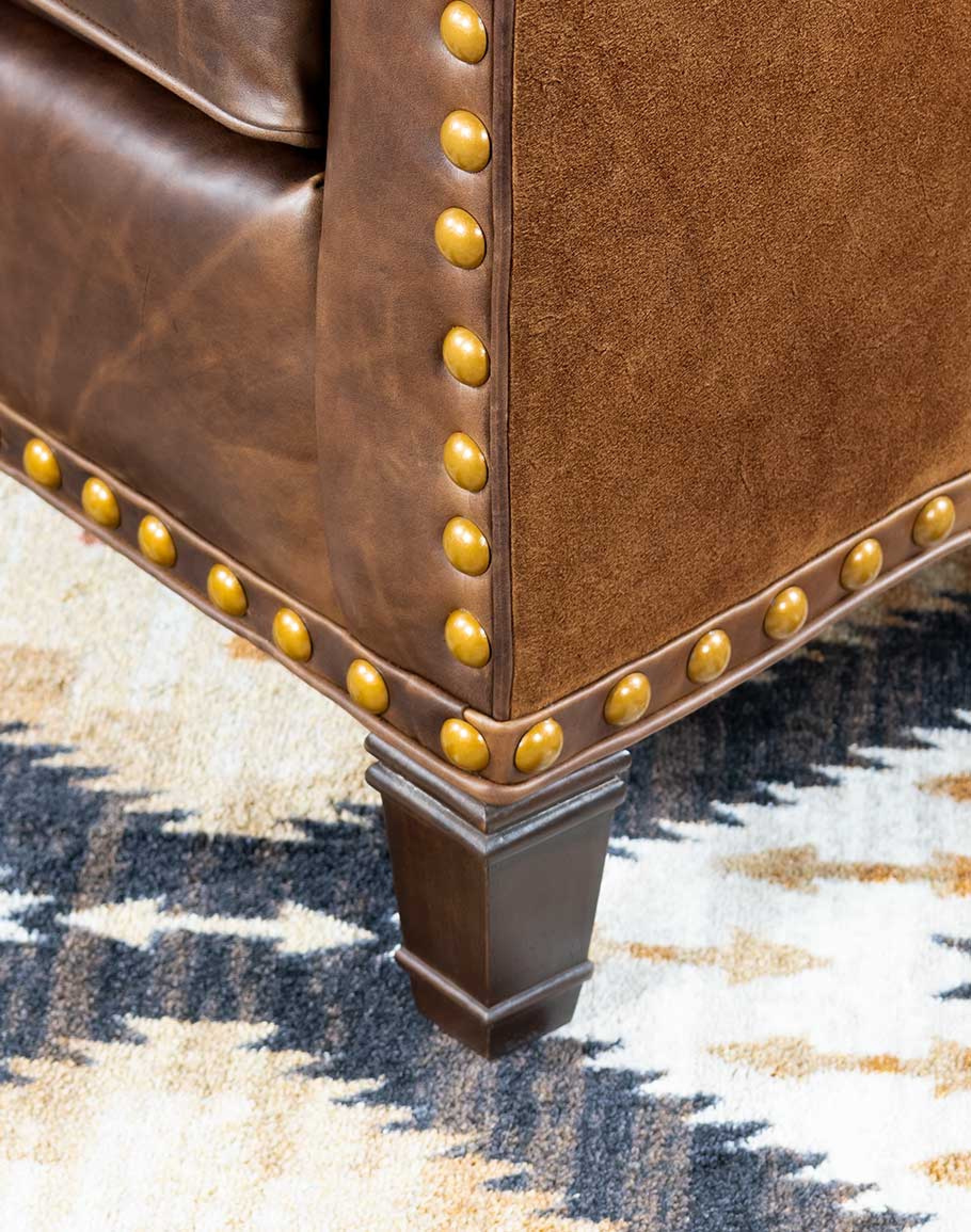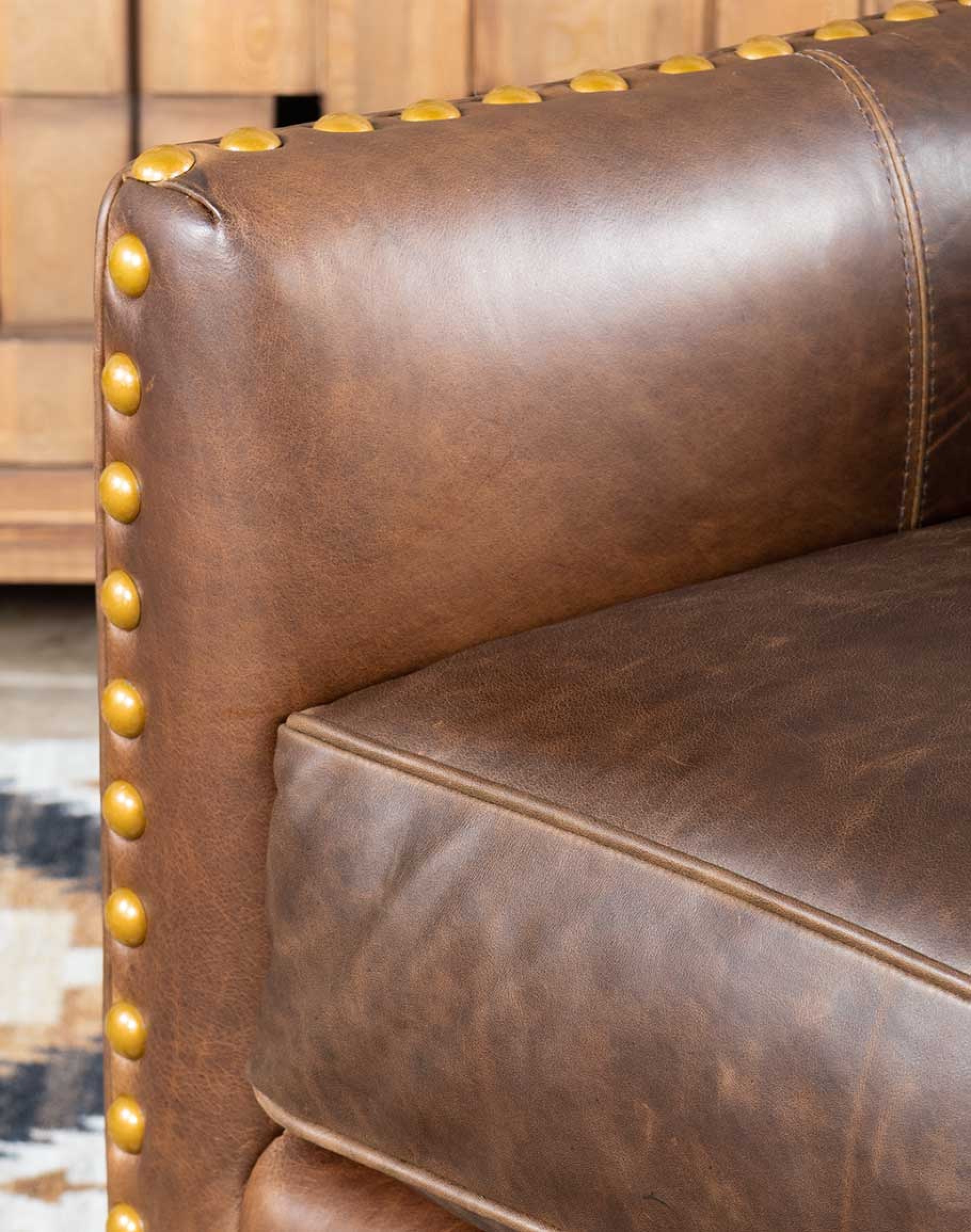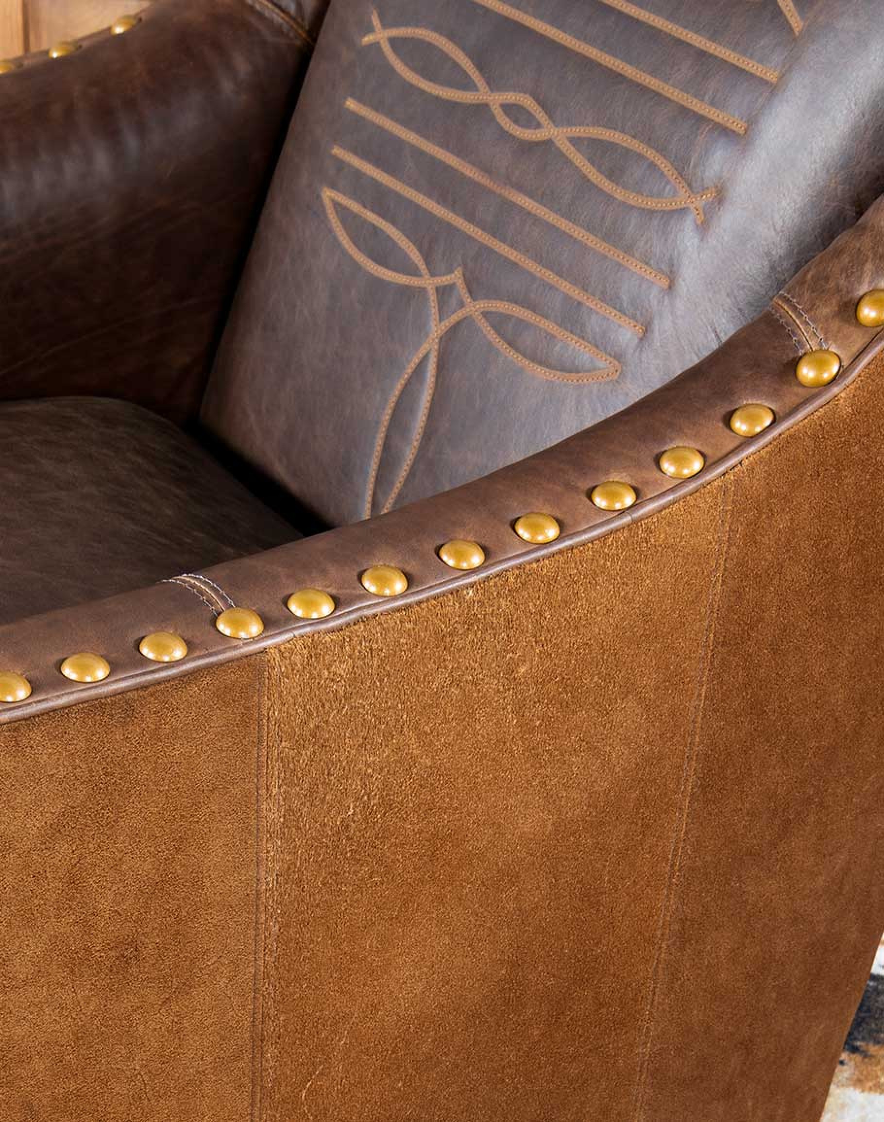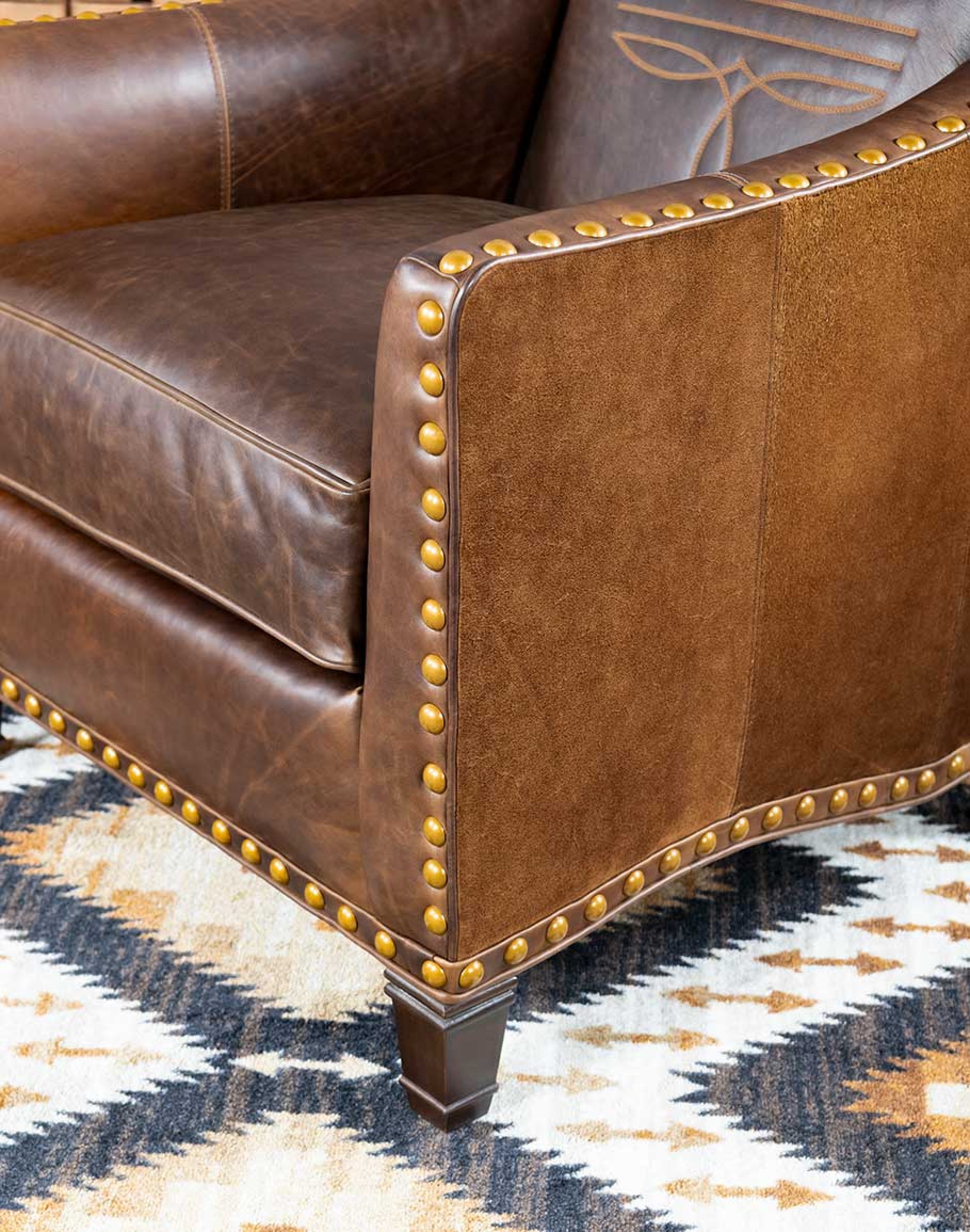 The Cassidy Brown Leather Chair stands out with its distinctive cowboy boot emblem stitched into the inside seat back, offering a nod to Western heritage and Adobe Interiors' commitment to timeless design. The brass nailhead trim along the base and arms accentuates the chair's sturdy, refined silhouette, making it an eye-catching piece in any interior.