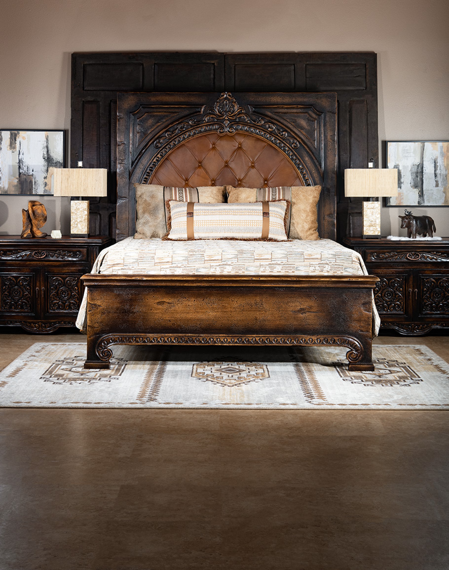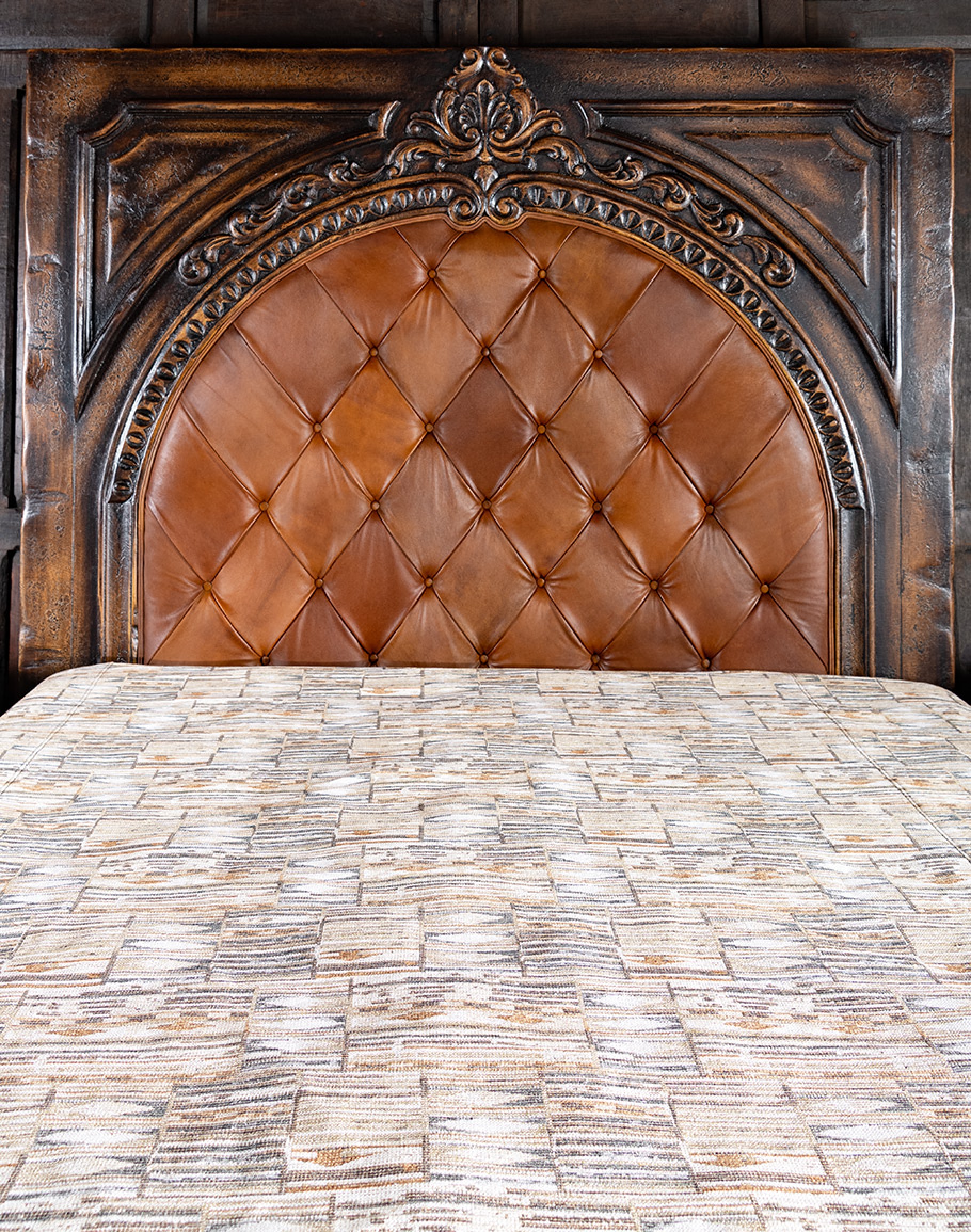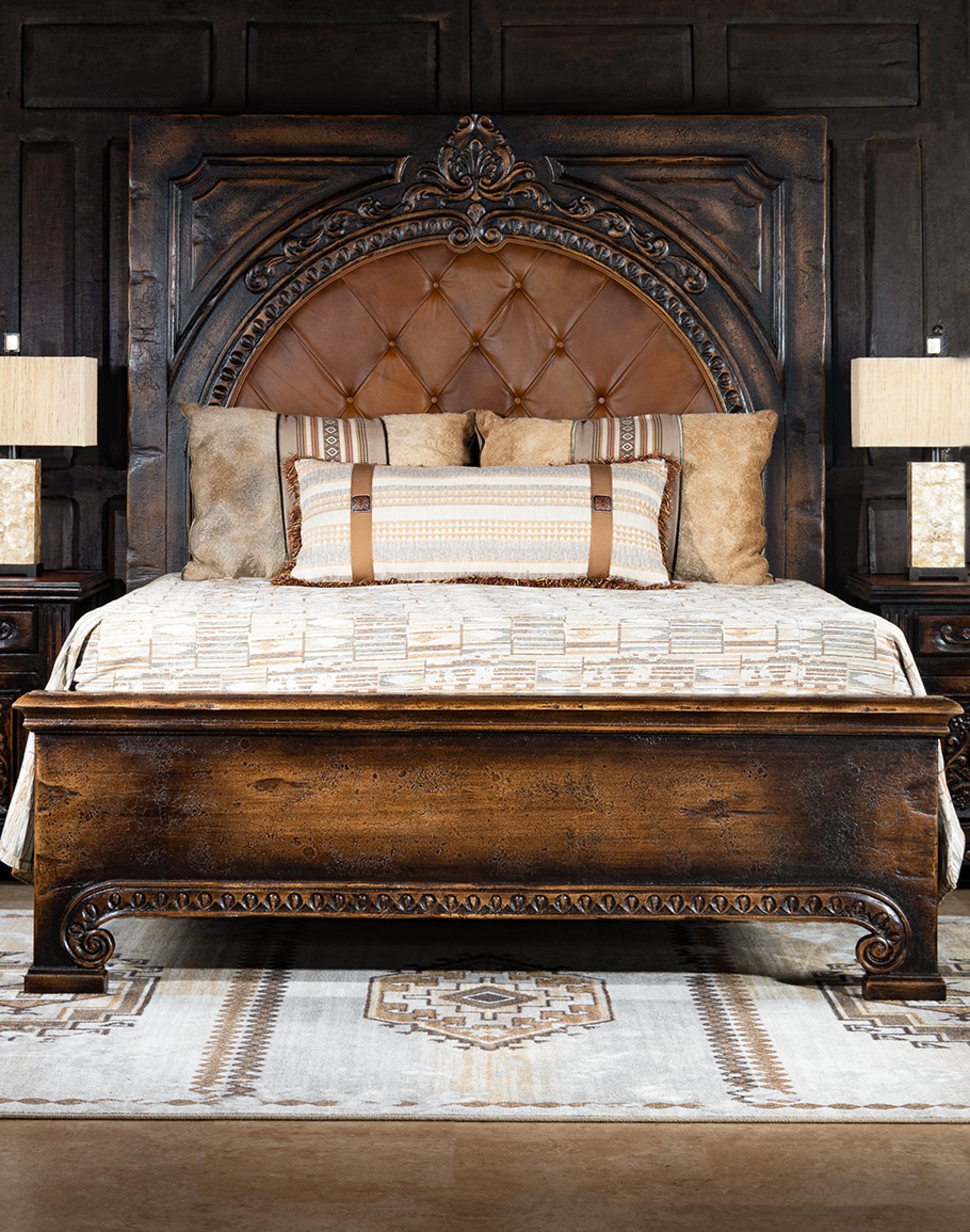 Our Catalina Bed is handcrafted by artisans in Peru, giving it authentic appeal and bold beauty. This luxurious bed is made from a tropical hardwood called Mohena. It is accented with elegant carvings and a button-tufted headboard that gives the bed a distinctive look and feel. This combination of materials brings an Old-World, Spanish look and feel into virtually any room, coupled with a durability that will stand the test of time. The Catalina Bed is dark, elegant, and unique. The woodwork on the bed's support legs and headboard evoke images of Gothic chapels and Spanish Colonial haciendas. The Catalina Bed indicates the best materials and craftsmanship, forming a beautiful and singular piece of furniture. It’s the perfect addition to any Eclectic Ranch, Classic Ranch, southwest, or Spanish-style bedroom! At Adobe Interiors, we create the furniture, and you create the memories.