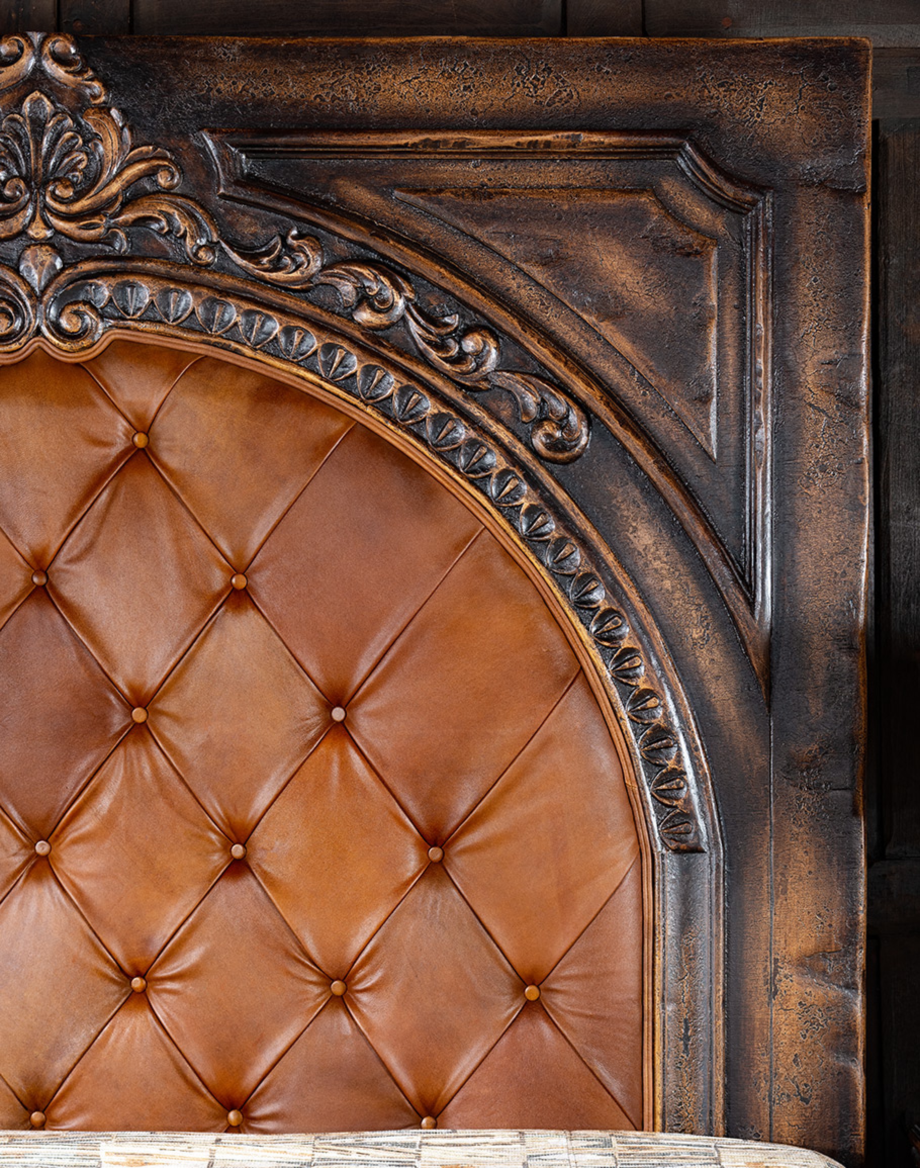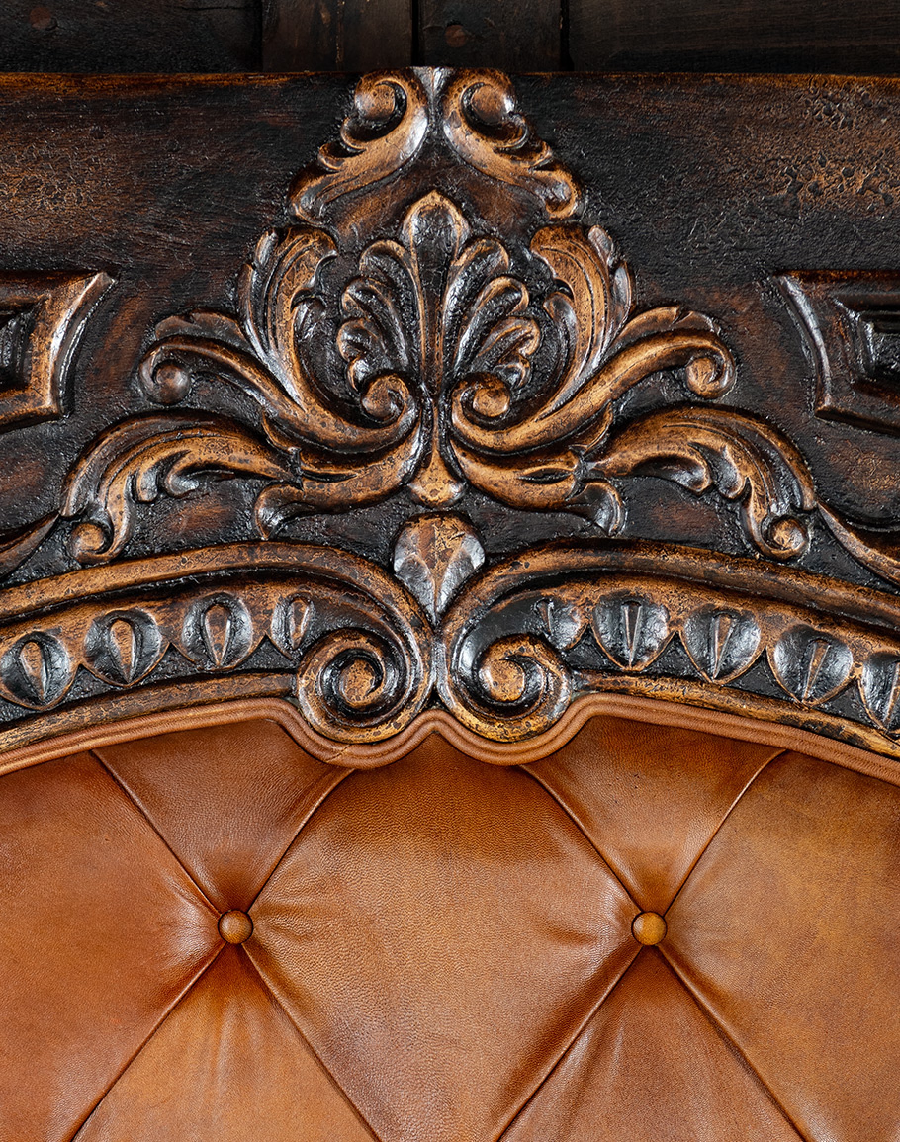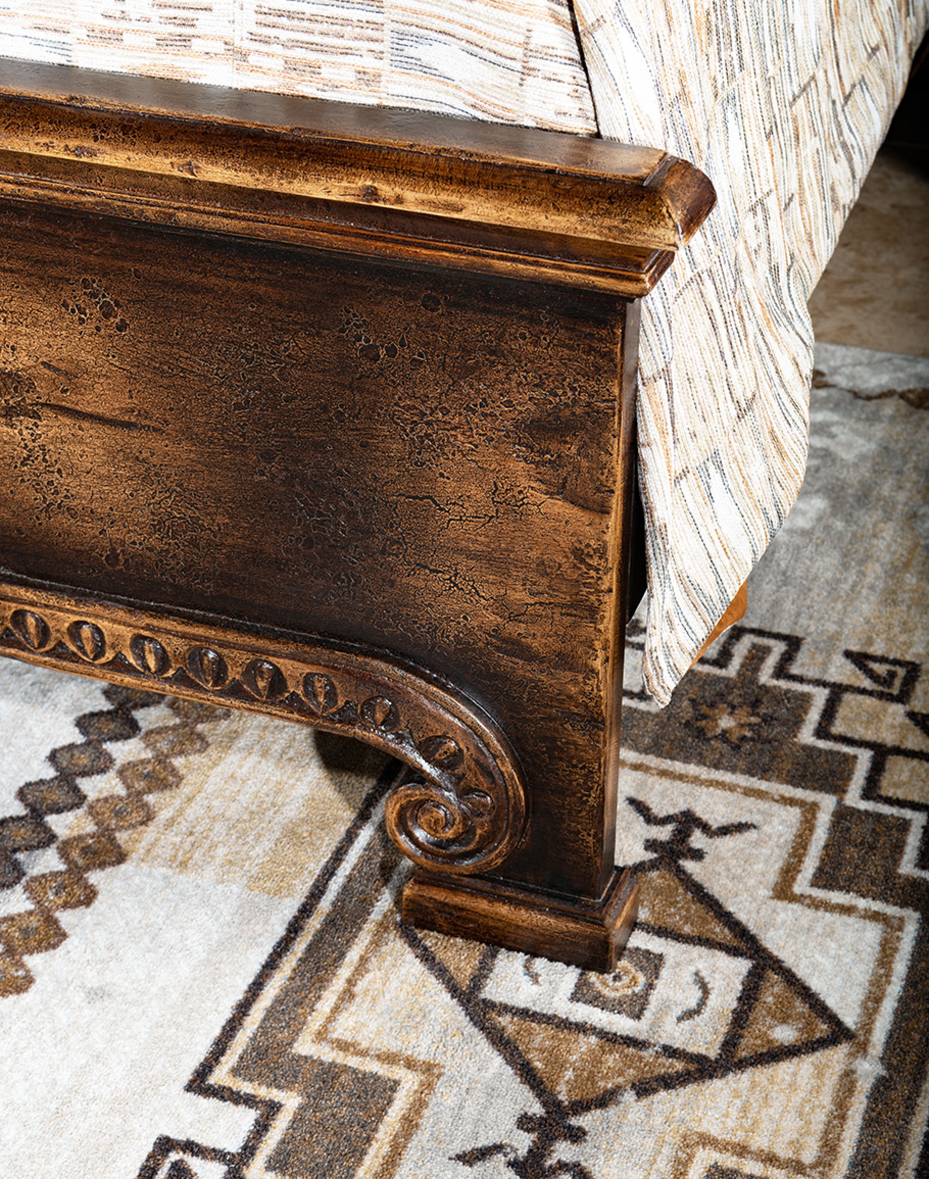 Our Catalina Bed is handcrafted by artisans in Peru, giving it authentic appeal and bold beauty. This luxurious bed is made from a tropical hardwood called Mohena. It is accented with elegant carvings and a button-tufted headboard that gives the bed a distinctive look and feel. This combination of materials brings an Old-World, Spanish look and feel into virtually any room, coupled with a durability that will stand the test of time. The Catalina Bed is dark, elegant, and unique. The woodwork on the bed's support legs and headboard evoke images of Gothic chapels and Spanish Colonial haciendas. The Catalina Bed indicates the best materials and craftsmanship, forming a beautiful and singular piece of furniture. It’s the perfect addition to any Eclectic Ranch, Classic Ranch, southwest, or Spanish-style bedroom! At Adobe Interiors, we create the furniture, and you create the memories.