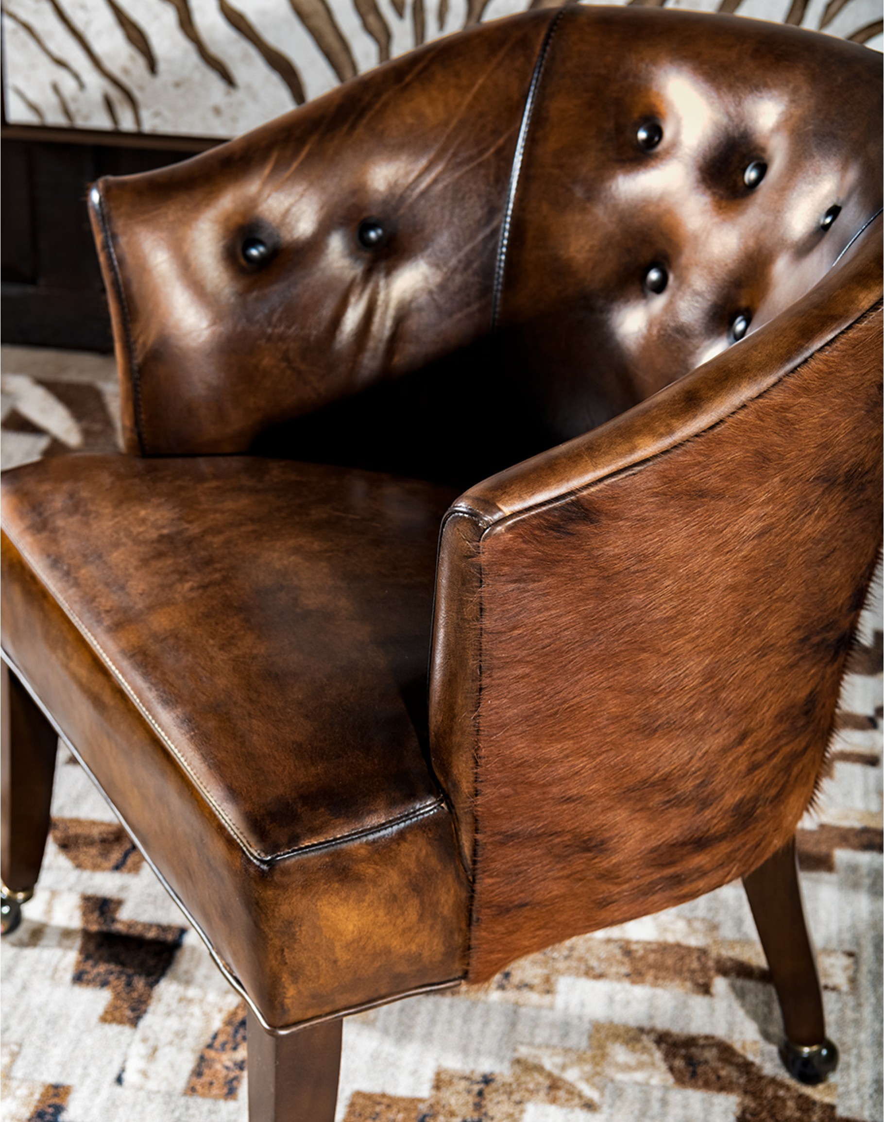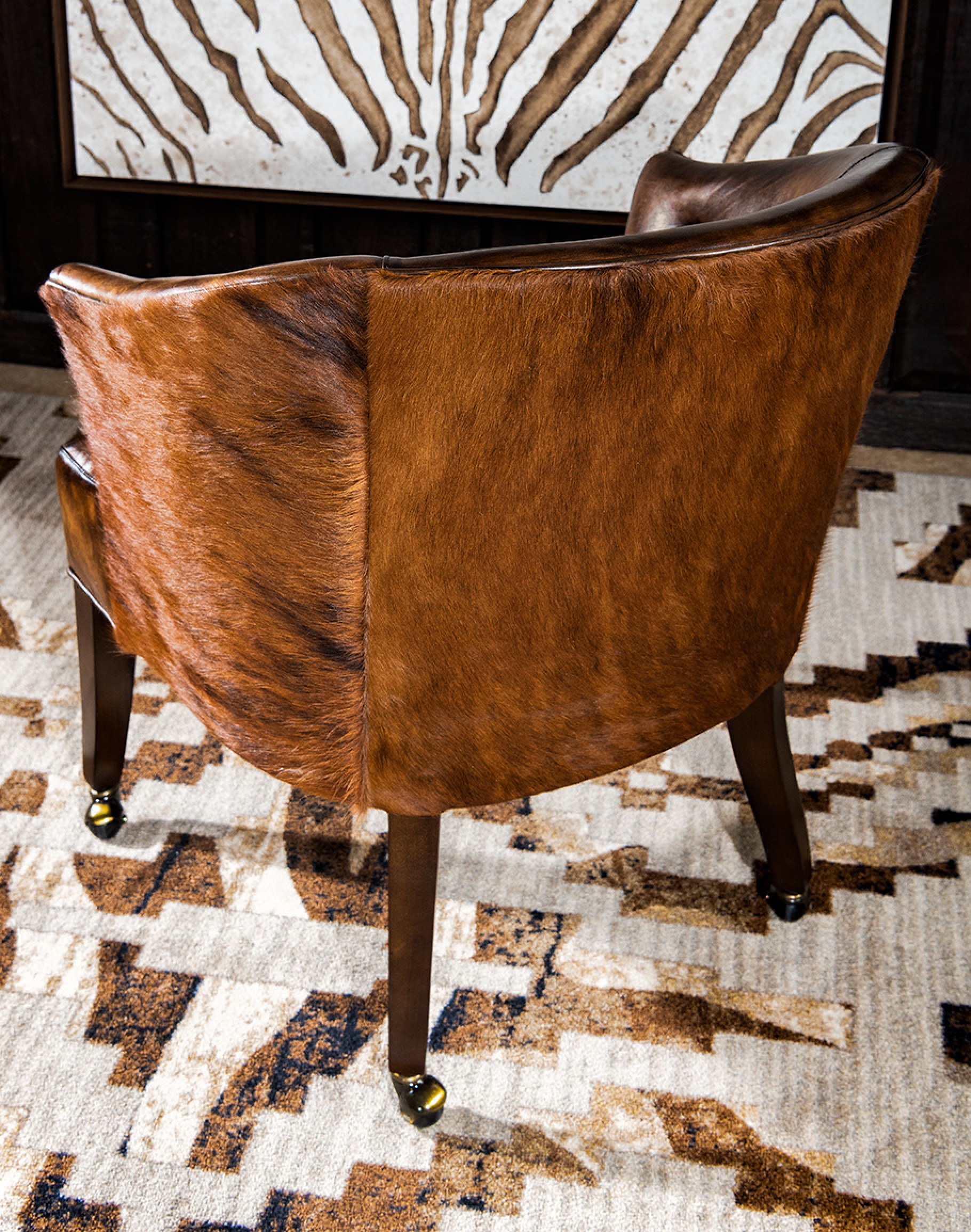 Our Cattlebaron Caster Chair is not only good looking but very versatile. This fine western style chair can be used as a game chair, office chair, dining chair, or accent chair. Using premium, upholstery grade brindle cowhide with our signature hand burnished leather, this is one classy chair! Brass casters with a solid hardwood frame, 8 way hand tied construction and 100% American Made to the highest standards of quality and craftsmanship!