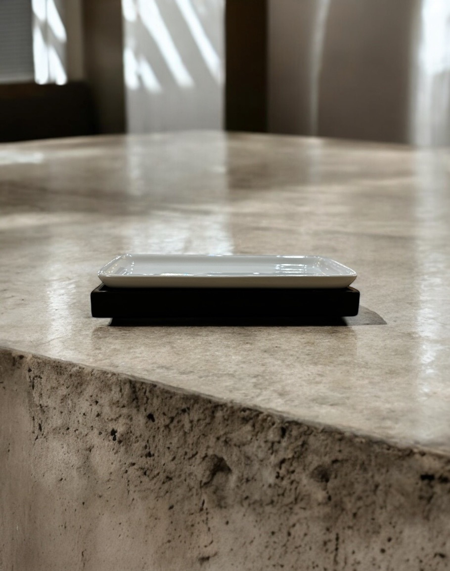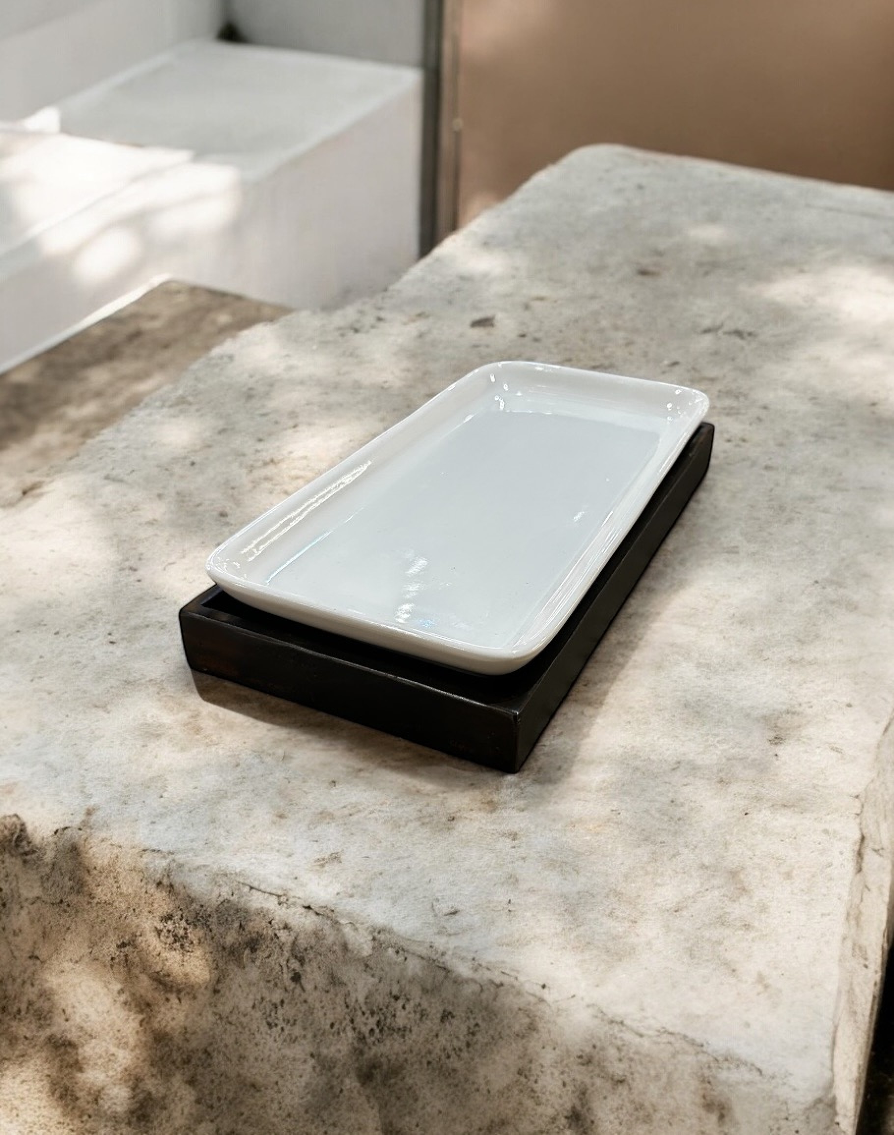 Branded, sealed small rectangular ceramic platter in iron base