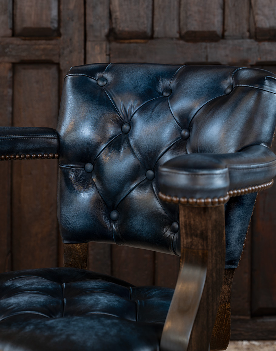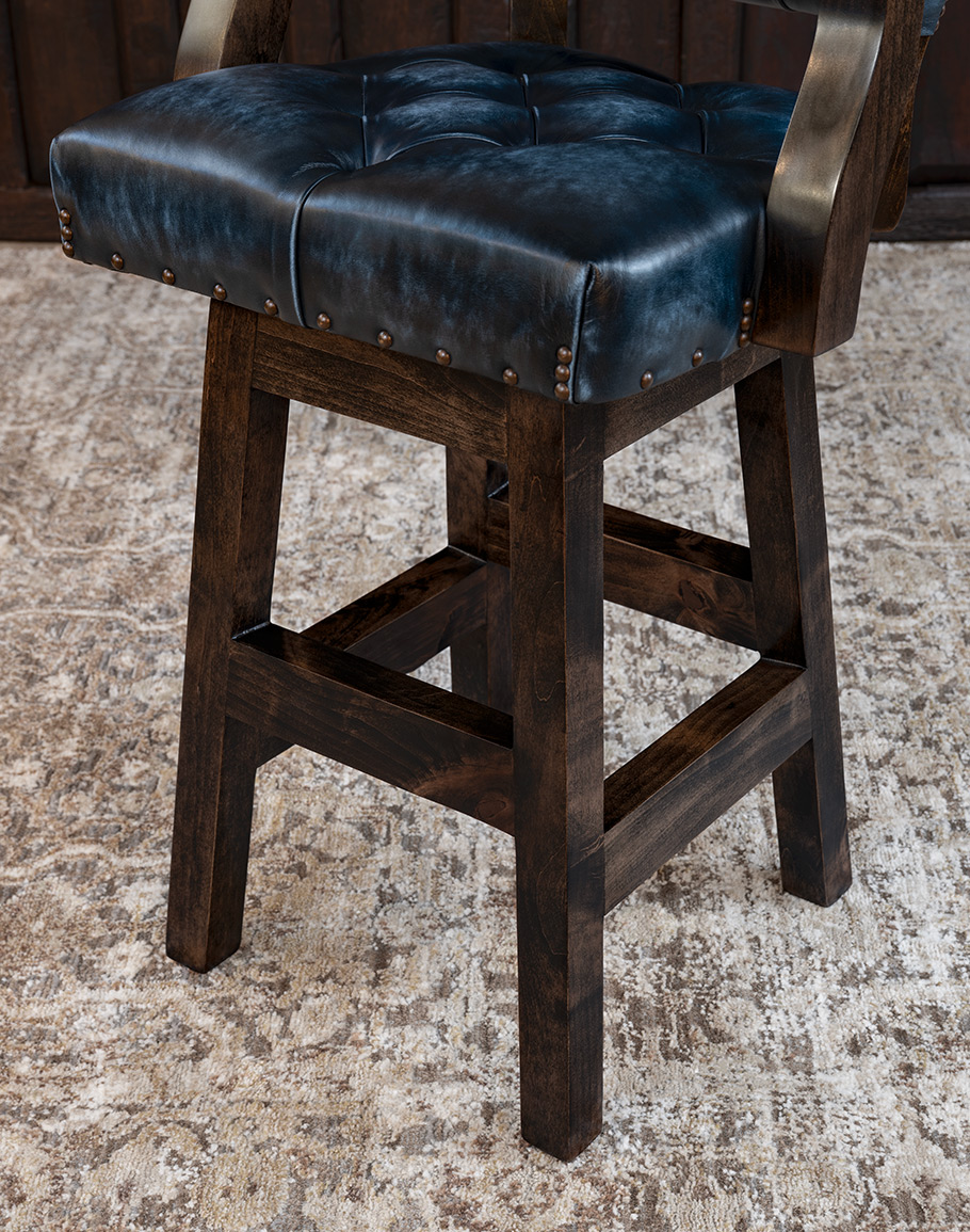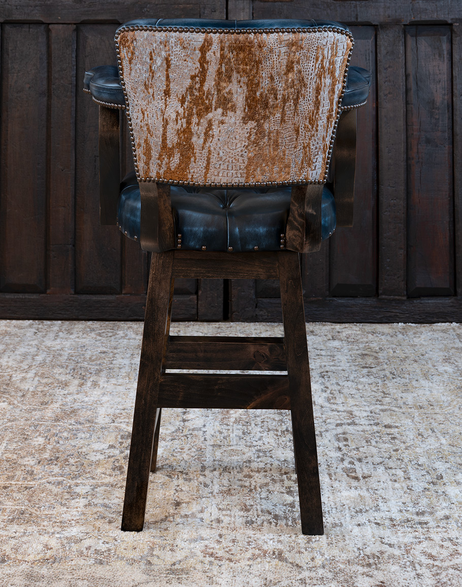 Introducing the Chisum Bandera Barstool, proudly 100% American-made from solid alder wood and top grain blue leather. This barstool features a 360-degree swivel for convenience, elegant button tufting on the seat and back, and padded arms for extra comfort. The unique brindle cowhide back with a stamped croc pattern adds a distinctive touch and is a star in the Classic Ranch design. Available in both bar and counter heights, this tufted blue leather barstool blends luxury and durability perfectly. This exquisite piece of furniture is designed to impress and endure through the years. Experience the blend of tradition, quality, and design. At Adobe Interiors, we create the furniture, and you create the memories