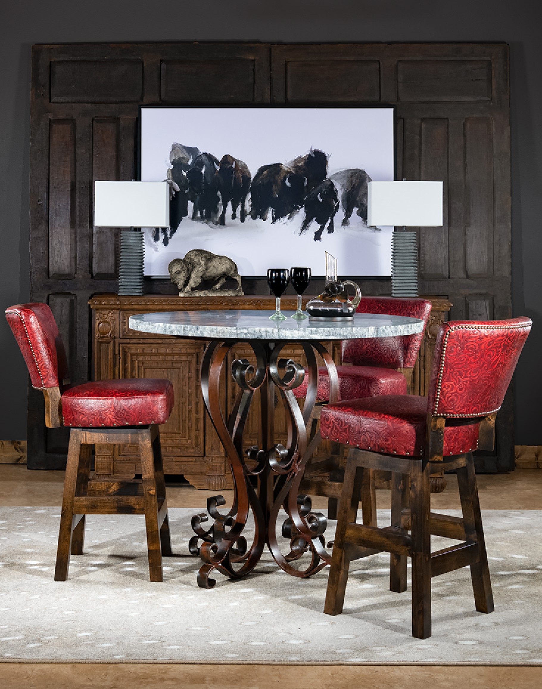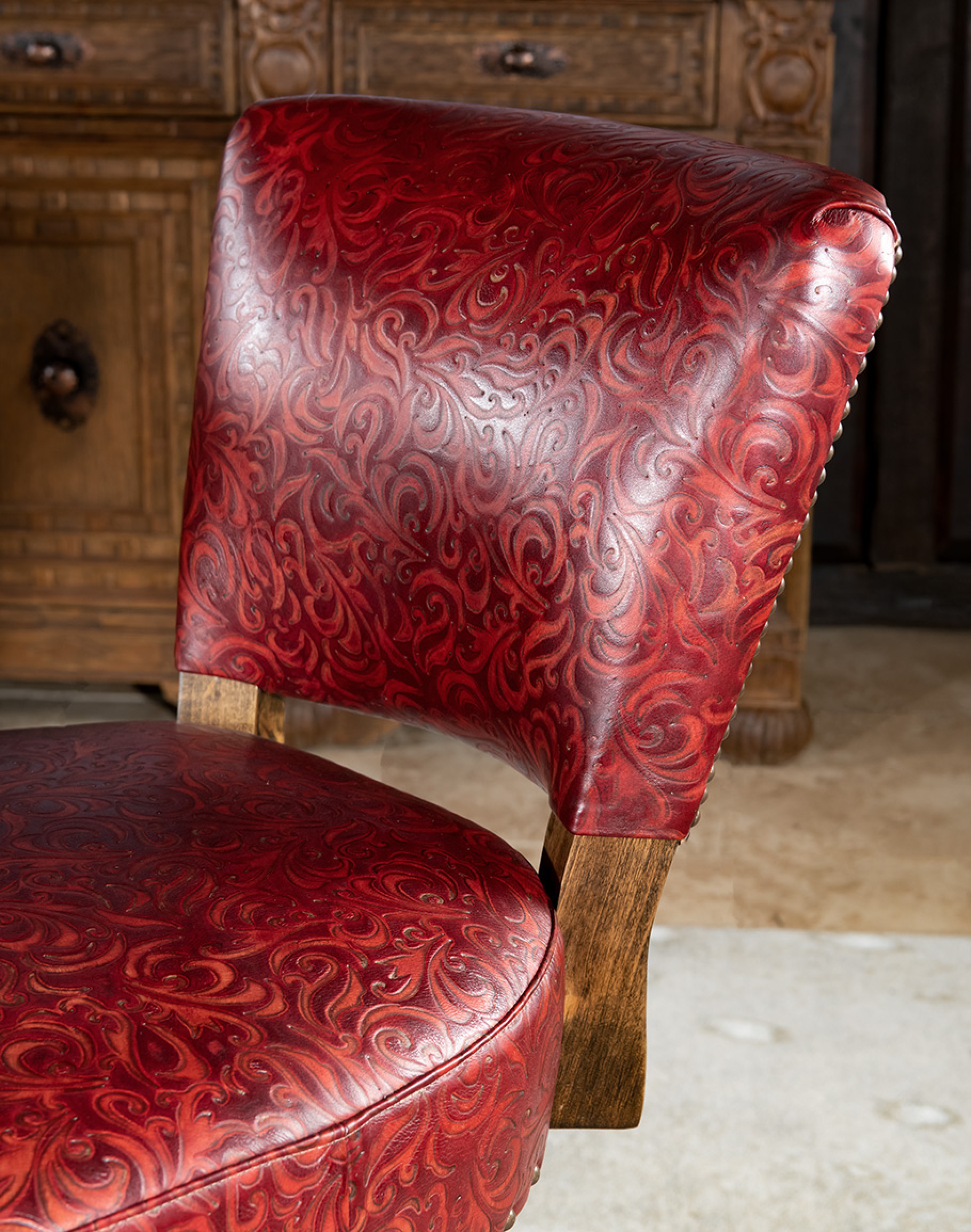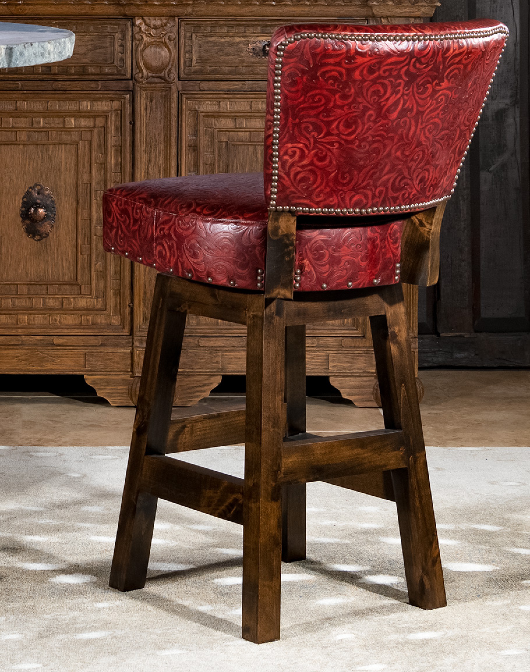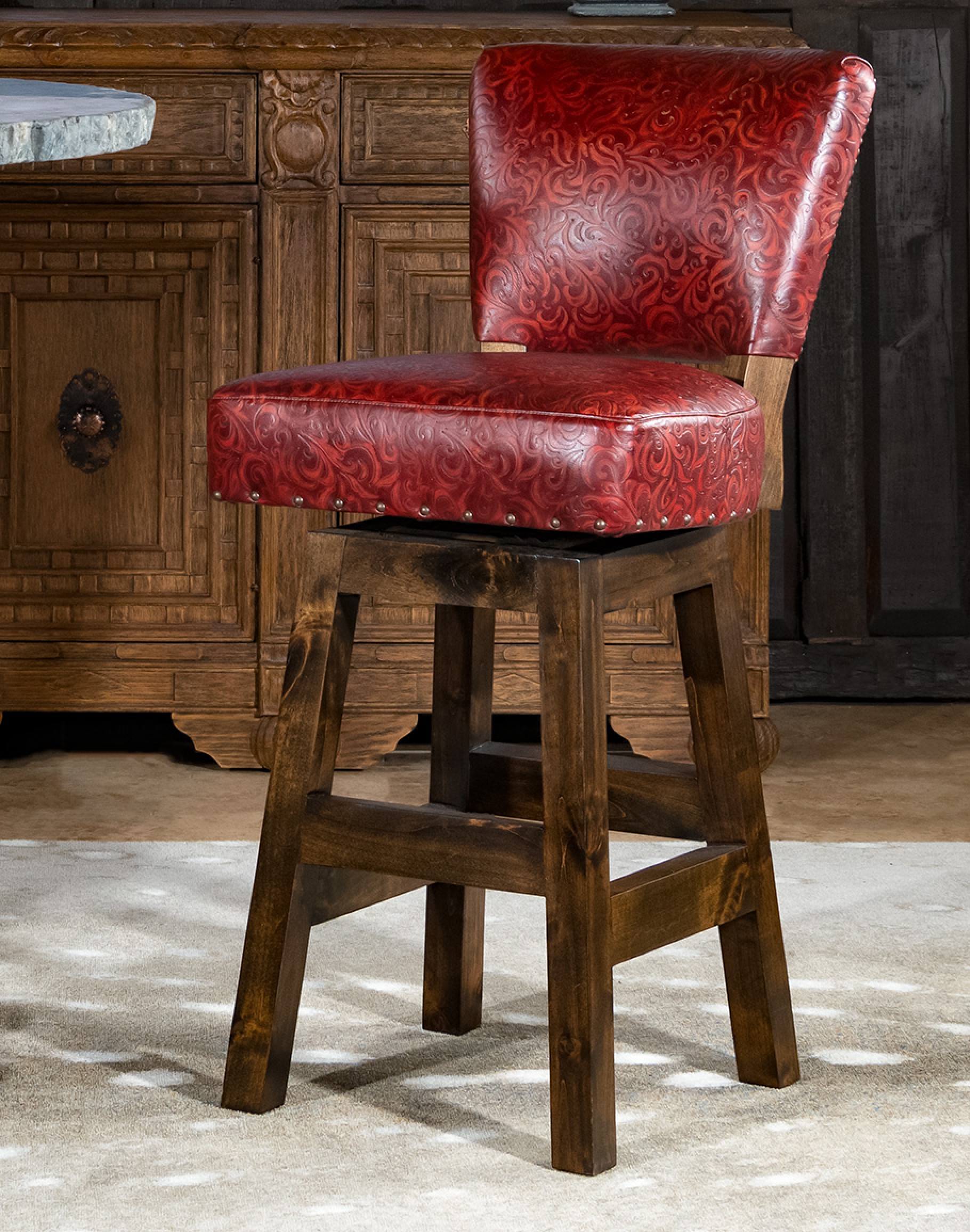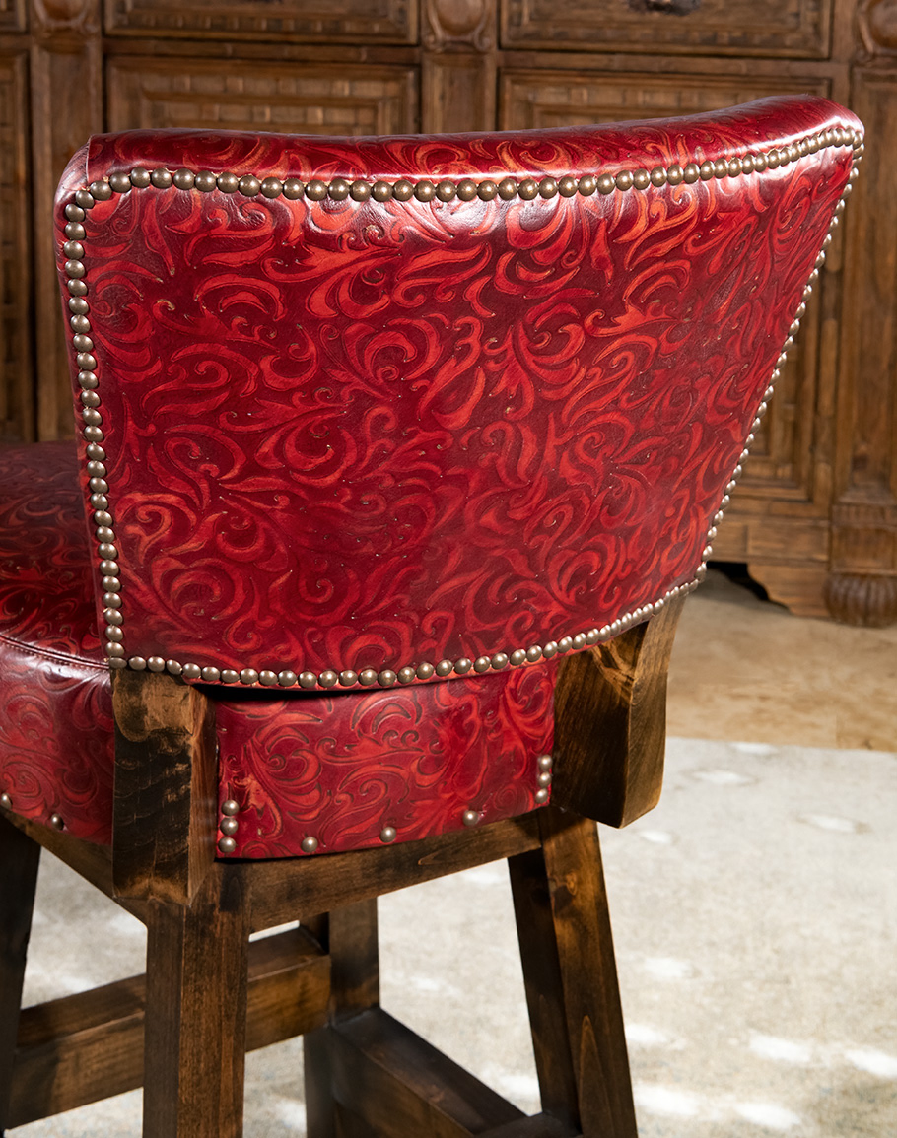 Our Chisum Bolero Armless Barstool brings a classy pop of red into your dining or entertaining space. Featuring a luxuriously soft, hand stamped and died red leather. This fine red leather barstool will bring a timeless dynamic into your dining or entertain space. A full 360 degree ball bearing swivel mechanism and a solid alder wood frame gives this fine leather barstool incredible durability. 100% American made to the highest standards of quality and craftsmanship!