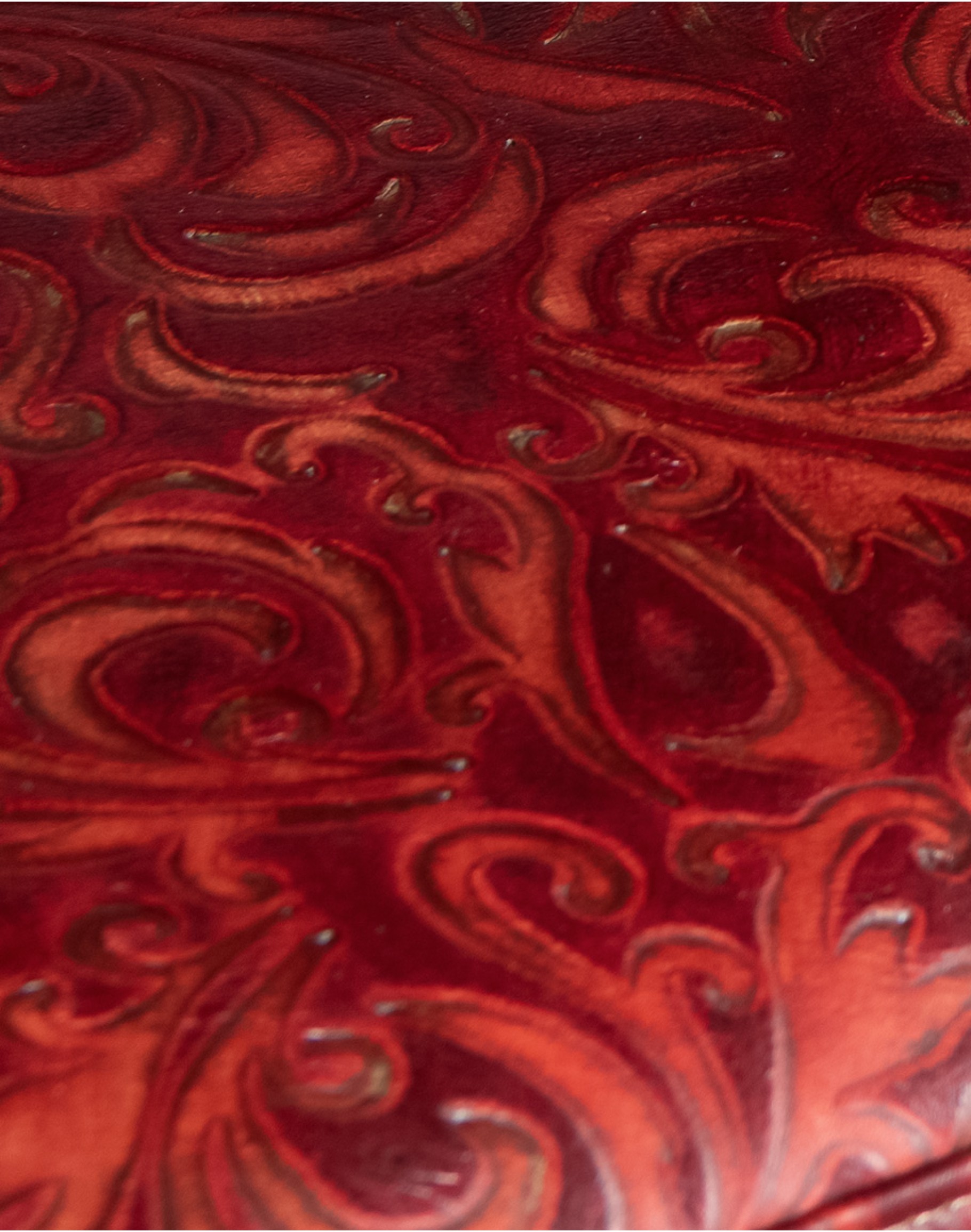 Stamped Leather Description: Dyes and waxes are hand applied to South American raw material to impart a transparent clarity. This coupled with substrate gives the leather a sophisticated, pebble grain appearance. All of the aniline dyes and stamping applied to the hides are hand done in North Carolina by skilled artisans drawing from years of creative experience creating an impressive patina. The absence of pigments adds to the natural softness of the hides. A light protective top, utilizing a proprietary formulation developed by the tannery creates the exquisite touch this leather is known for and makes the leather suitable for active family homes. Because of the depth and transparency of this leather, natural markings will be exposed and should not be confused as defects or deficiencies, but appreciated as Nature's Autograph of Authenticity found in the finest full grain leathers.