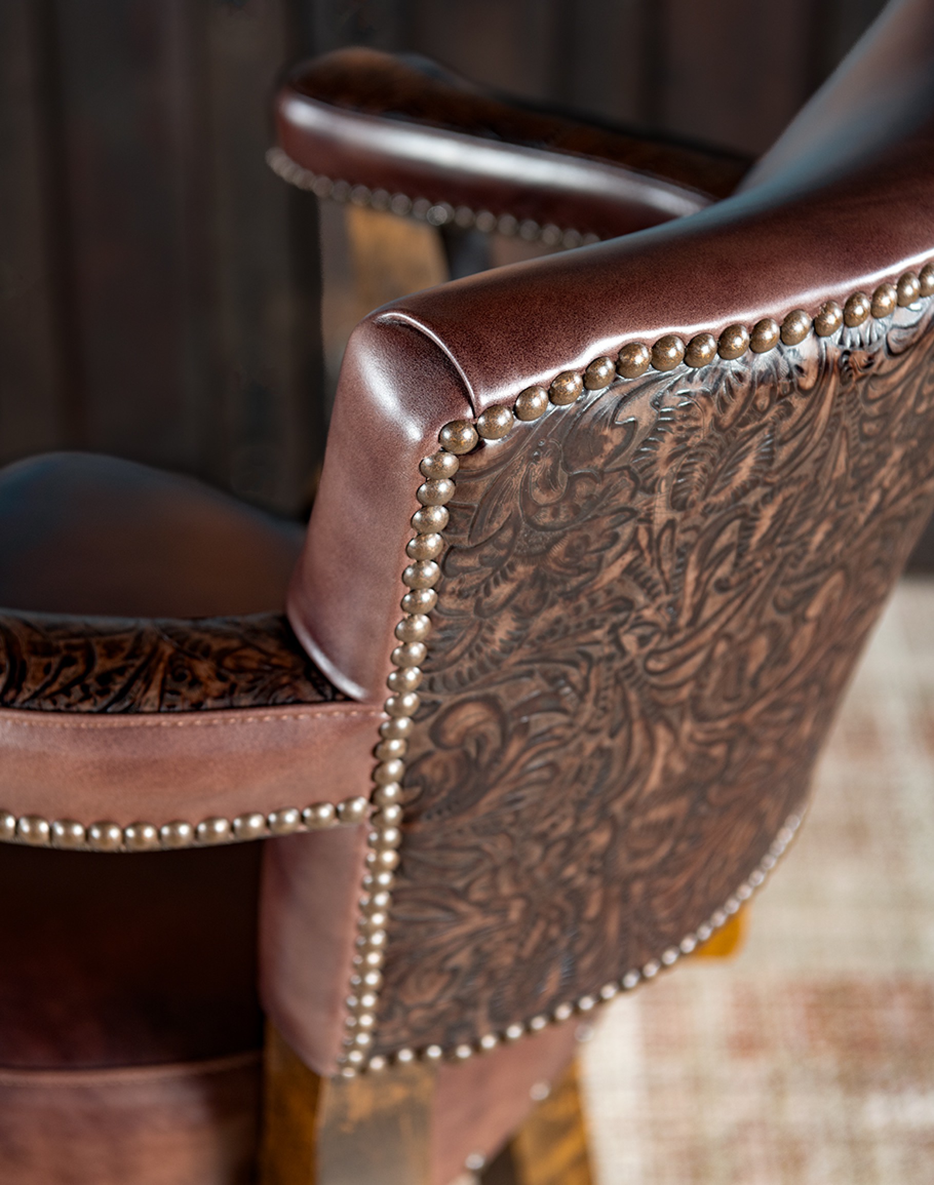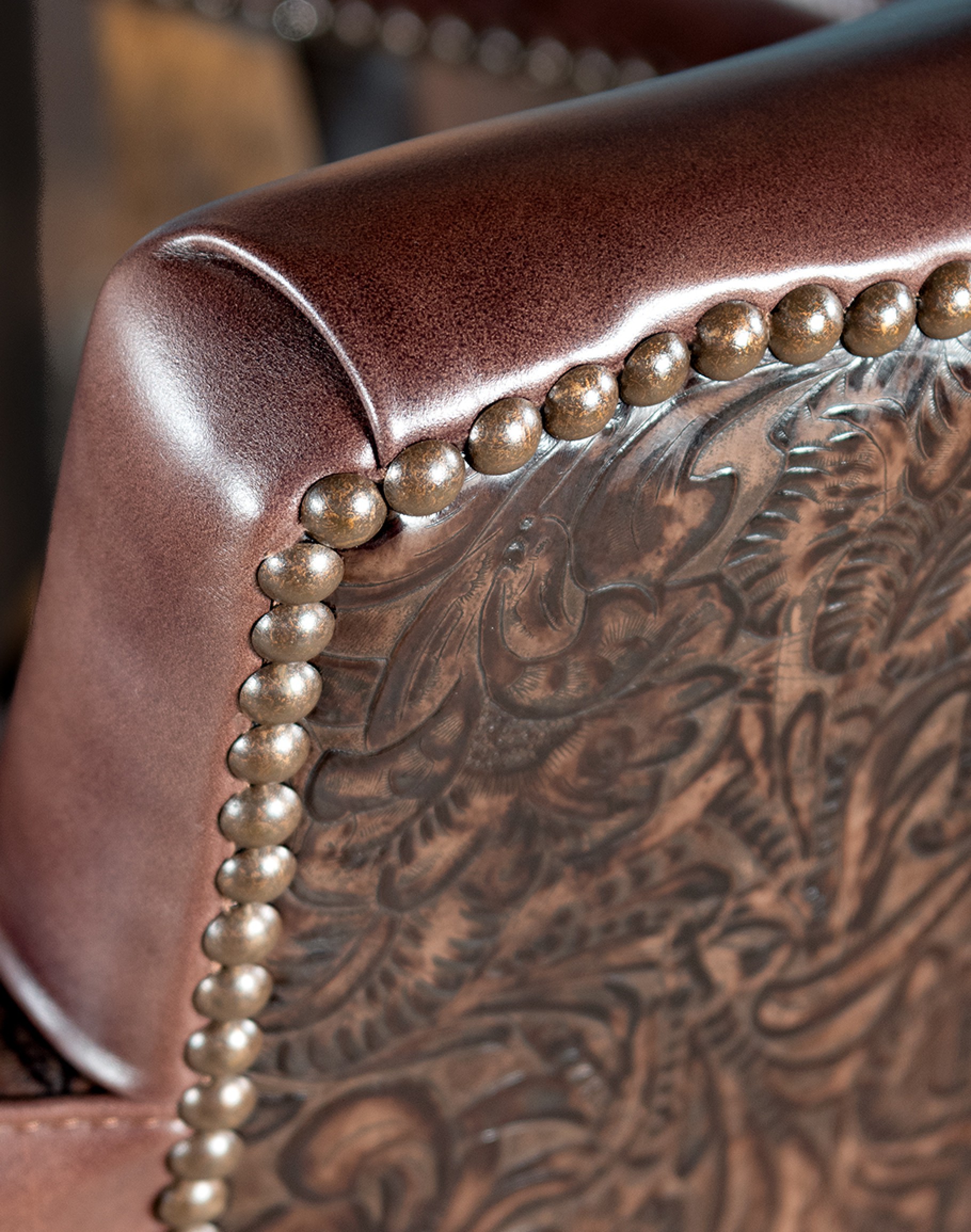Embossed Leather Description: The leather hide is first embossed with a western floral pattern and then colored by applying two base color coats of micro pigments. The leather is then wiped-off to give it a contrast of colors utilizing the base color combination. This color contrast is further accented by two additional top coat colors that are wiped-on by hand to give the leather a beautiful antique look. The last step is to slightly protect the hand work of the leather hide with a lacquer topcoat that provides great depth and warmth to the finished product.