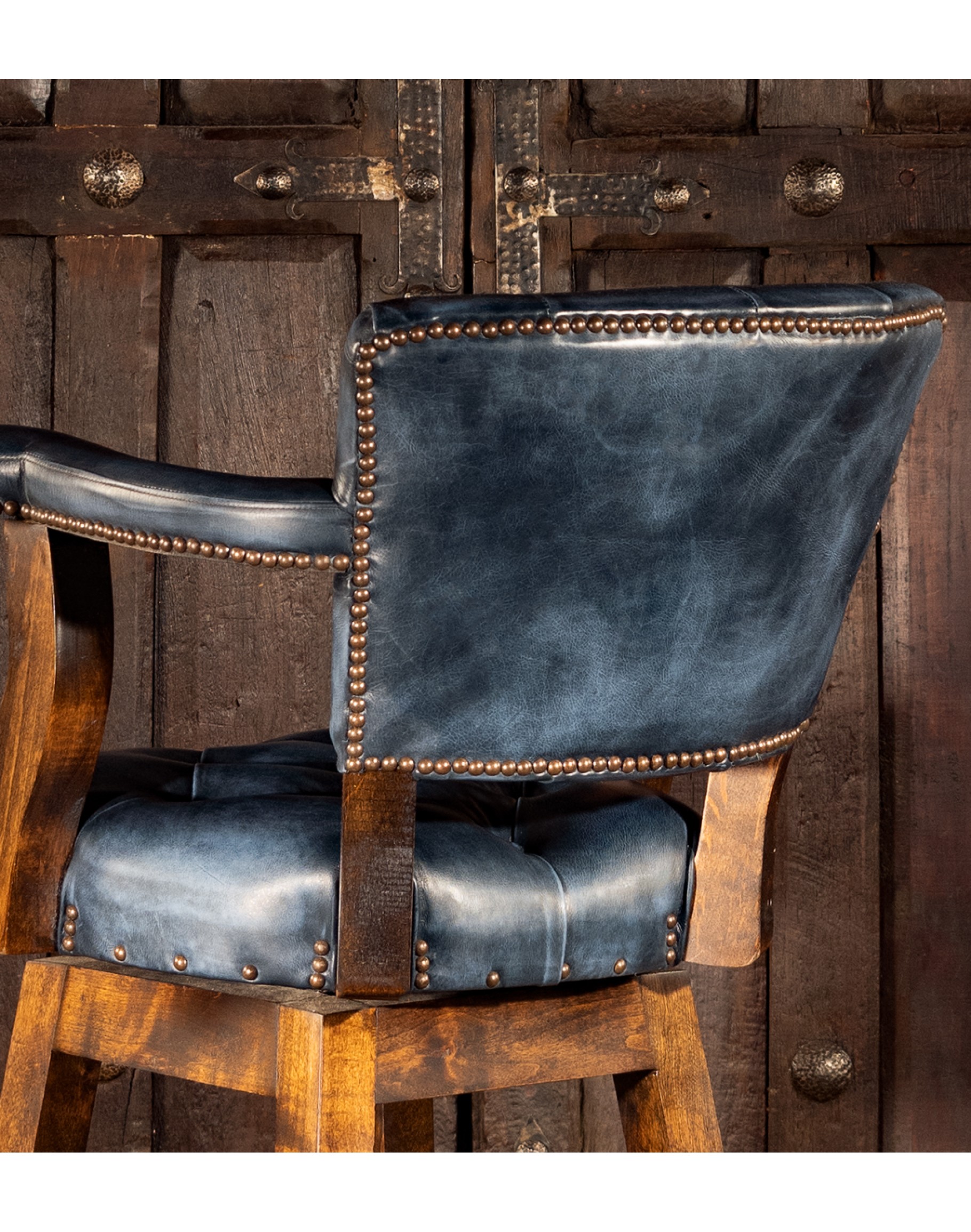 The Chisum Indigo Barstool is stunning, not only for its solid hardwood framing but mainly for its subtle blue hand-burnished leather, giving a high Classic Ranch style and impact! Crafted to be either bar or counter height, this fine barstool will make a statement in any home, dining room, or living area. Take a bit of the ranch to the coast and define your Coastal Ranch style with this beauty. Brass-studded accents and the worn, comforting feel of the leather give the perfect motif for this accent piece. The armrests' gentle curve allows you to mold perfectly into the seat's comfort while being supported on the barstool bases; all handcrafted from Knotty Alder.