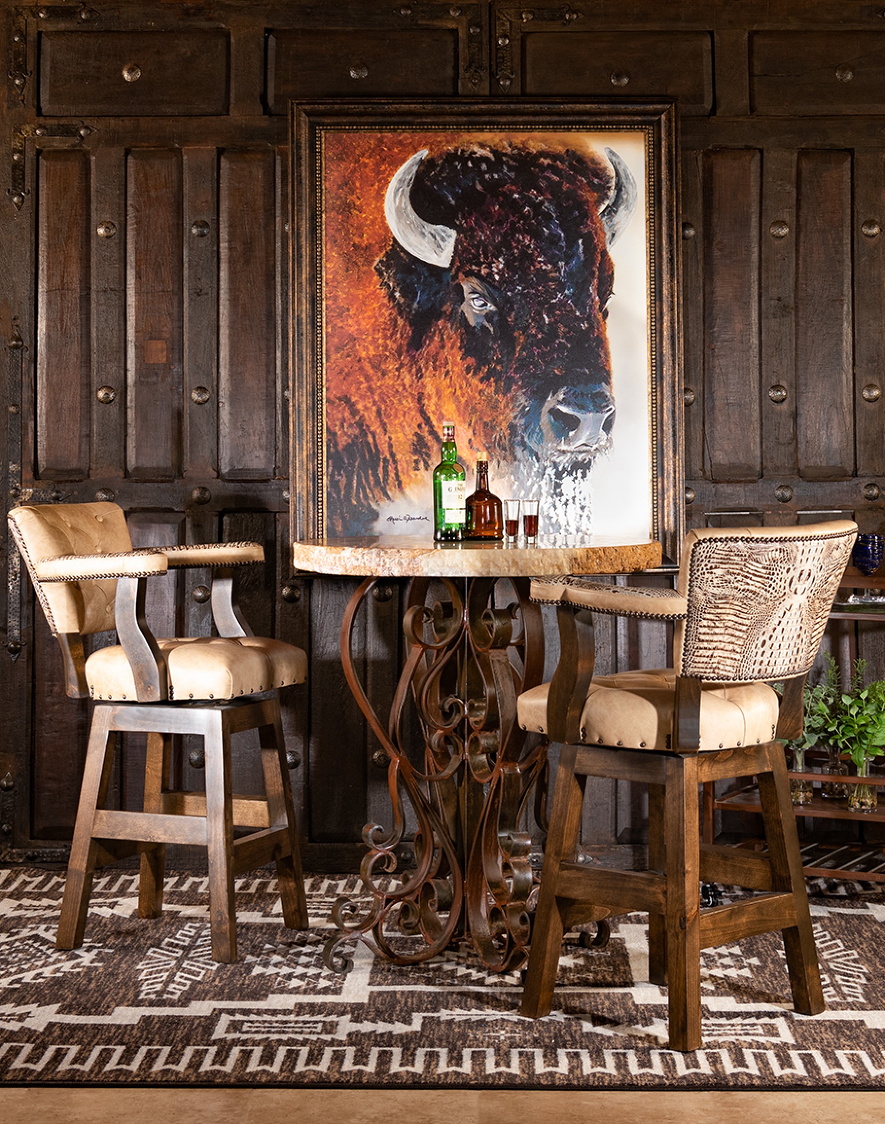 The Chisum Chaps Western Leather Swivel Barstool embodies the perfect balance of rugged Western character and refined craftsmanship. 100% American mad..