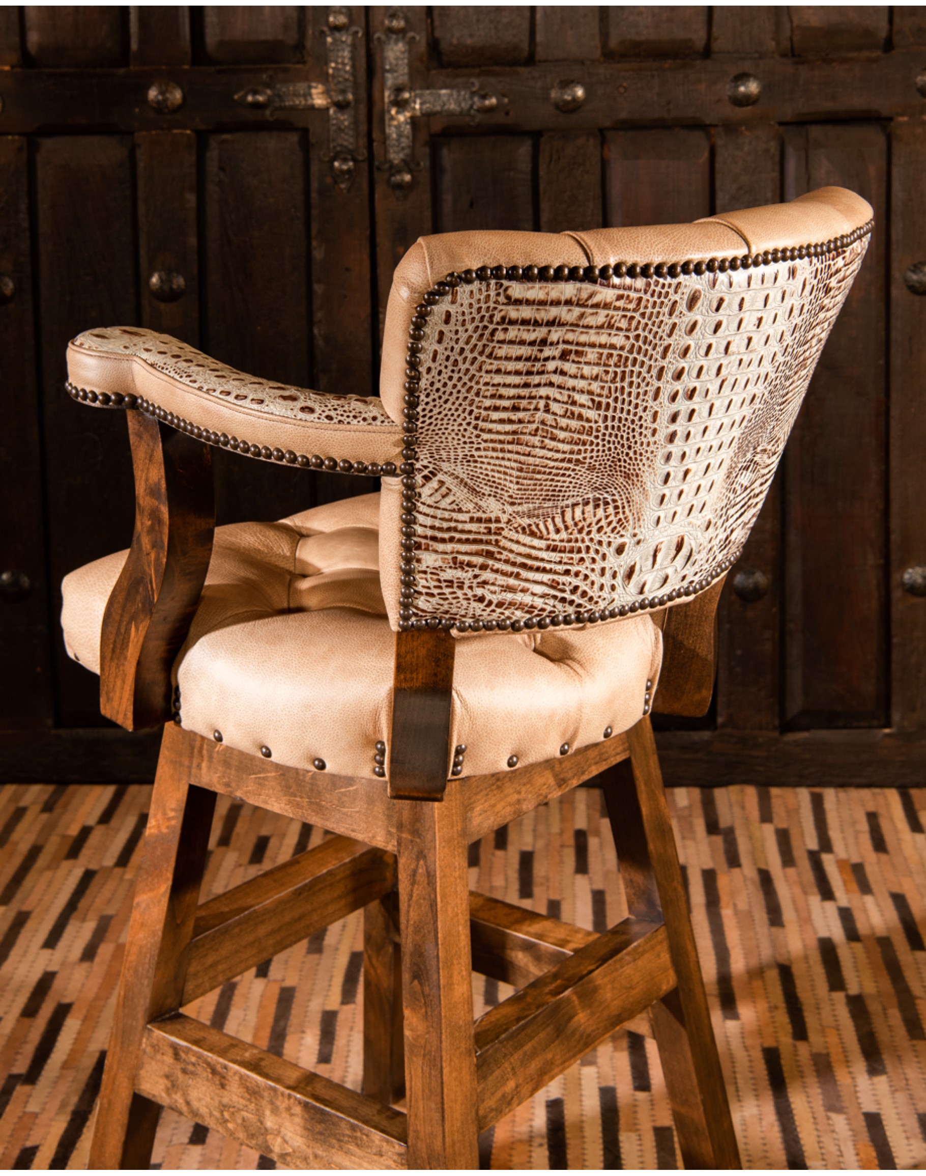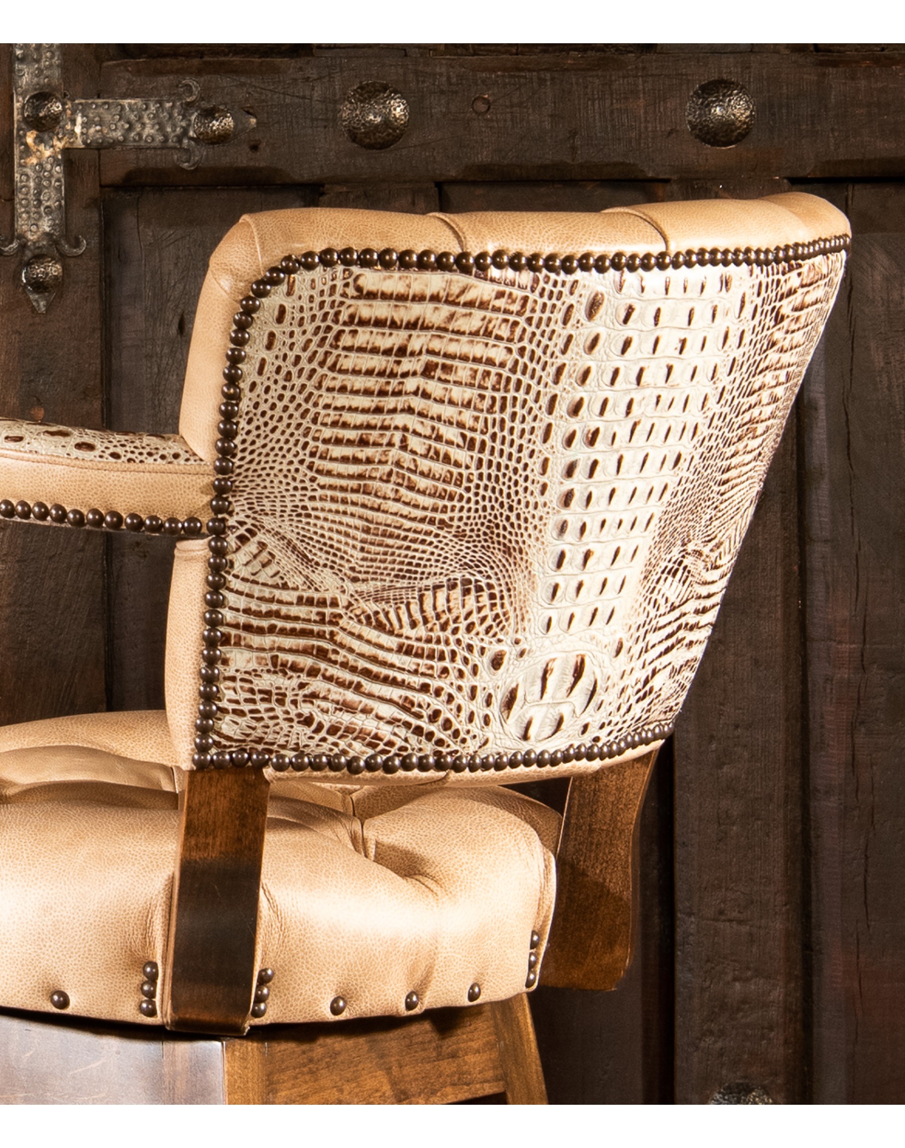 Looking for a barstool that is as impeccably made as it is aesthetically fabulous? If so, you need look no further than the Chisum Ivory Barstool. Intended for the sophisticated yet adventurous collector, this piece will elevate any space you put it in. This upscale barstool features a lush, full-grain leather with genuine embossed croc on the arms and back. Our signature solid hardwood frame and high-quality ball bearing swivel mechanism means this piece isn't just nice to look at it —it’s also a pleasure to use for hours on end. The premium high-density foam cushion core is the cherry on top of this luxurious Western barstool. The Chisum Ivory Barstool is 100% Texas made, so you know you will be getting a high-quality piece that you can count on for years to come. Add a full set to your bar space today.