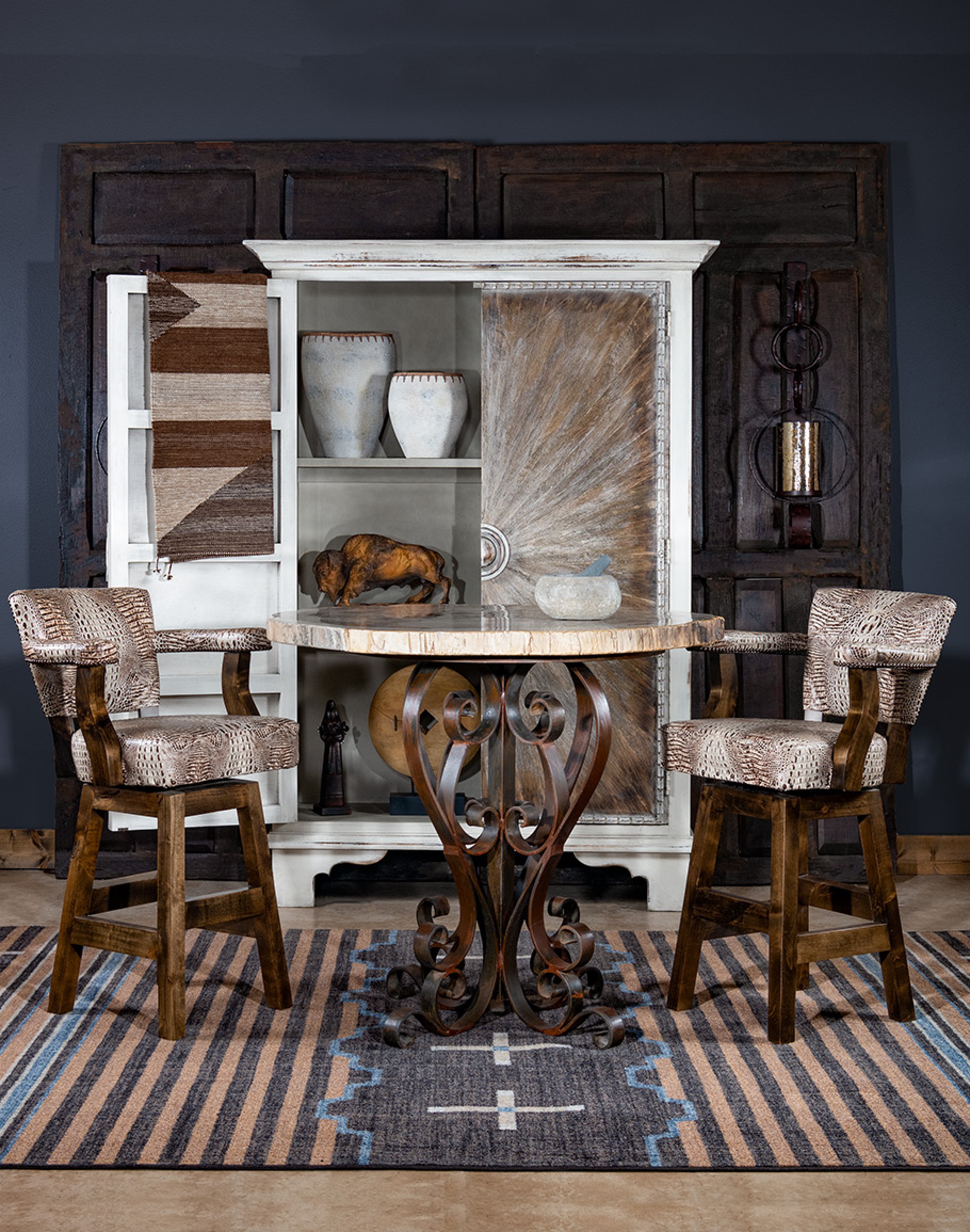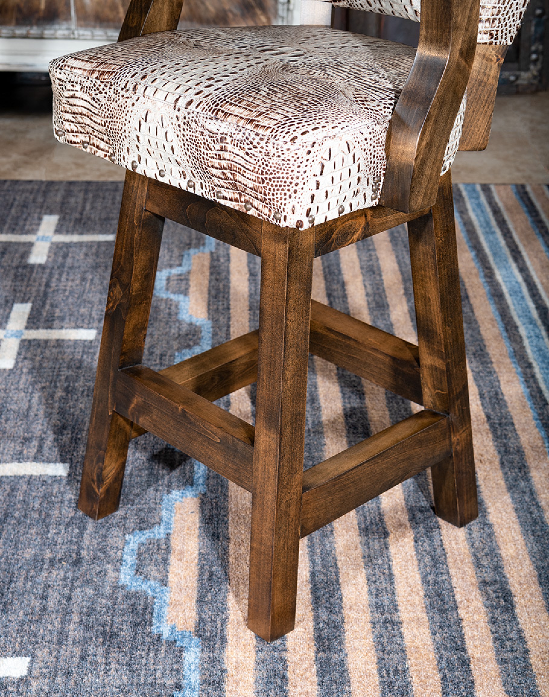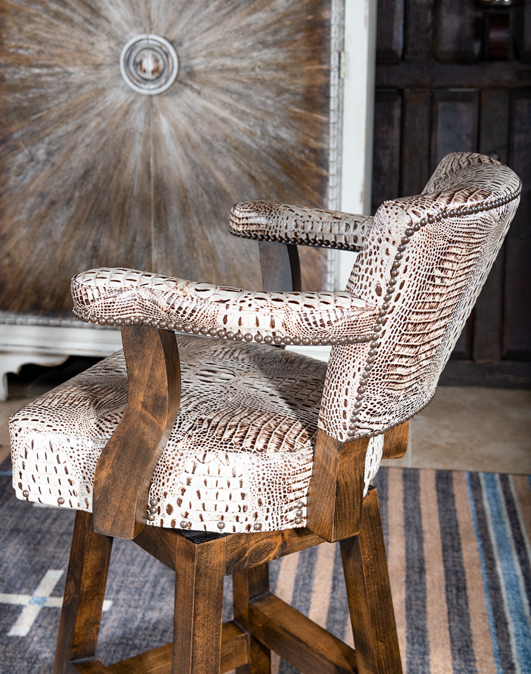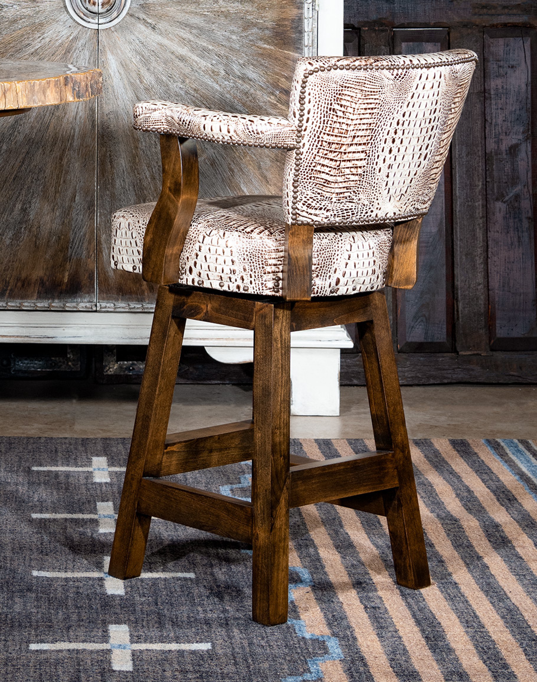 The Chisum Ivory Croc Barstool is 100% Texas-made, so you will get a high-quality piece you can count on for years. Experience the blend of tradition, quality, and design. At Adobe Interiors, we create the furniture, and you create the memories.