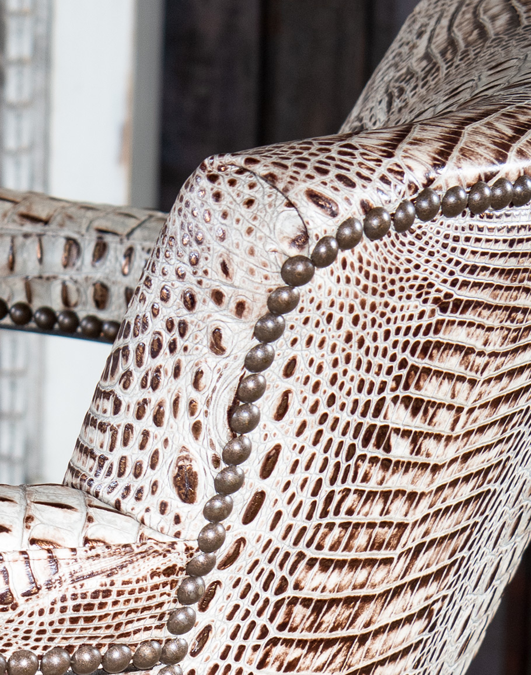Embossed Leather Description: A leather used to accent many of today's home interiors. The leather hide is first embossed with a large crocodile grain and then colored by applying two base color coats of micro pigments. The leather is then wiped-off to give it a contrast of colors utilizing the base color combination. This color contrast is further accented by two additional top coat colors that are wiped-on by hand to give the leather a beautiful antique look. The last step is to slightly protect the hand work of the leather hide with a lacquer topcoat that provides great depth and warmth to the finished product. 100% top grain cowhide leather is characterized by variations in shade, texture, color and grain. Healed marks and scars are to be expected and enhance the natural beauty of the hides. These variations should not be considered defects as they are normal and unique features of genuine 100% top grain cowhide leather.