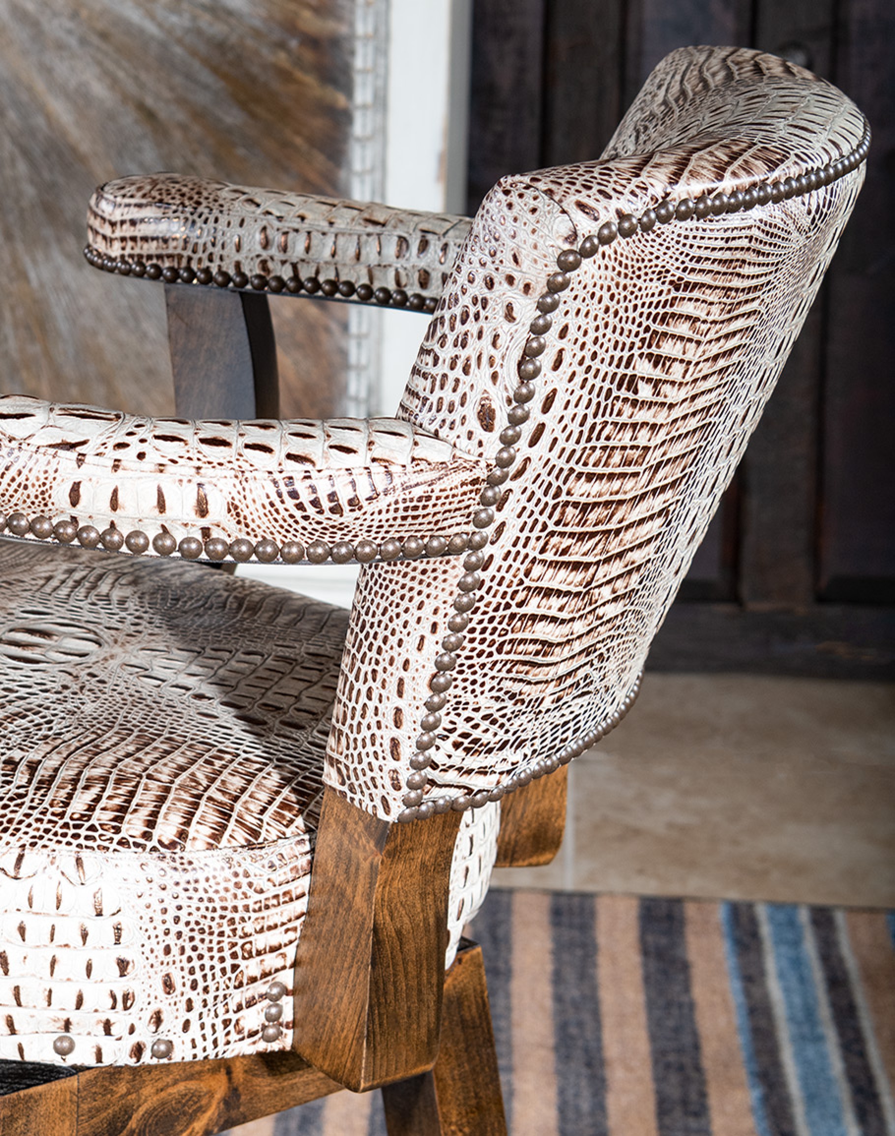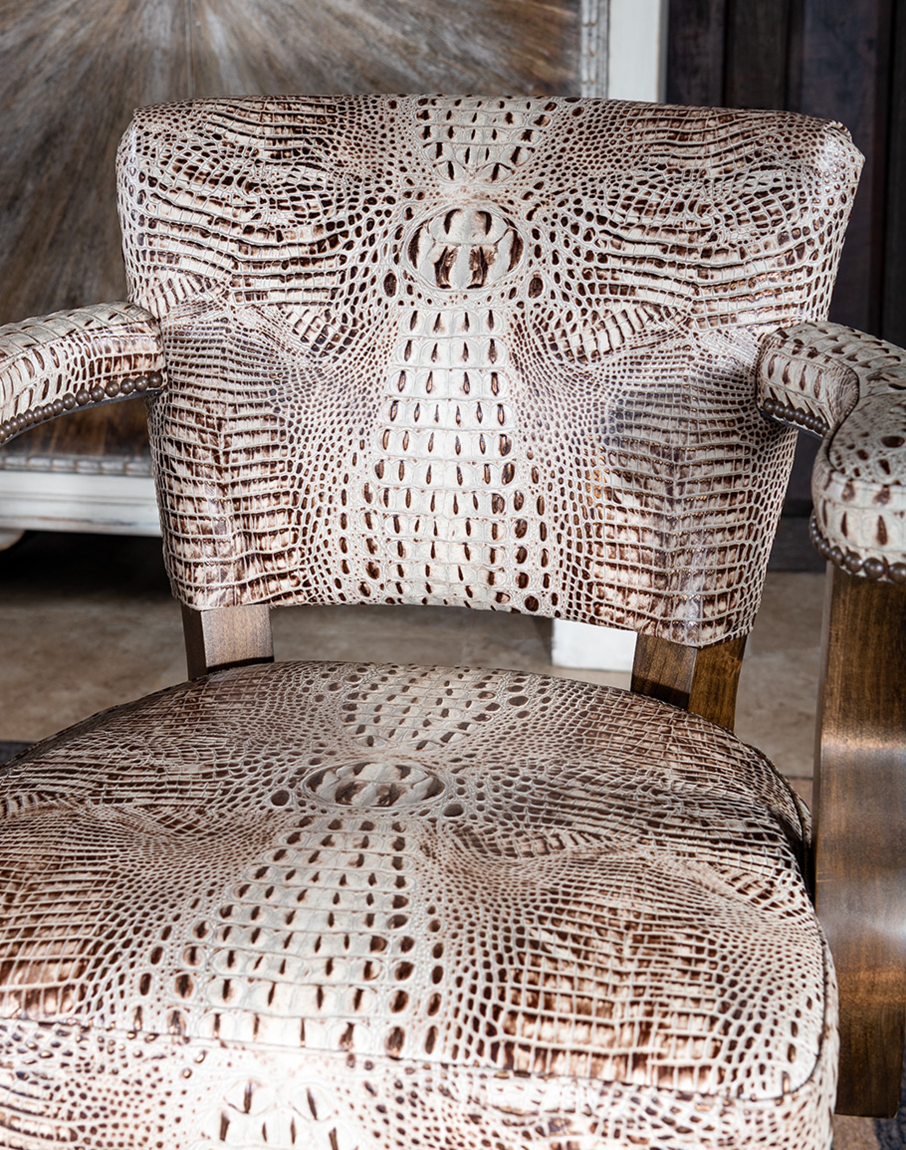 The western chic Eloise Executive Desk Chair features stamped ivory croc leather in the finest fashion. Handmade in the United States, this Classic an..