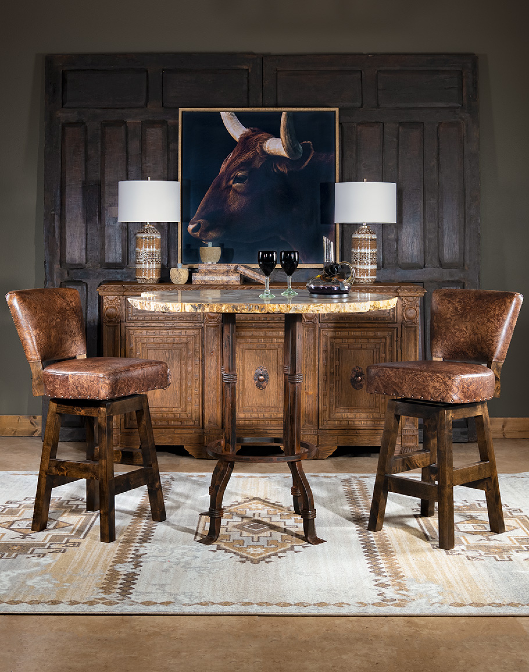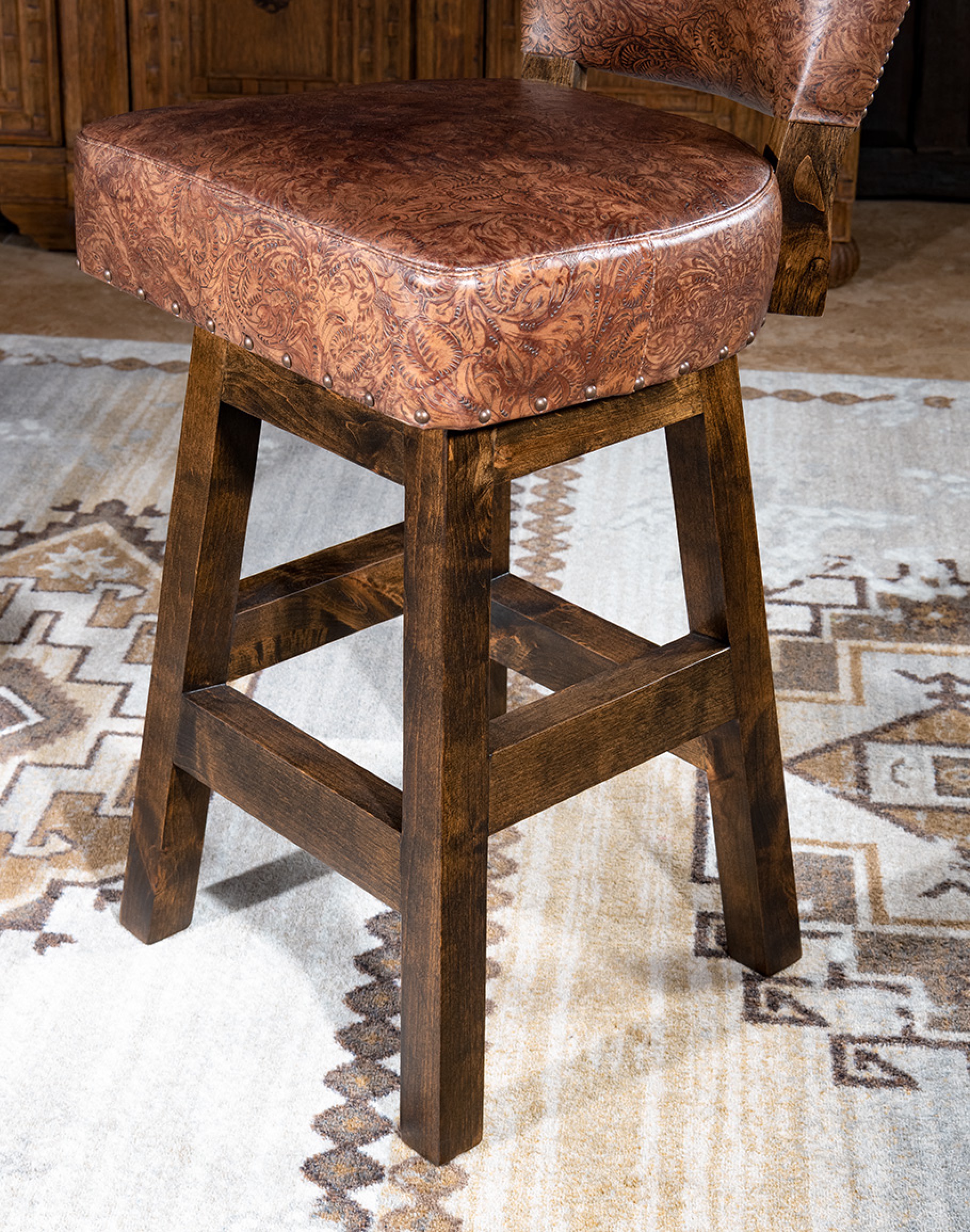 Our Chisum Kodiac Armless Barstool is a true classic! Featuring a luxuriously soft, hand stamped and died leather. This fine leather barstool will bring a timeless dynamic into your dining or entertain space. A full 360 degree ball bearing swivel mechanism and a solid alder wood frame gives this fine leather barstool incredible durability. 100% American made to the highest standards of quality and craftsmanship!