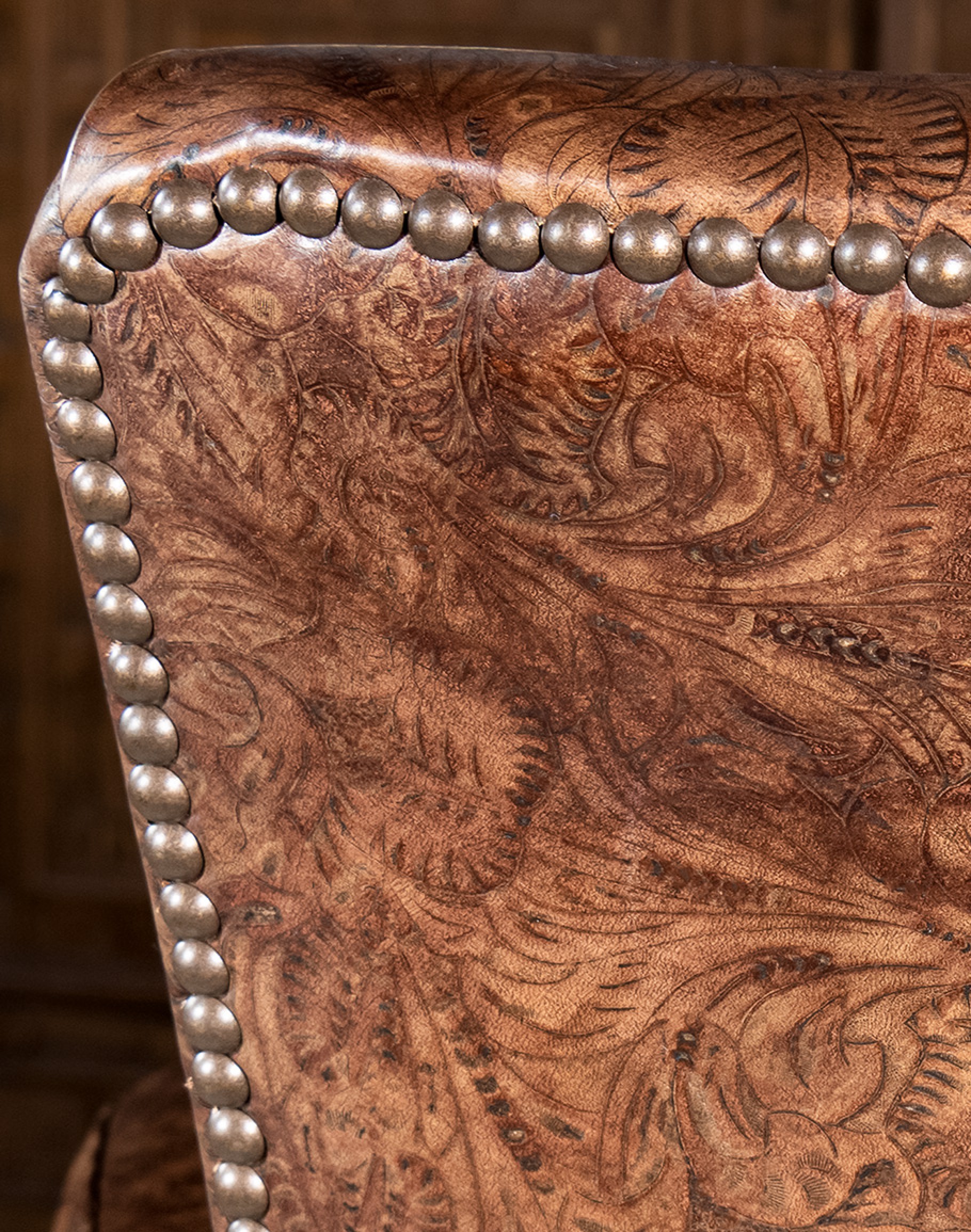 Stamped Leather Description: Dyes and waxes are hand applied to South American raw material to impart a transparent clarity. This coupled with substrate gives the leather a sophisticated, pebble grain appearance. All of the aniline dyes and stamping applied to the hides are hand done in North Carolina by skilled artisans drawing from years of creative experience creating an impressive patina. The absence of pigments adds to the natural softness of the hides. A light protective top, utilizing a proprietary formulation developed by the tannery creates the exquisite touch this leather is known for and makes the leather suitable for active family homes. Because of the depth and transparency of this leather, natural markings will be exposed and should not be confused as defects or deficiencies, but appreciated as Nature's Autograph of Authenticity found in the finest full grain leathers.