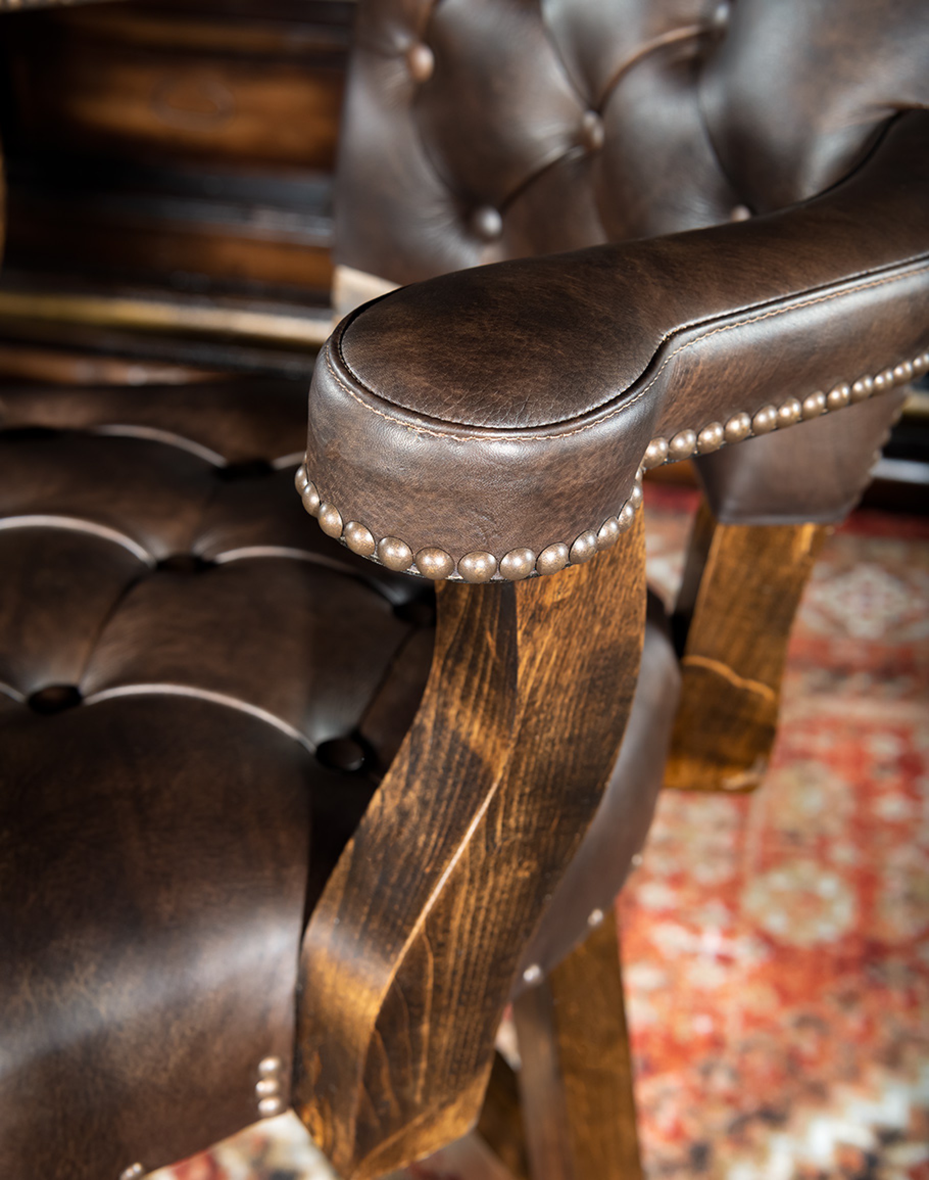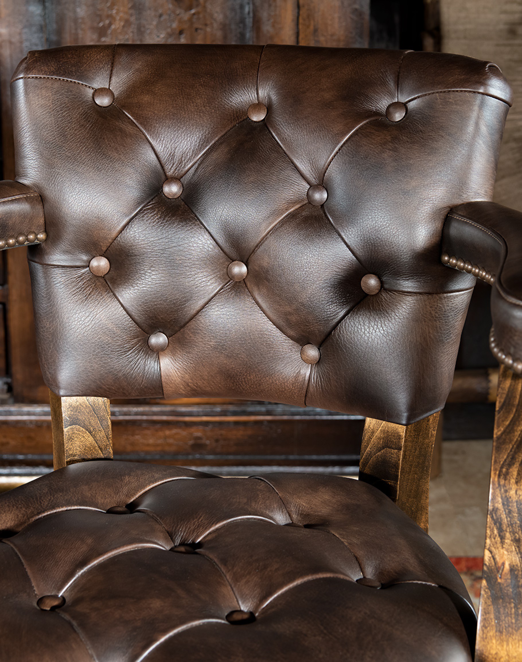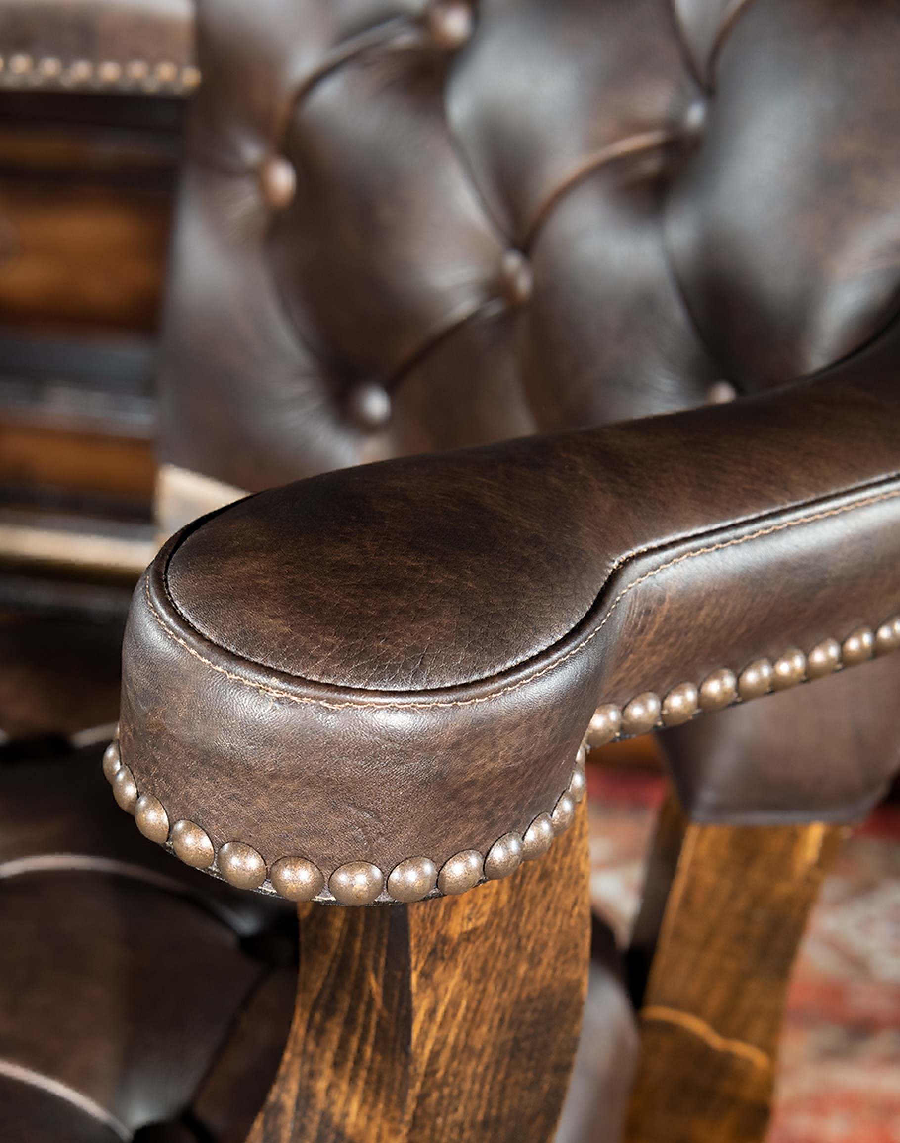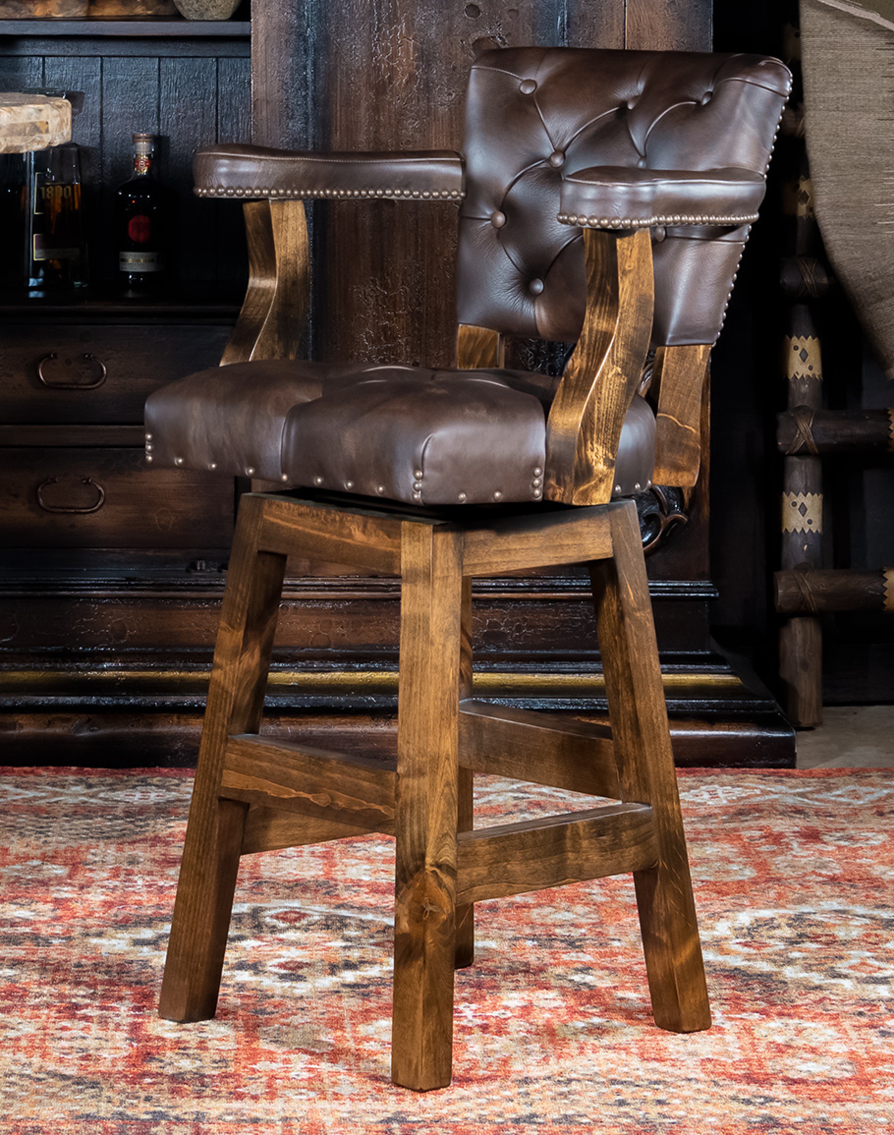 Looking for a barstool that is as impeccably made as it is aesthetically fabulous? If so, you need look no further than our Chisum Legacy Leather Swivel Barstool! Intended for the sophisticated yet adventurous collector, this fine tufted leather stool will elevate any space you put it in. This upscale swivel barstool features a lush, full-grain leather with stamped leather on the outside back. Our signature solid hardwood frame and high-quality ball bearing swivel mechanism means this piece isn't just nice to look at it —it’s also a pleasure to use for hours on end. The premium high-density foam cushion core is the cherry on top of this luxurious Western barstool. The Chisum Legacy Barstool with arms is 100% American made, so you know you will be getting a high-quality piece that you can count on for years to come. Add a full set to your bar space today.