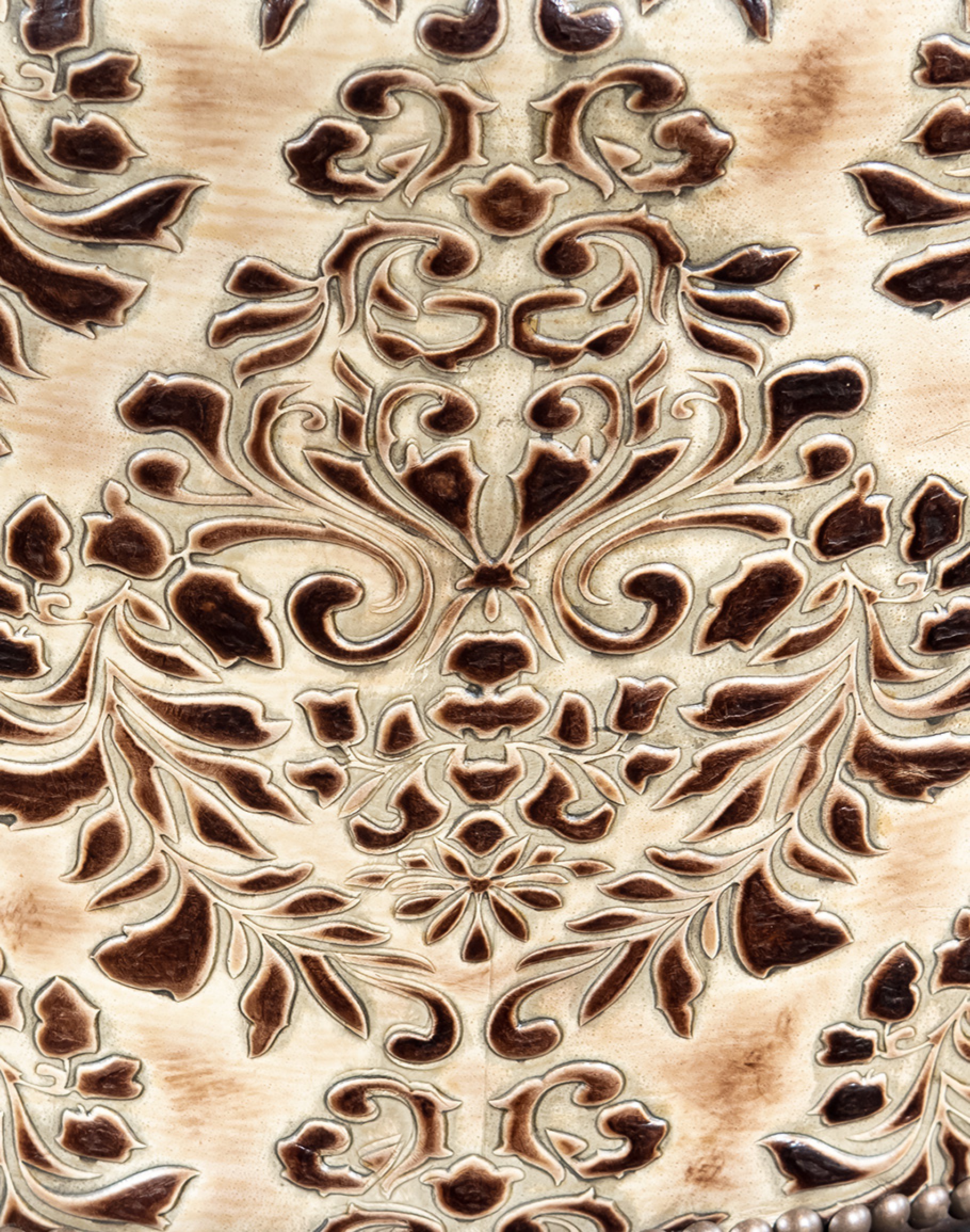 Embossed Leather Description: A leather used to accent many of today's home interiors. The leather hide is first embossed with a large decorative pattern and then colored by applying two base color coats of micro pigments. The leather is then wiped-off to give it a contrast of colors utilizing the base color combination. This color contrast is further accented by two additional top coat colors that are wiped-on by hand to give the leather a beautiful antique look. The last step is to slightly protect the hand work of the leather hide with a lacquer topcoat that provides great depth and warmth to the finished product.