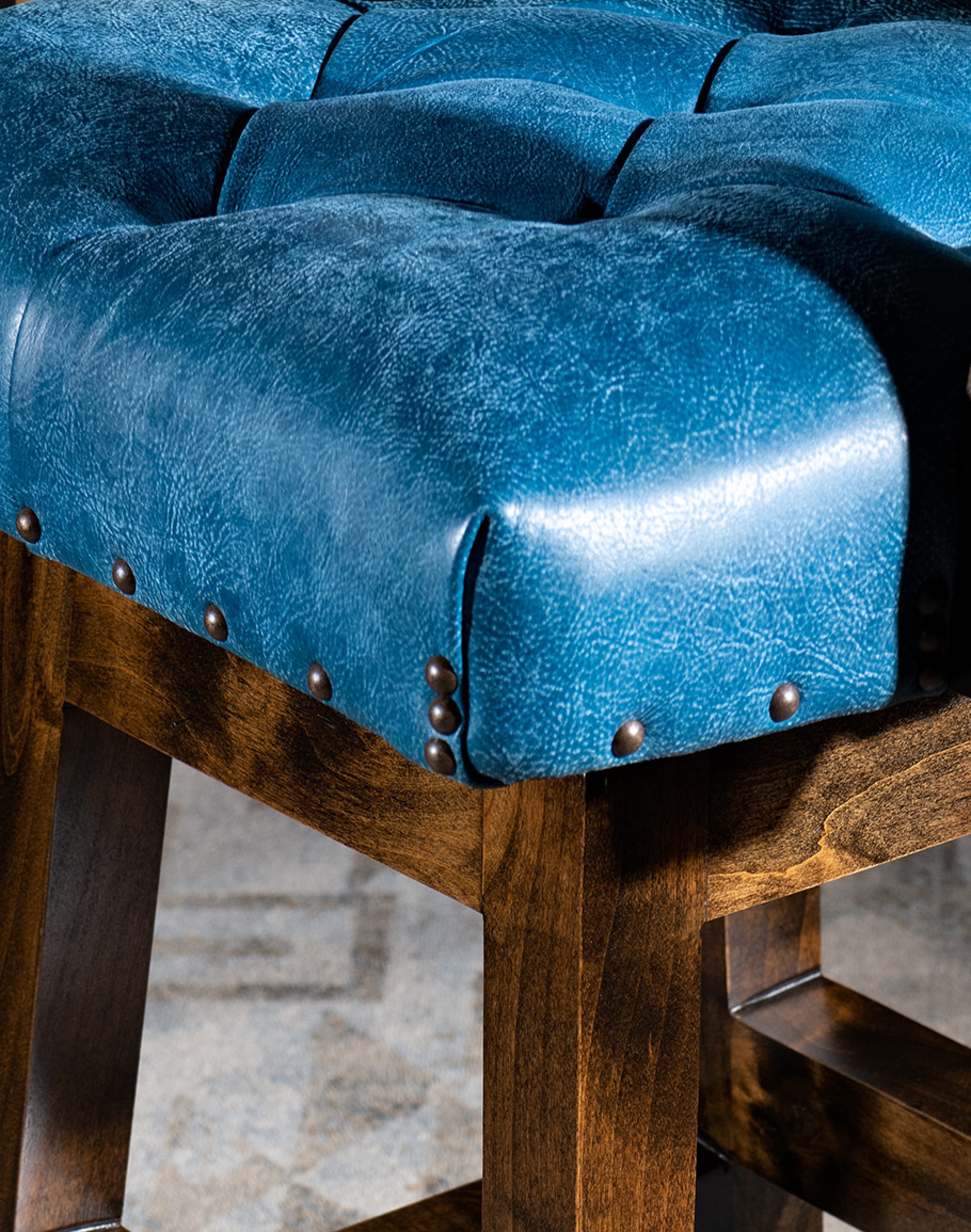 Looking for a stunning and unique leather barstool for your home? Look no further than our Chisum Levi Barstool. With a solid hardwood frame and subtle denim blue leather, this barstool is the perfect accent piece for any home, dining room, or living area. The brass-studded accents and worn, comforting feel of the leather give this barstool a perfect motif, while the armrests' gentle curve and sturdy squared base provide comfort and support. Handcrafted from Knotty Alder, the Chisum Levi Barstool is a truly authentic and elegant addition to any space.