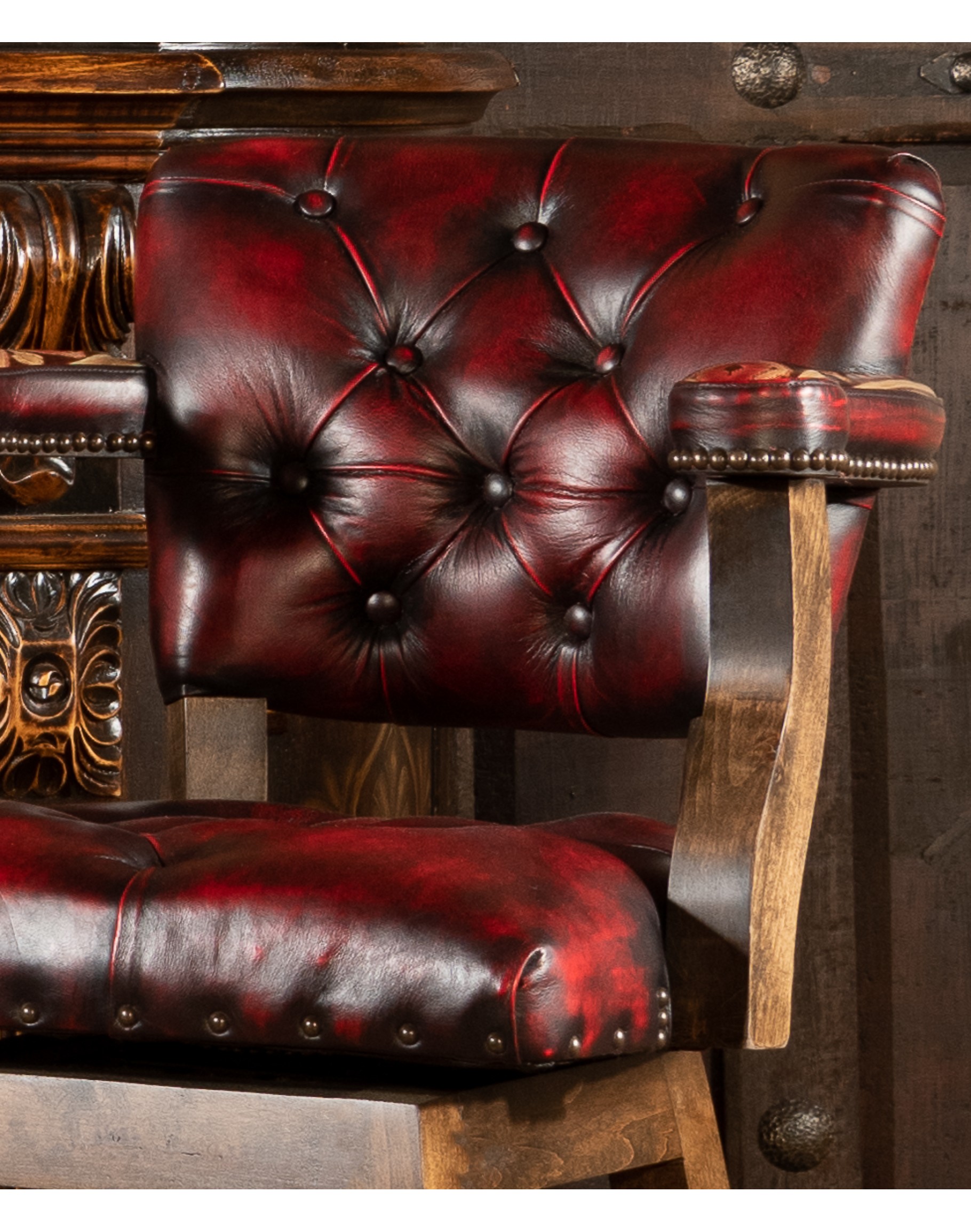The Chisum Navajo Red Barstool is stunning, not only for its solid hardwood framing, but particularly for its striking red hand-burnished leather and Navajo inspired embossed accents! Crafted to be either bar or counter height, this fine barstool will make a statement in any home, dining room or living area. Brass-studded accents and the worn, comforting feel of the leather give the perfect motif for this accent piece. The armrests' gentle curve allow you to mold perfectly into comfort of the seat, while being supported on the sturdily squared hard lines of the barstool base, all handcrafted from Knotty Alder. The Chisum Navajo Red Barstool provides a uniquely authentic experience and elegant charm to any space. If beauty and charm along with a stand alone character are what you seek, dive into the experience with this Chisum barstool and bring color and life to your home. Best as a dynamic set, these barstools are hand made classics for you. 100% Texas Made!