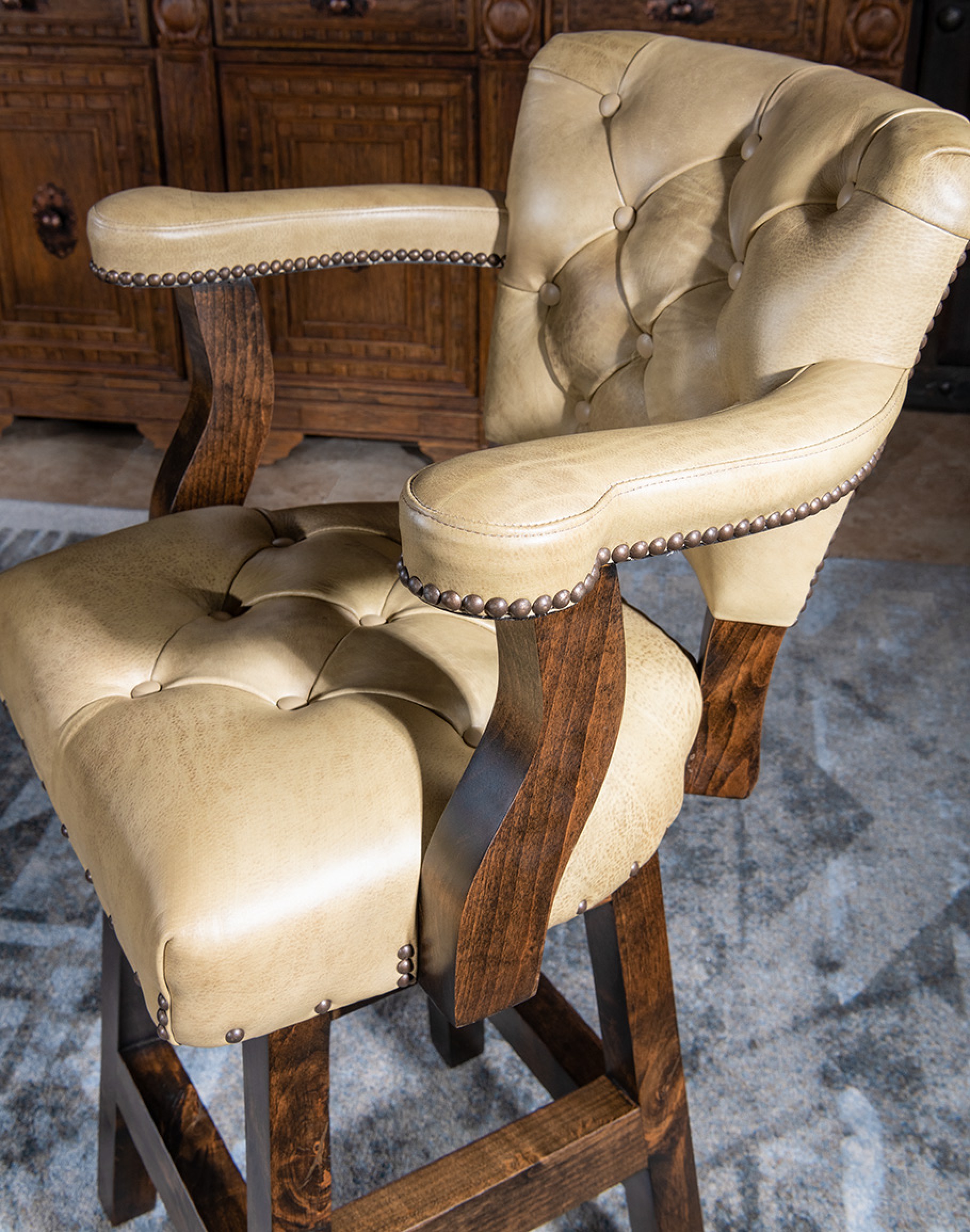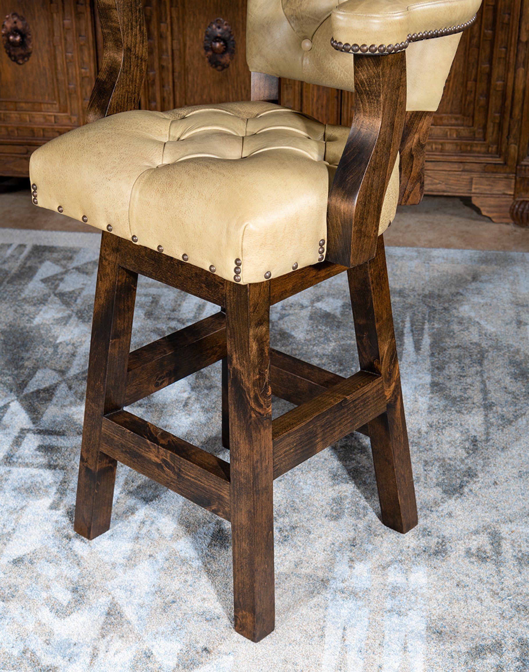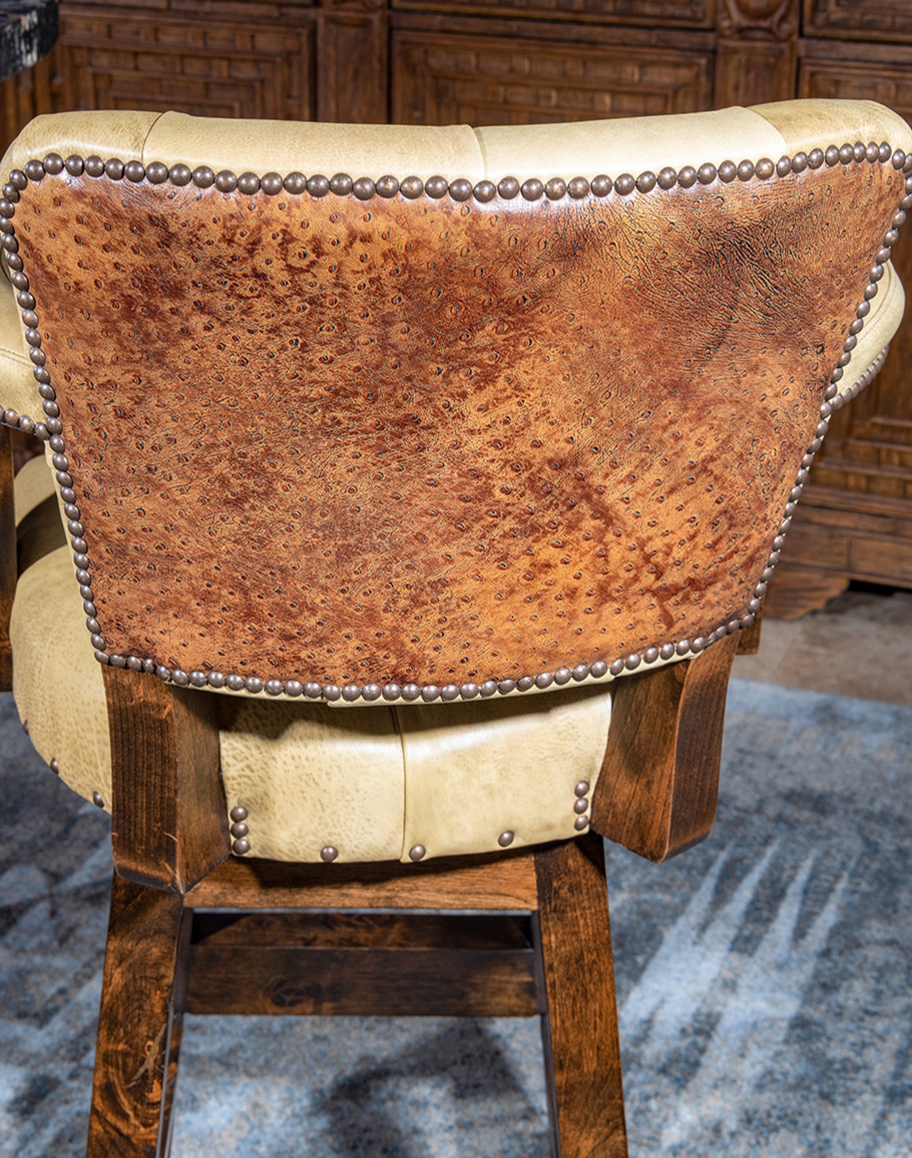 The Chisum Quill Barstool is stunning, not only for its solid hardwood framing, but particularly for its hand burnished-tufted leather with a contrasting ostrich pattern leather on the outback. Crafted to be either bar or counter height, this fine rustic barstool will make a statement in any home dining room or living area. Brass-studded accents and solid hardwood framing provide the perfect motif for this accent piece. The armrests' gentle sloping feature is a juxtaposition to the sturdily squared hard lines of the base of the barstool. All handcrafted and designed, the Chisum Quill Stool provides a uniquely authentic experience and rustic elegant charm to any space. If beauty and charm along with a stand alone character are what you seek, dive into the experience with our Chisum Quill Barstool and bring life to your home. Best as a dynamic set, these barstools are hand made classics for you. 100% American Made to the highest standards of quality and craftsmanship.