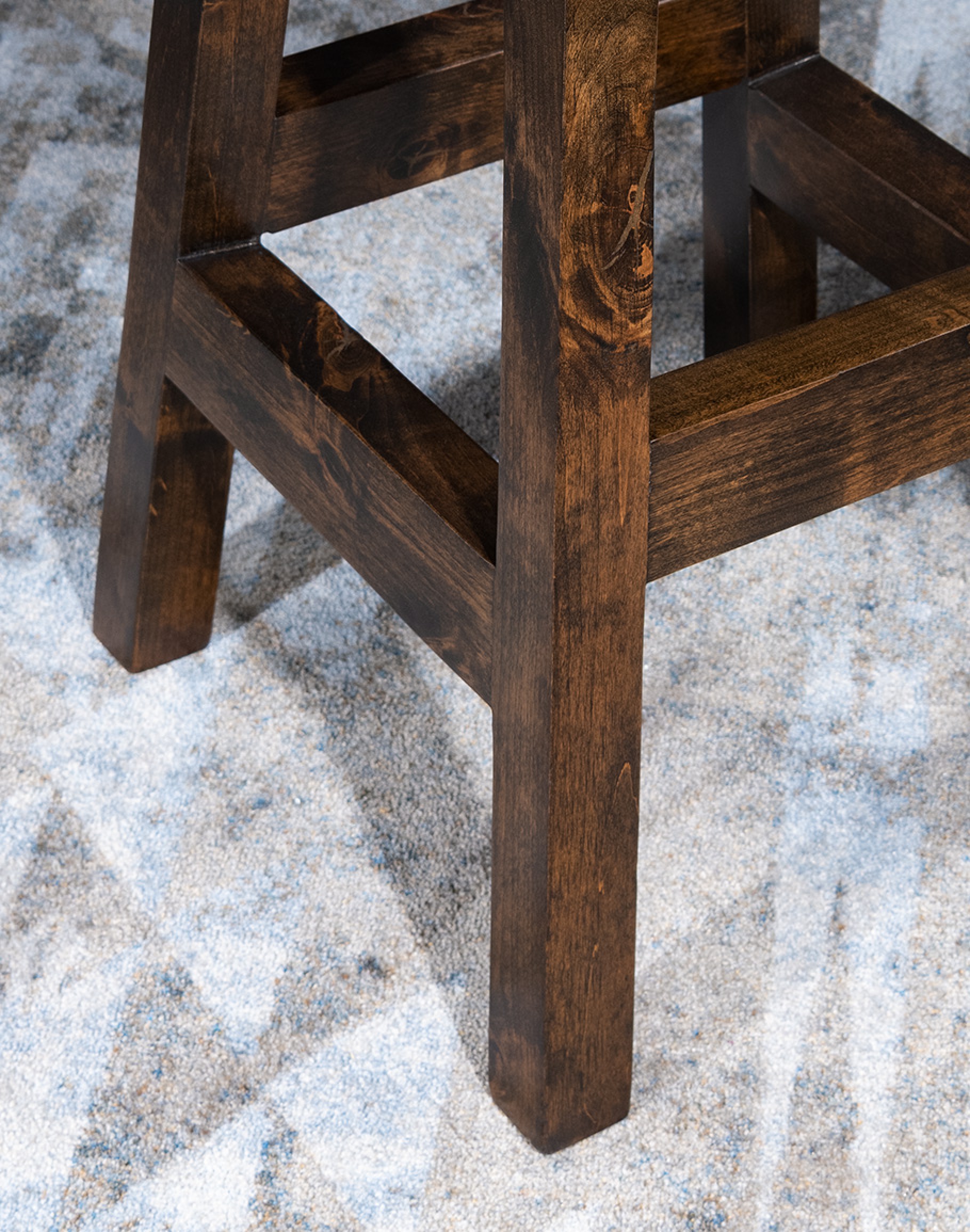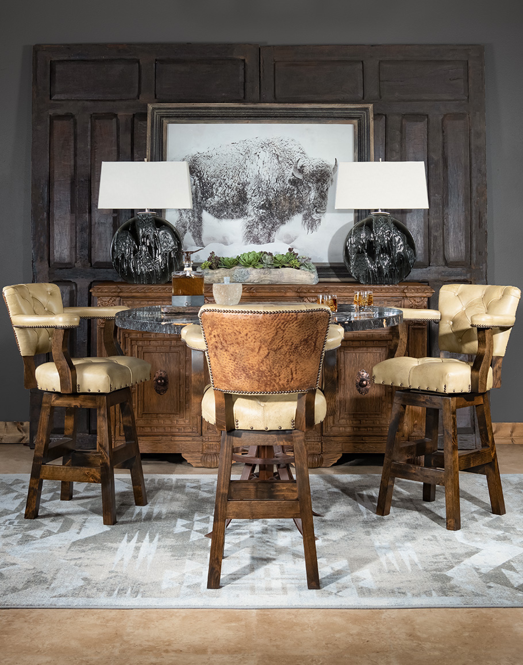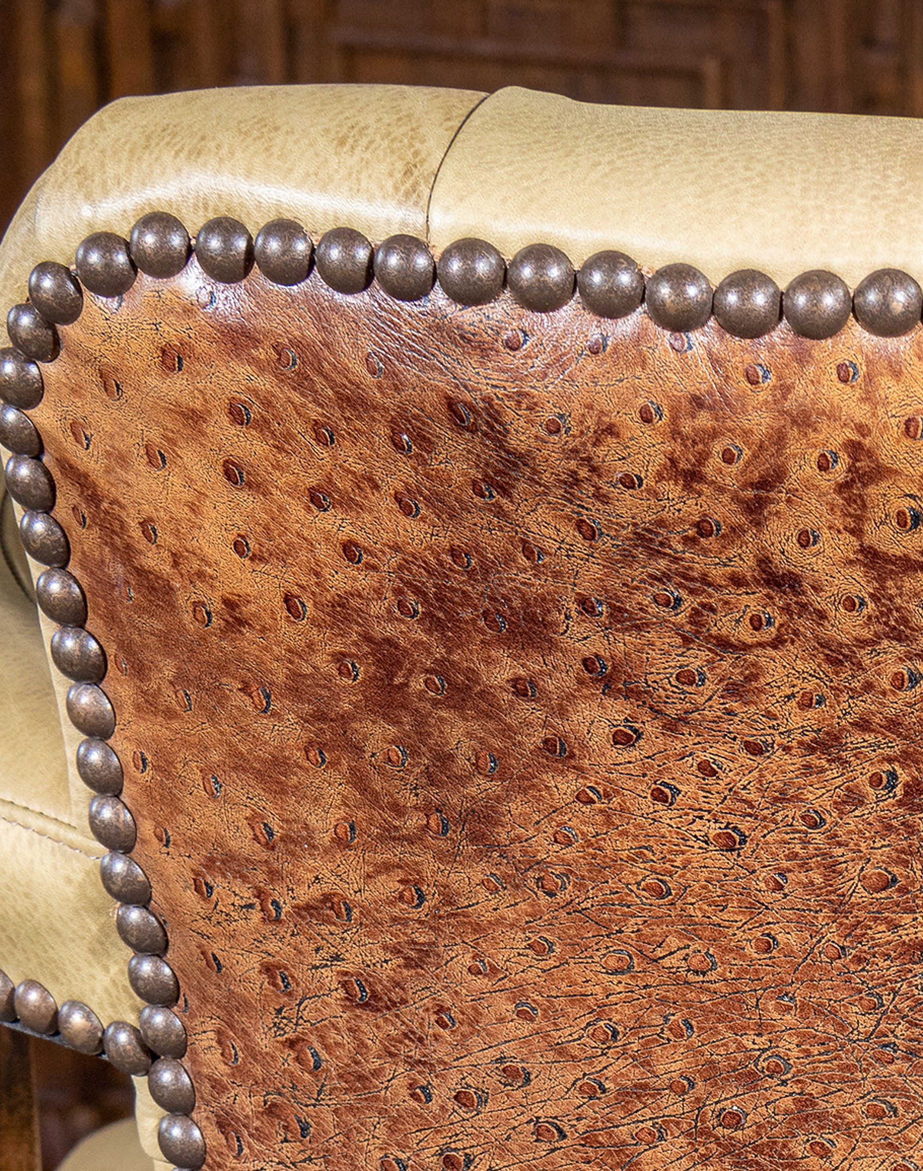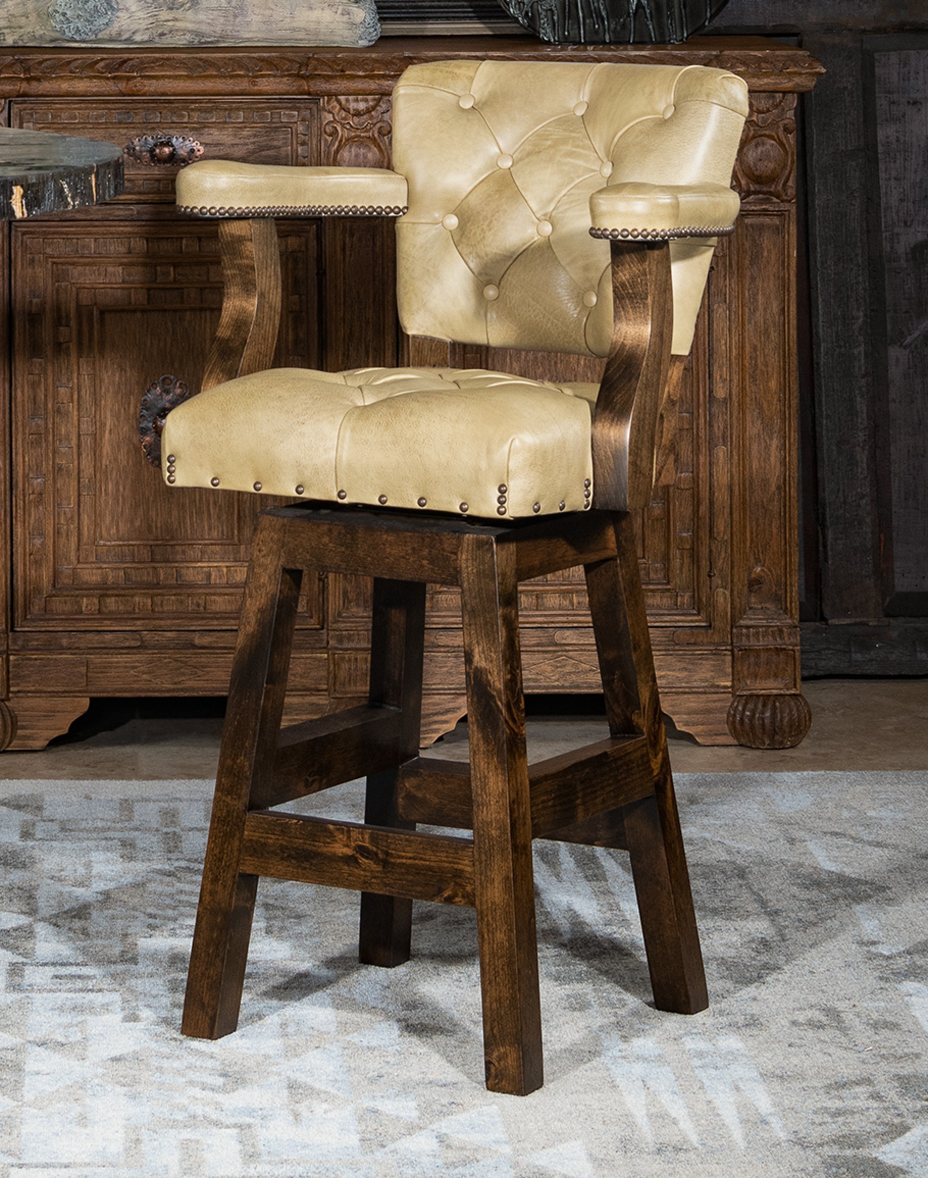 The Chisum Quill Barstool is stunning, not only for its solid hardwood framing, but particularly for its hand burnished-tufted leather with a contrasting ostrich pattern leather on the outback. Crafted to be either bar or counter height, this fine rustic barstool will make a statement in any home dining room or living area. Brass-studded accents and solid hardwood framing provide the perfect motif for this accent piece. The armrests' gentle sloping feature is a juxtaposition to the sturdily squared hard lines of the base of the barstool. All handcrafted and designed, the Chisum Quill Stool provides a uniquely authentic experience and rustic elegant charm to any space. If beauty and charm along with a stand alone character are what you seek, dive into the experience with our Chisum Quill Barstool and bring life to your home. Best as a dynamic set, these barstools are hand made classics for you. 100% American Made to the highest standards of quality and craftsmanship.