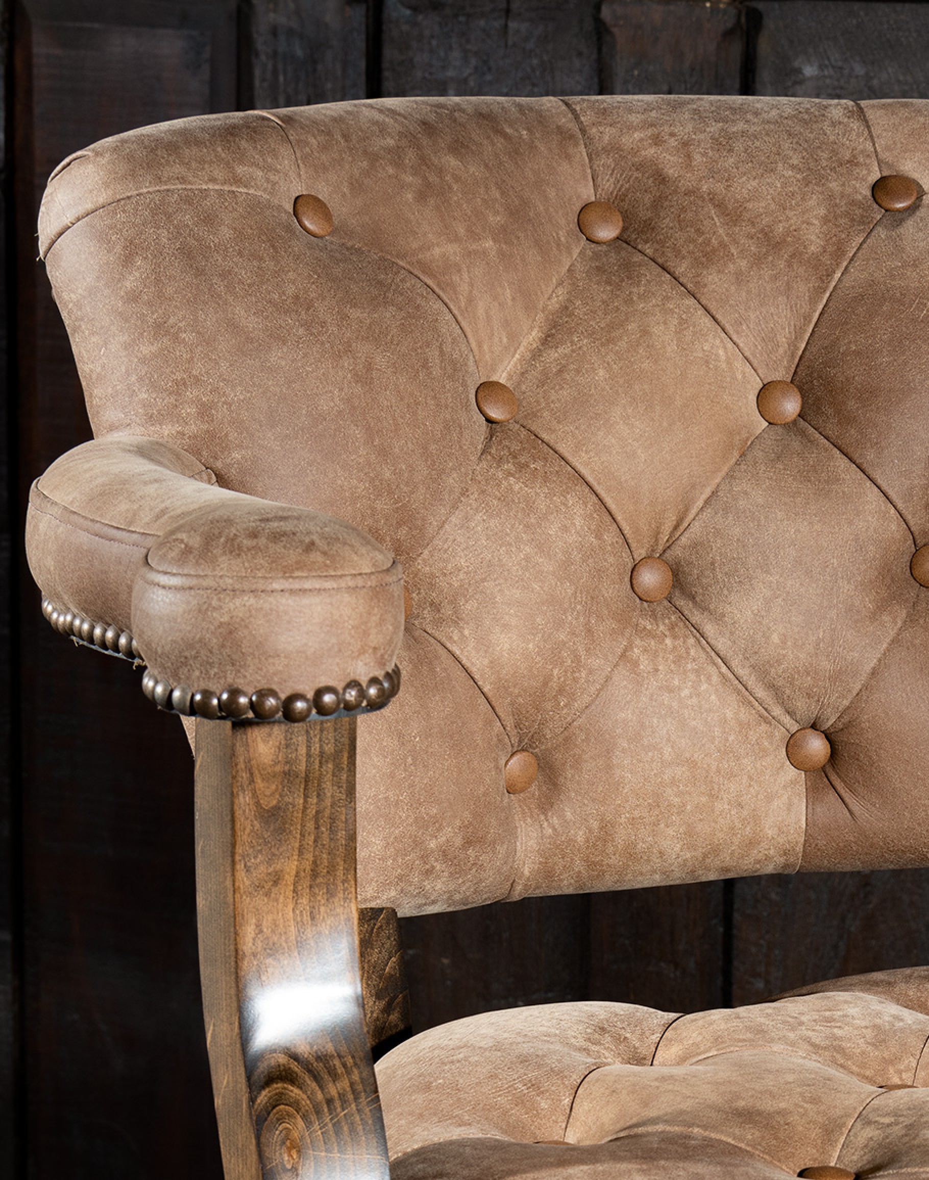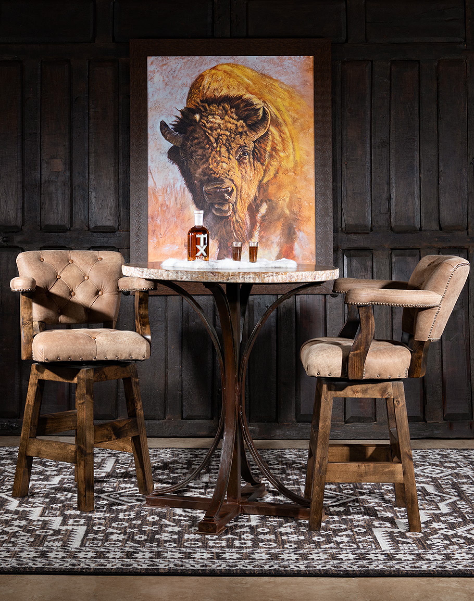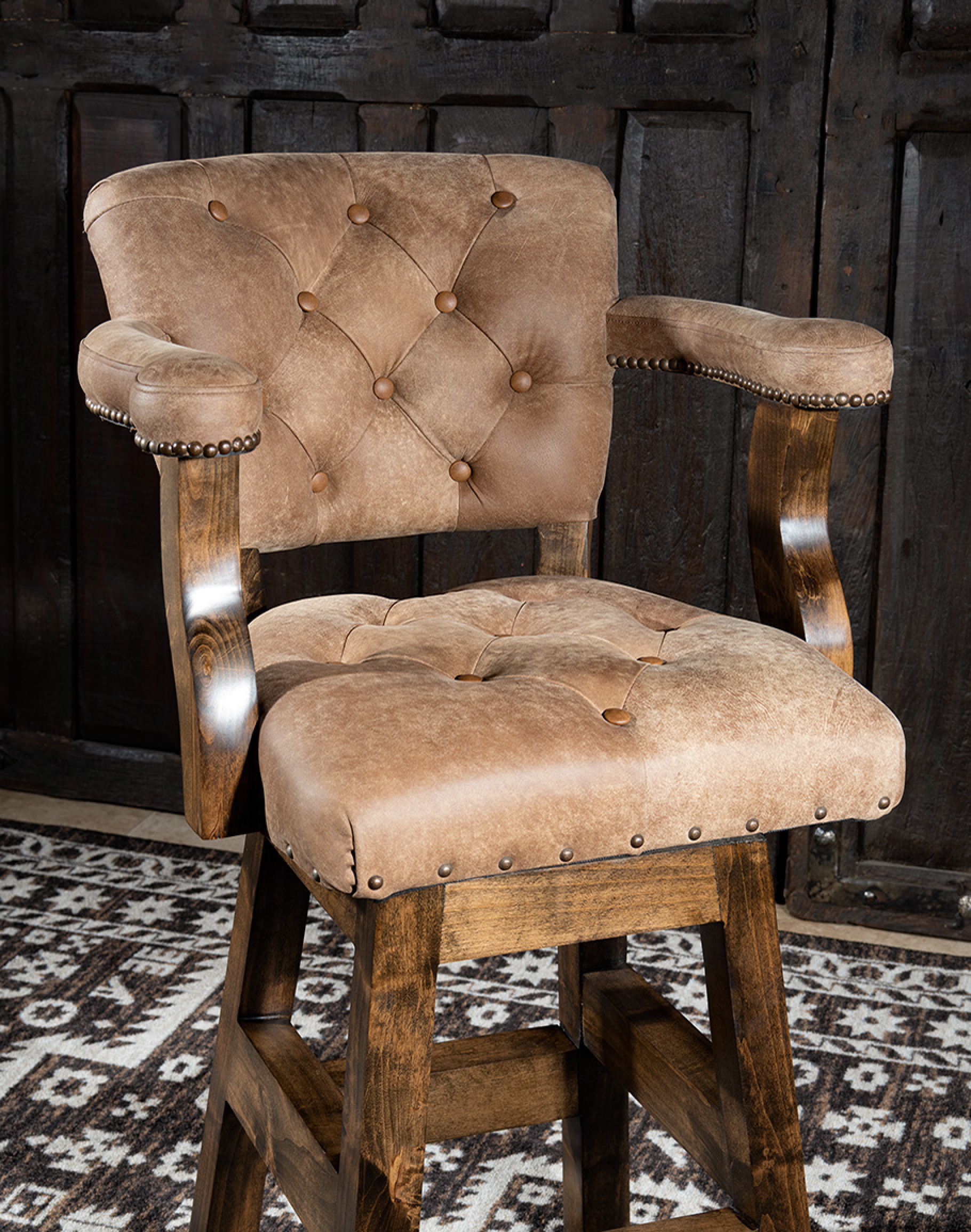 The Chisum Suela Barstool is a classic, not only for its solid hardwood framing, but particularly for its tan, hand-distressed leather. Crafted to be either bar or counter height, this fine rustic barstool will make a statement in any home dining room or living area. Brass-studded accents and solid hardwood framing provide the perfect motif for this accent piece. The armrests’ gentle sloping feature is a juxtaposition to the sturdily squared hard lines of the base of the barstool. All handcrafted and designed, the Chisum Suela Barstool provides a uniquely authentic experience and rustic elegant charm to any space. If beauty and charm along with a stand alone character are what you seek, dive into the experience with this Chisum barstool and bring color and life to your home. Best as a dynamic set, these barstools are hand made classics for you. 100% Texas Made!