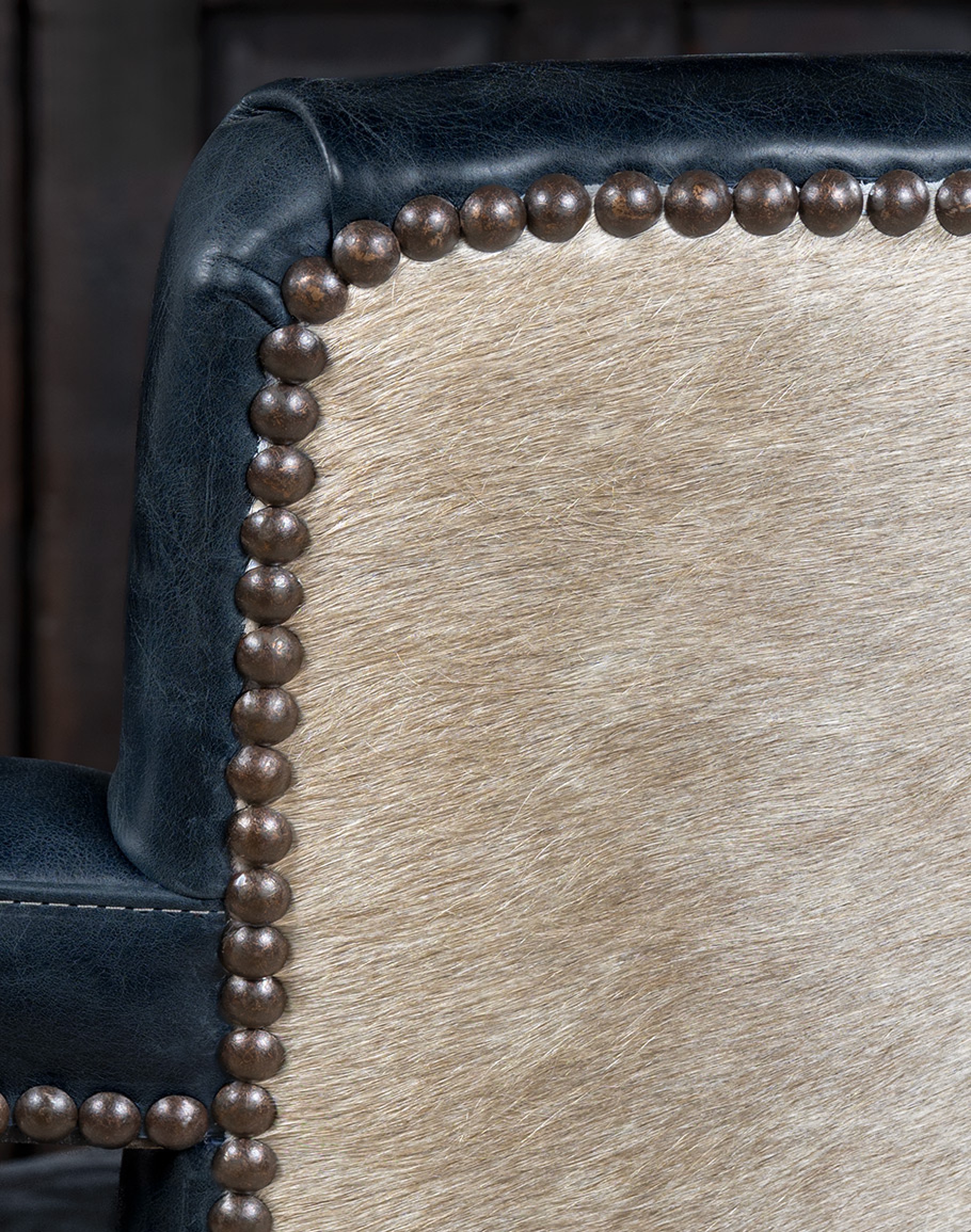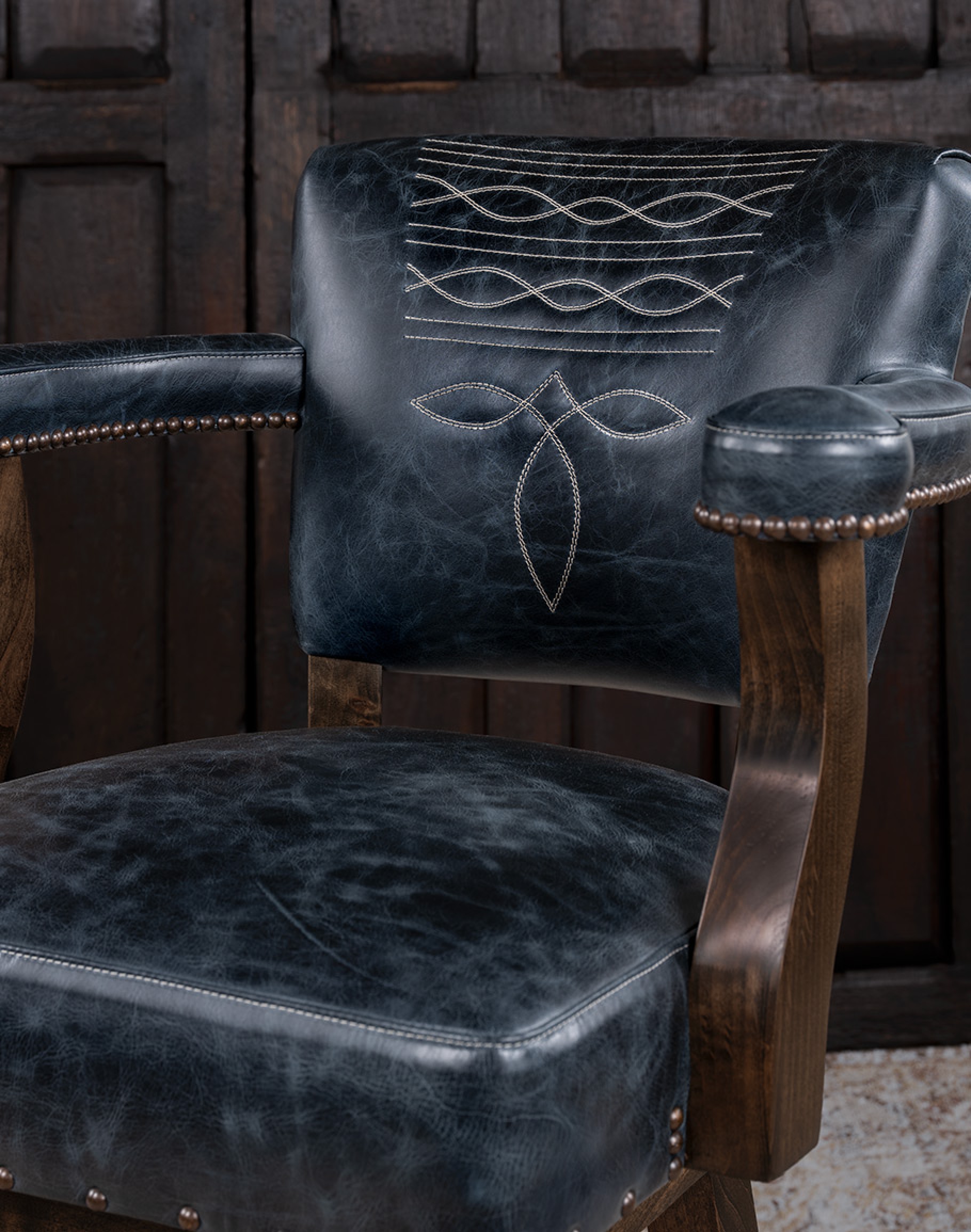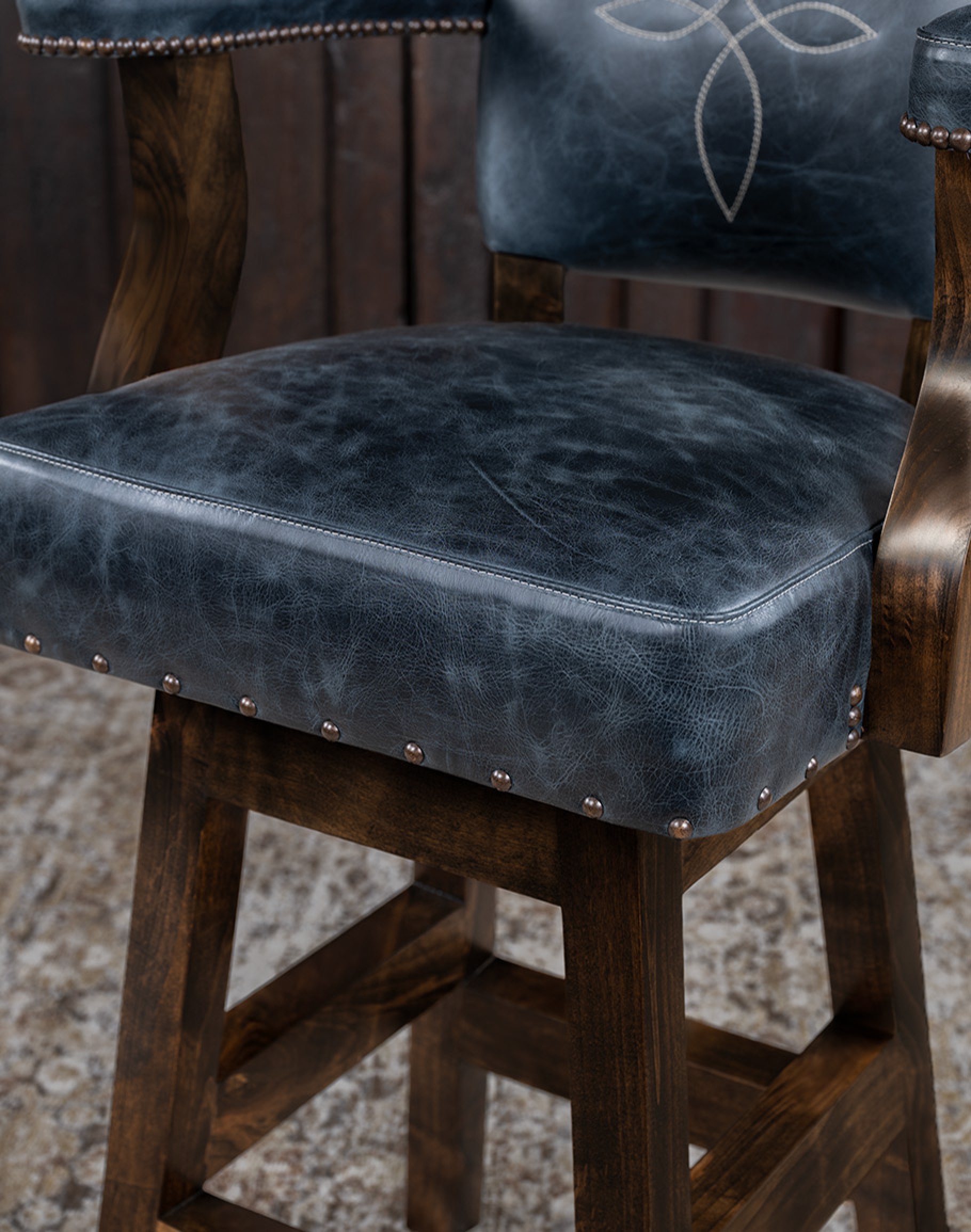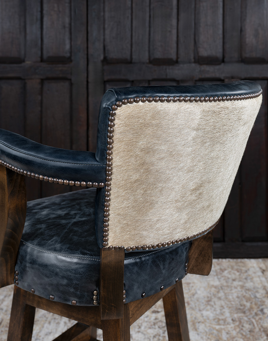 Introducing the Chisum TX Blue Western Barstool, proudly 100% American-made from solid American hardwood and full-grain leather in a rich Midnight Slate Blue tone. This heirloom barstool features a smooth 360-degree swivel for easy conversation, sculpted padded arms for comfort, and an artisan boot-stitch seat back that showcases true Western craftsmanship. The hair-on cowhide outside back delivers striking texture and contrast, while hand-applied antiqued nailhead trim and a dark, hand-rubbed wood finish complete the designer silhouette. Available in both bar and counter heights, this blue leather barstool blends luxury, durability, and authentic ranch style—built to impress and to last. Experience the blend of tradition, quality, and design.