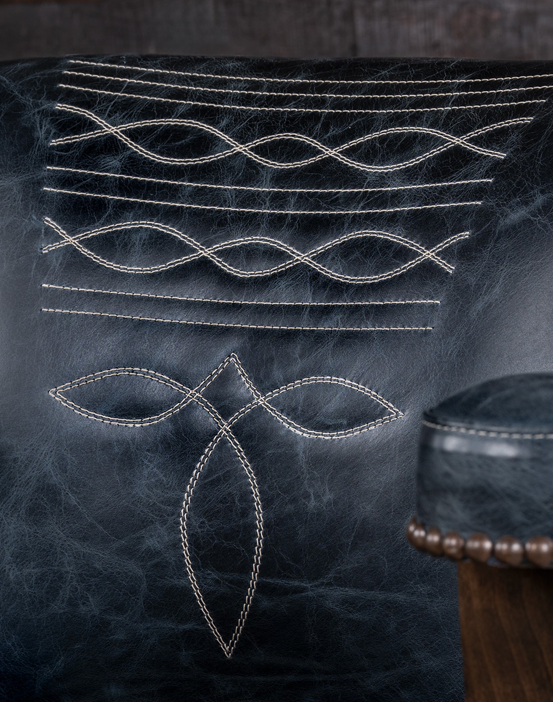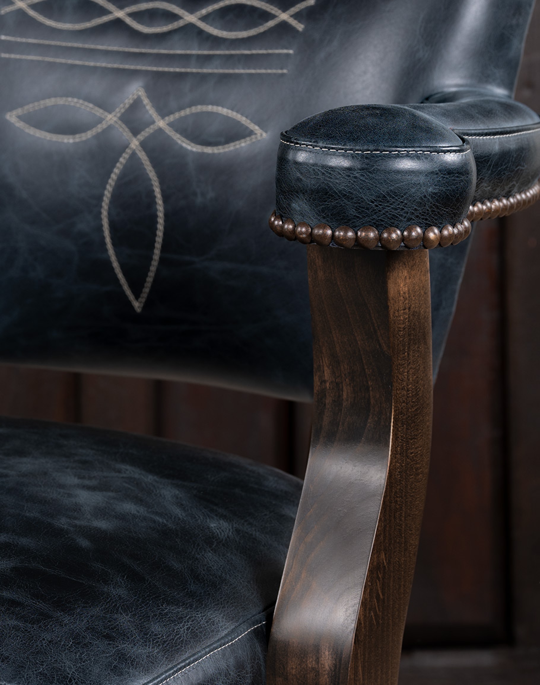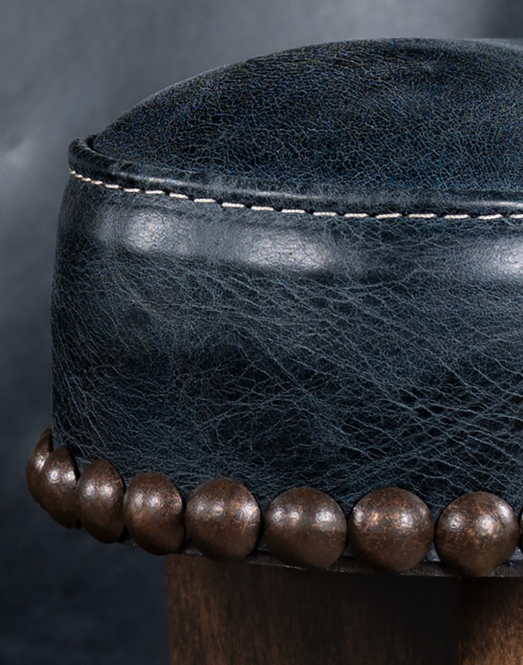 Introducing the Chisum TX Blue Western Barstool, proudly 100% American-made from solid American hardwood and full-grain leather in a rich Midnight Slate Blue tone. This heirloom barstool features a smooth 360-degree swivel for easy conversation, sculpted padded arms for comfort, and an artisan boot-stitch seat back that showcases true Western craftsmanship. The hair-on cowhide outside back delivers striking texture and contrast, while hand-applied antiqued nailhead trim and a dark, hand-rubbed wood finish complete the designer silhouette. Available in both bar and counter heights, this blue leather barstool blends luxury, durability, and authentic ranch style—built to impress and to last. Experience the blend of tradition, quality, and design.