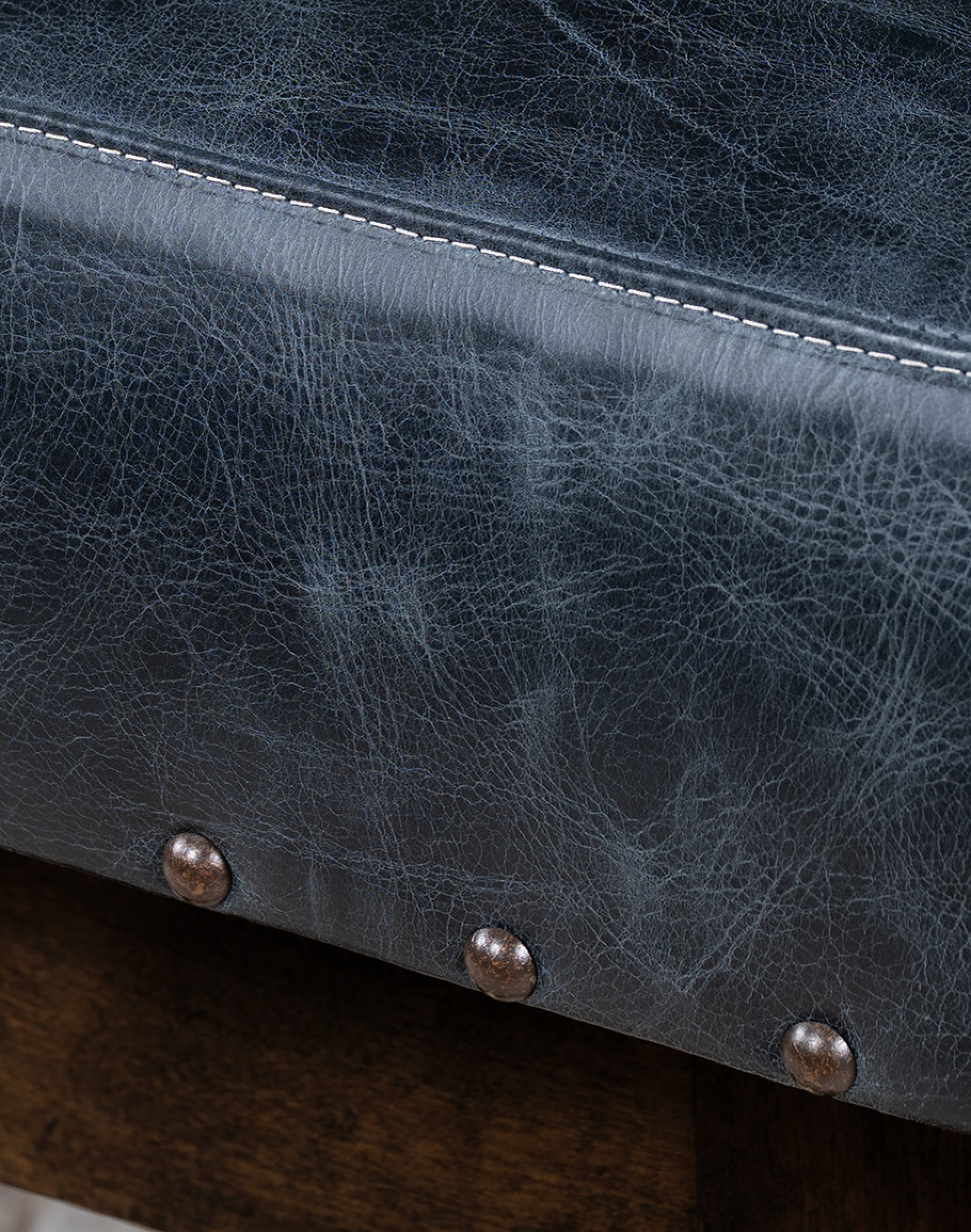 Leather Description: Dyes and waxes are hand applied to South American raw material to impart a transparent clarity. This coupled with substrate gives the leather a sophisticated, pebble grain appearance. All of the aniline dyes applied to the hides are hand rubbed in North Carolina by skilled artisans drawing from years of creative experience creating an impressive patina. The absence of pigments adds to the natural softness of the hides. A light protective top, utilizing a proprietary formulation developed by the tannery creates the exquisite touch this leather is known for and makes the leather suitable for active family homes. Because of the depth and transparency of this leather, natural markings will be exposed and should not be confused as defects or deficiencies, but appreciated as Nature's Autograph of Authenticity found in the finest full grain leathers.