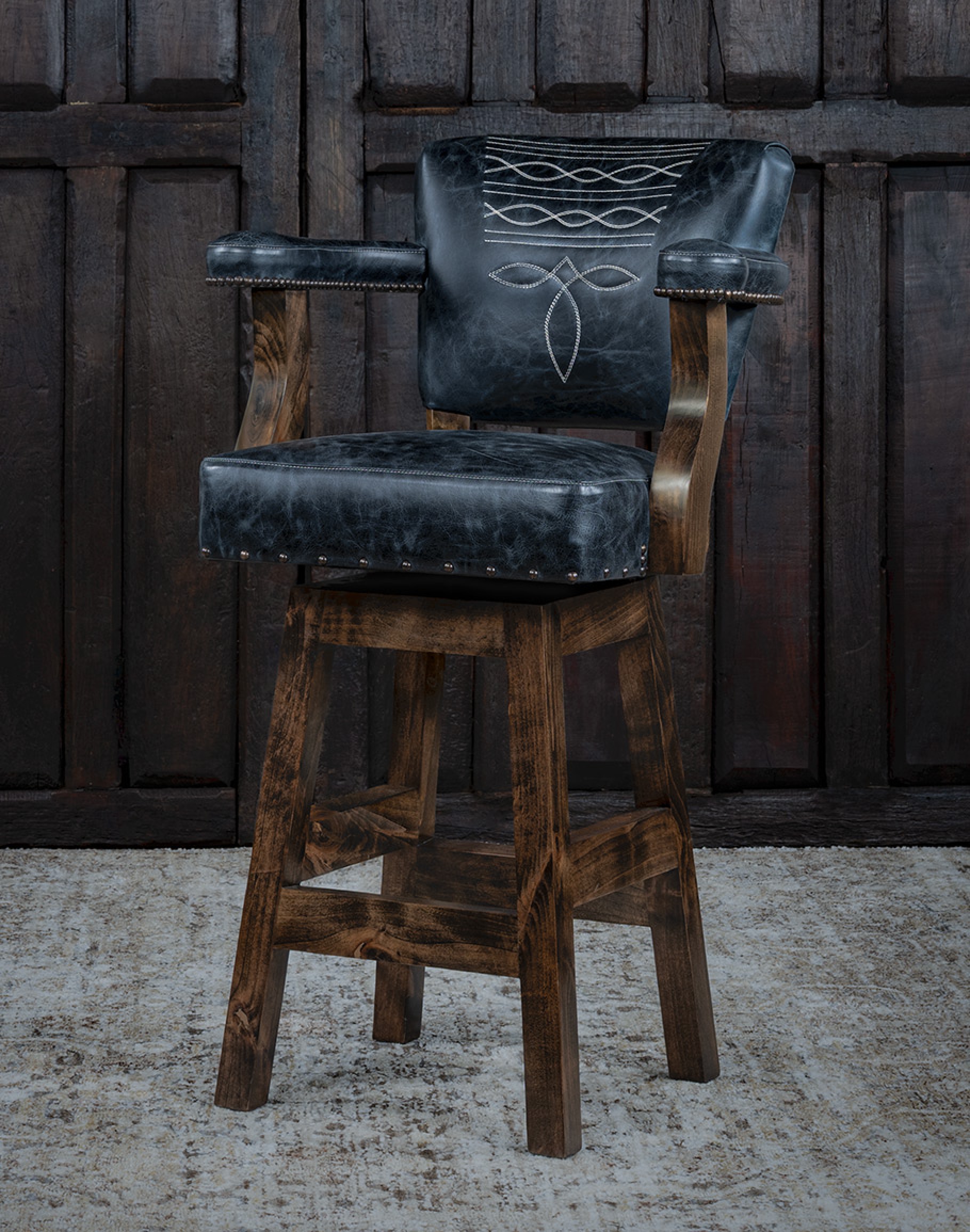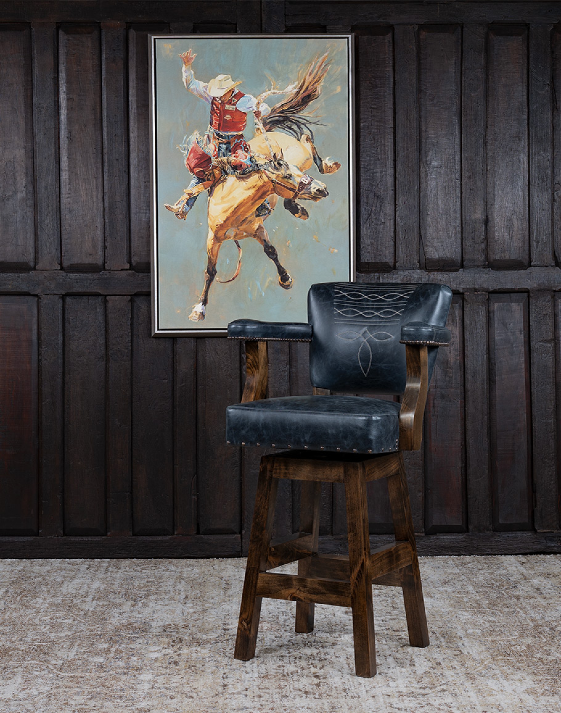 Introducing the Chisum Bandera Barstool, proudly 100% American-made from solid alder wood and top grain blue leather. This barstool features a 360-deg..