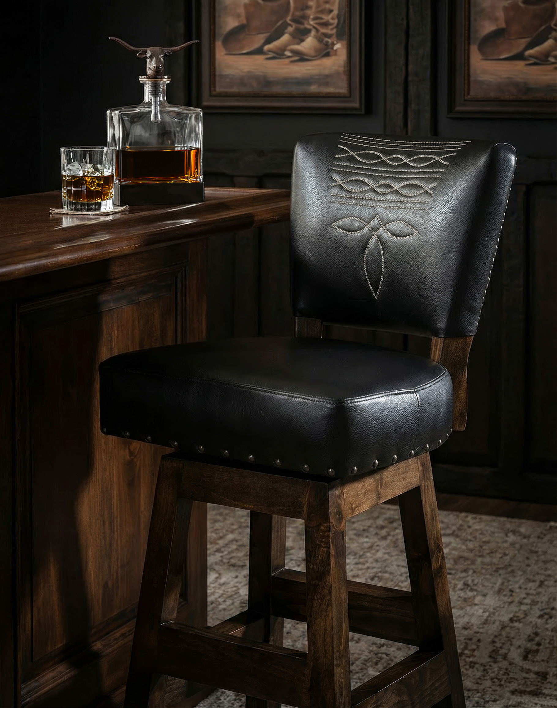The Chisum TX Midnight Armless Barstool stands out with its exquisite top-grain leather in rich black. This color evokes natural beauty while adding a touch of sophistication to any room. The seat back features a unique cowboy boot stitch design, meticulously crafted to capture the essence of the Western spirit for an added touch of authenticity and luxury.