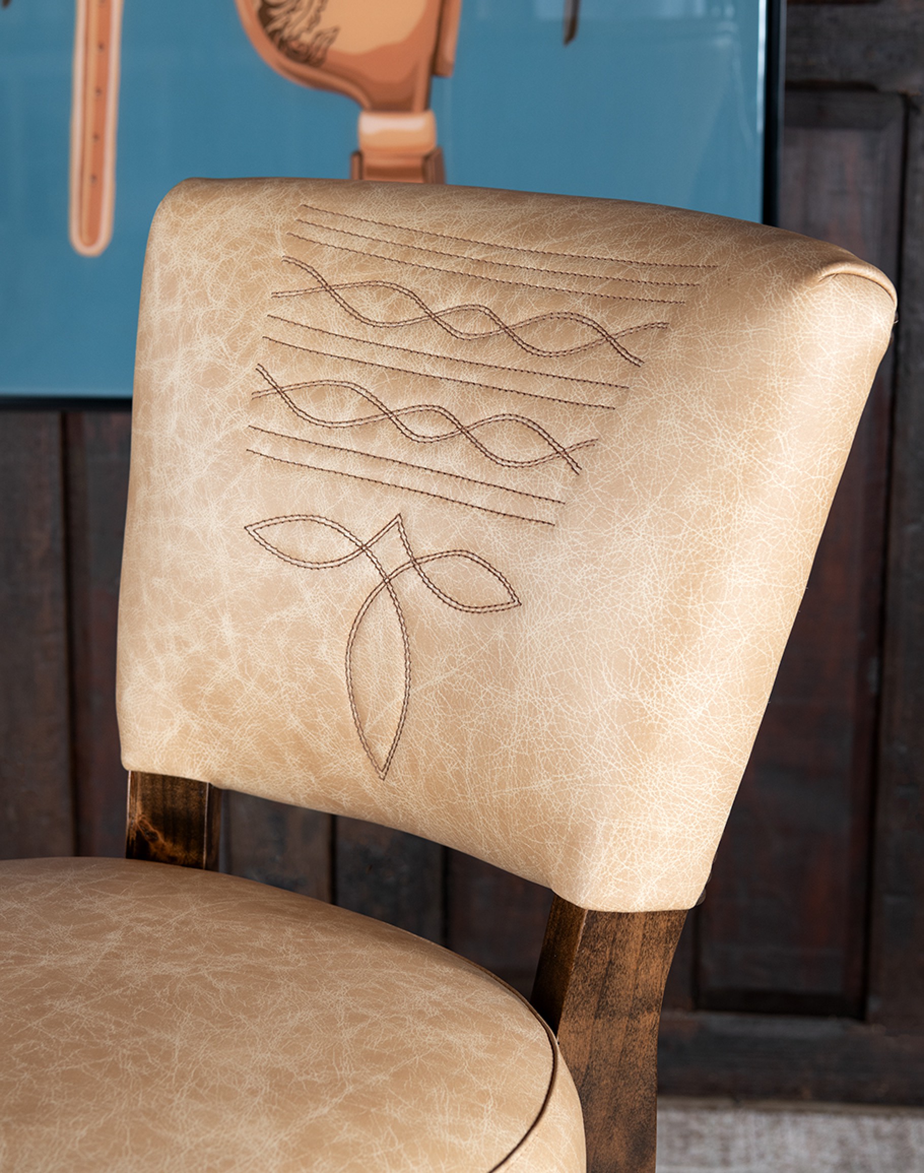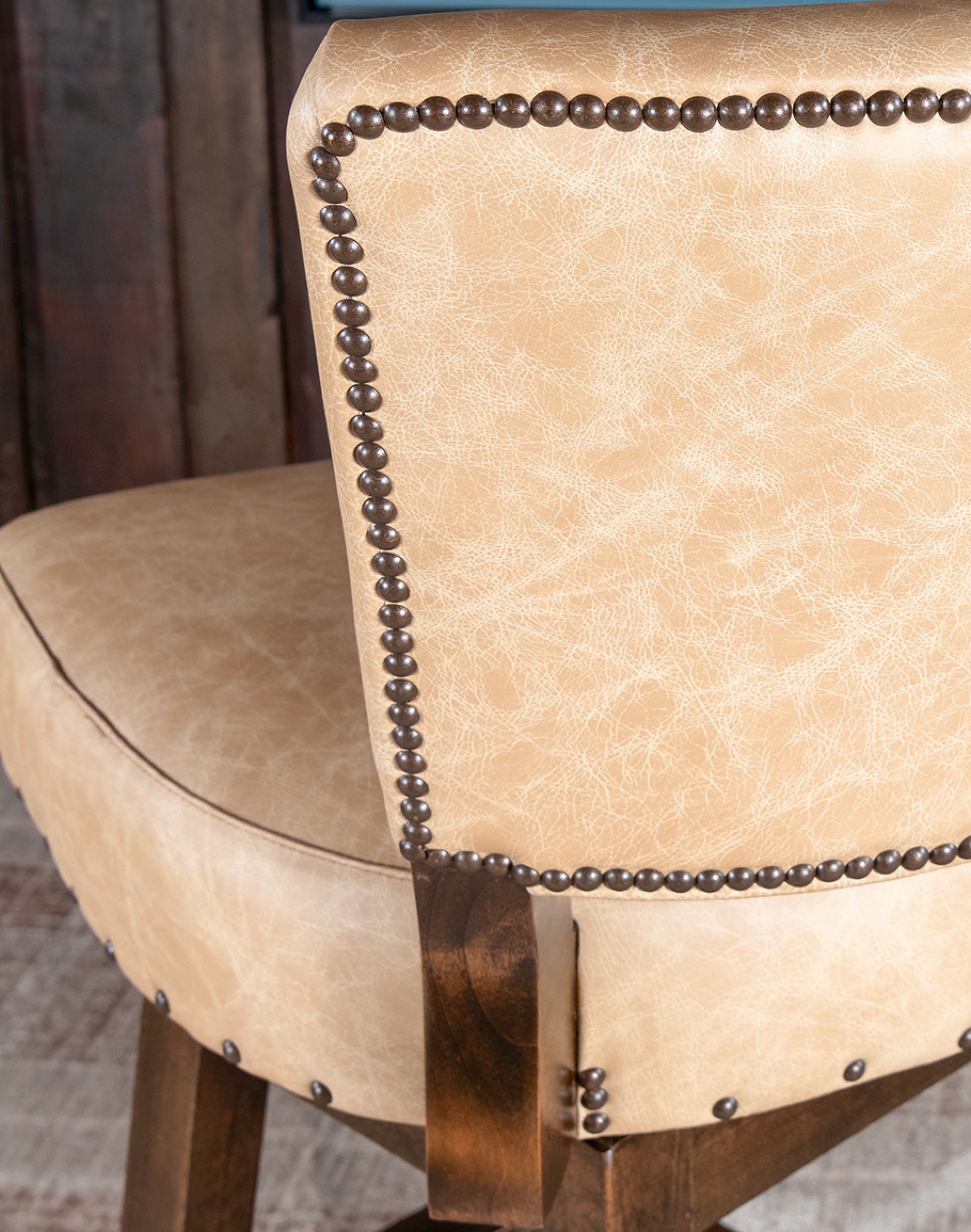 Experience the perfect blend of modern rustic charm and superior craftsmanship with the Chisum TX Palomino Armless Barstool. This 100% American-made barstool boasts top-grain leather upholstery and a sturdy frame constructed from solid American alder wood. It is designed for ultimate comfort and style and features a complete 360-degree ball-bearing swivel mechanism, allowing for effortless movement. The sleek, armless design of the Chisum TX Palomino adds a contemporary touch to any setting, while the semi-protected top-grain leather ensures durability and easy maintenance. The barstool is highlighted by our iconic cowboy boot stitch emblem on the seat back, adding a distinctive flair that captures the spirit of the American West - a star in Classic Ranch decor. Built for lasting comfort, the barstool includes high-density foam cushion cores, providing excellent support. The frame is meticulously doweled, screwed, and glued at the joints, ensuring exceptional stability and longevity. Update your bar or kitchen with the Chisum TX Palomino Armless Barstool, where modern design meets timeless craftsmanship. Add a touch of rustic elegance to your home with the Chisum TX Palomino Armless Barstool, a perfect blend of comfort, style, and quality. At Adobe Interiors, we create the furniture, and you create the memories.