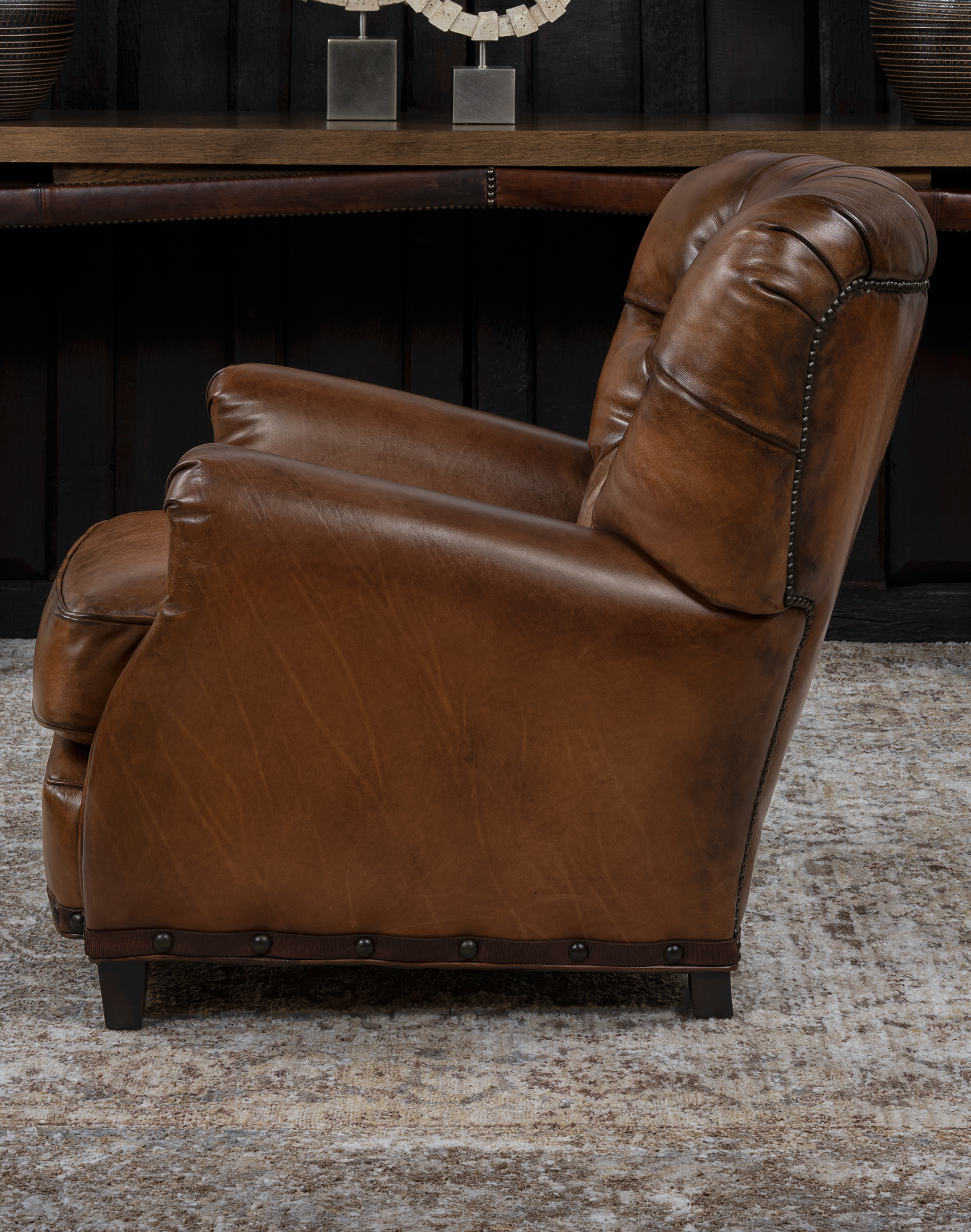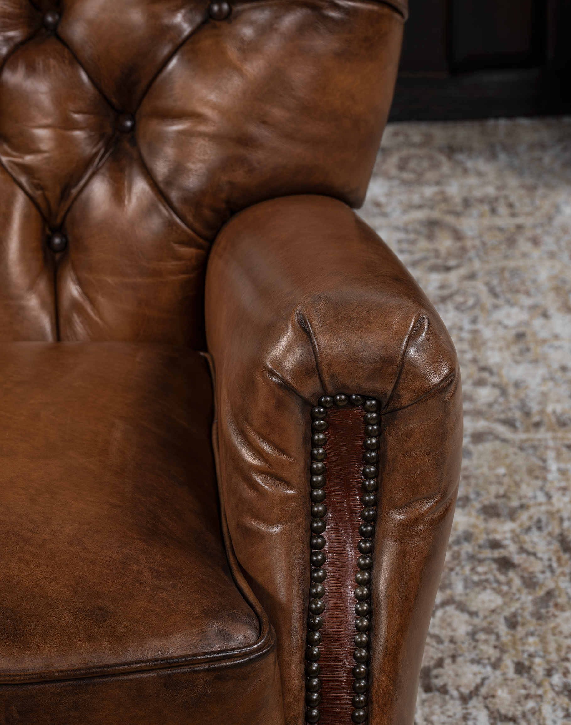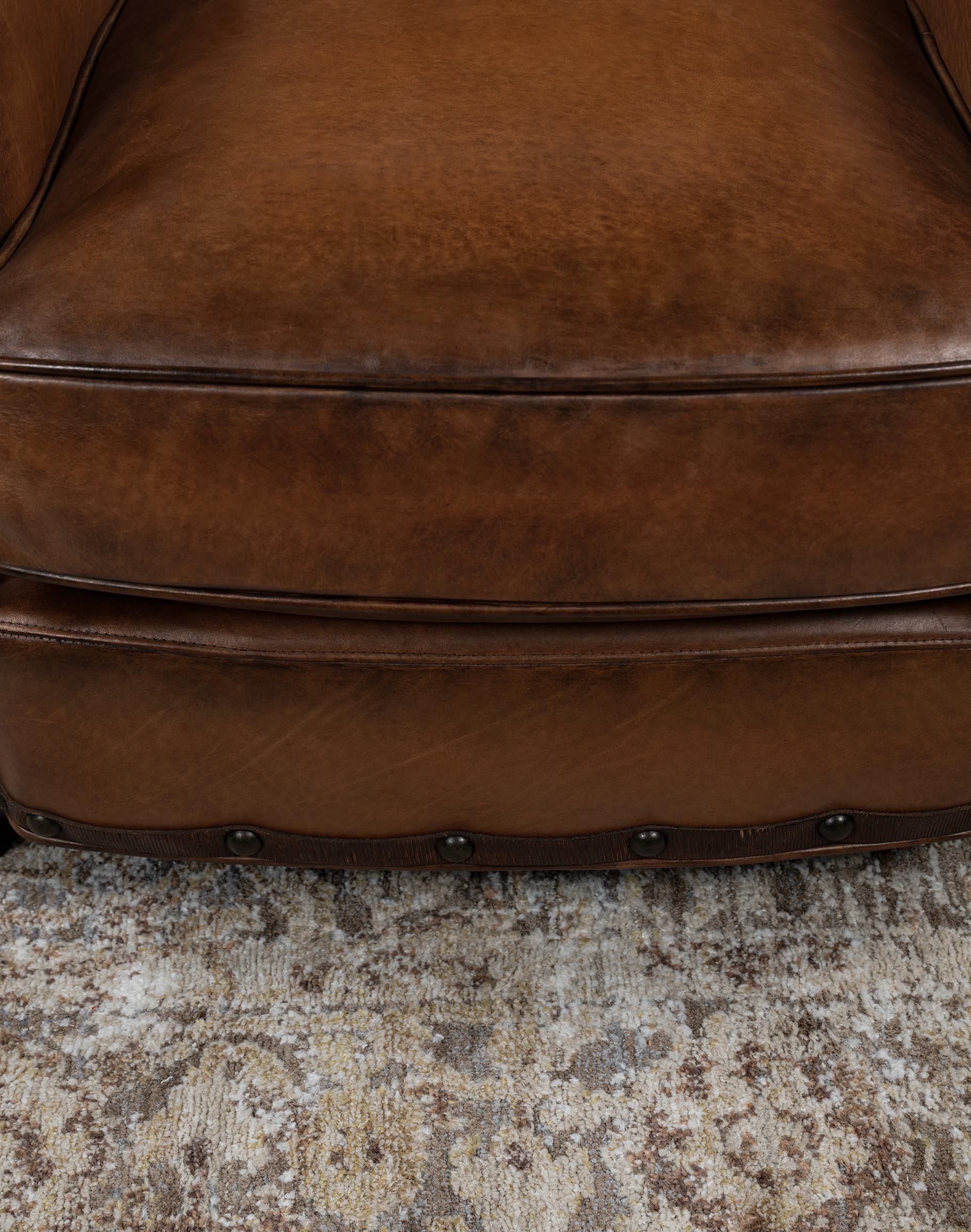 The Colt Leather Chair is a refined expression of classic Western design, blending timeless craftsmanship with elevated comfort. 100% American made to the highest standards, this heirloom-quality accent chair is upholstered in rich, full-grain leather in a warm saddle brown tone, hand-burnished to reveal natural highs and lows that enhance its depth, character, and authenticity.