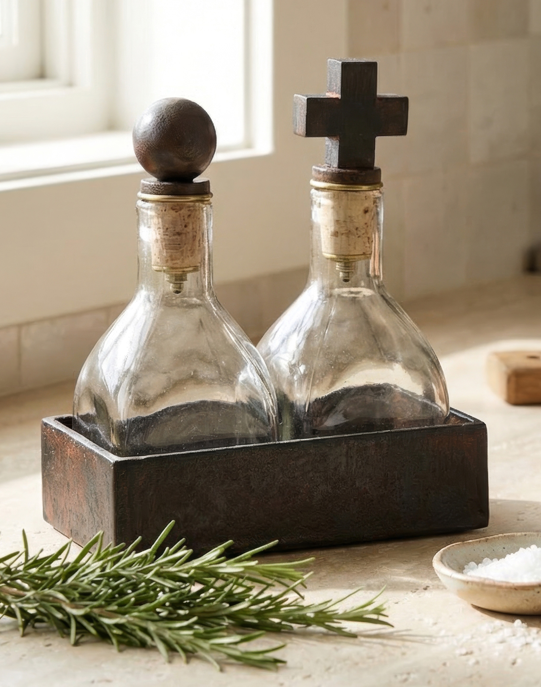 The Compadre is two twin glass bottles with Balin and Cross toppers in wax cast coaster by Jan Barboglio. Used for bath salts, bathe splash, lemon juice, oil vinegar.