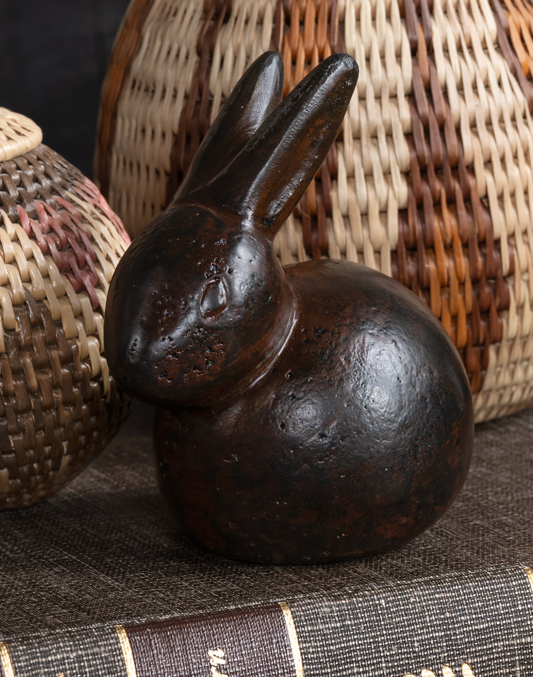 The Conejito Jan Barboglio a handcrafted iron rabbit that embodies quiet elegance and timeworn character. Cast in solid iron and finished in a rich, espresso-brown patina, this piece reveals depth through its organic surface, where darkened recesses and softly burnished highlights catch the light across its naturally pitted texture.