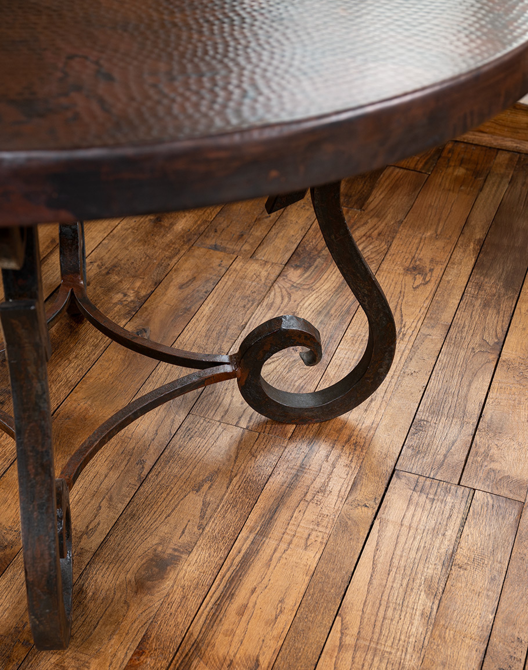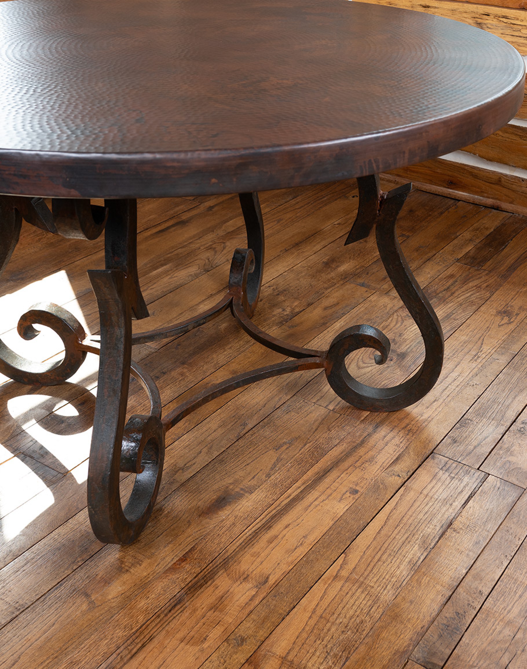 Bring artisan craftsmanship to the heart of your home with our Copper Top Dining Table. A richly textured, hand-hammered surface—made from 99% pure, thick-gauge copper—is expertly wrapped over commercial-grade MDF for superior stability and resistance to seasonal movement. The round top showcases a smooth bullnose profile and subtle planishing marks that catch the light and develop a warm, living patina over time.