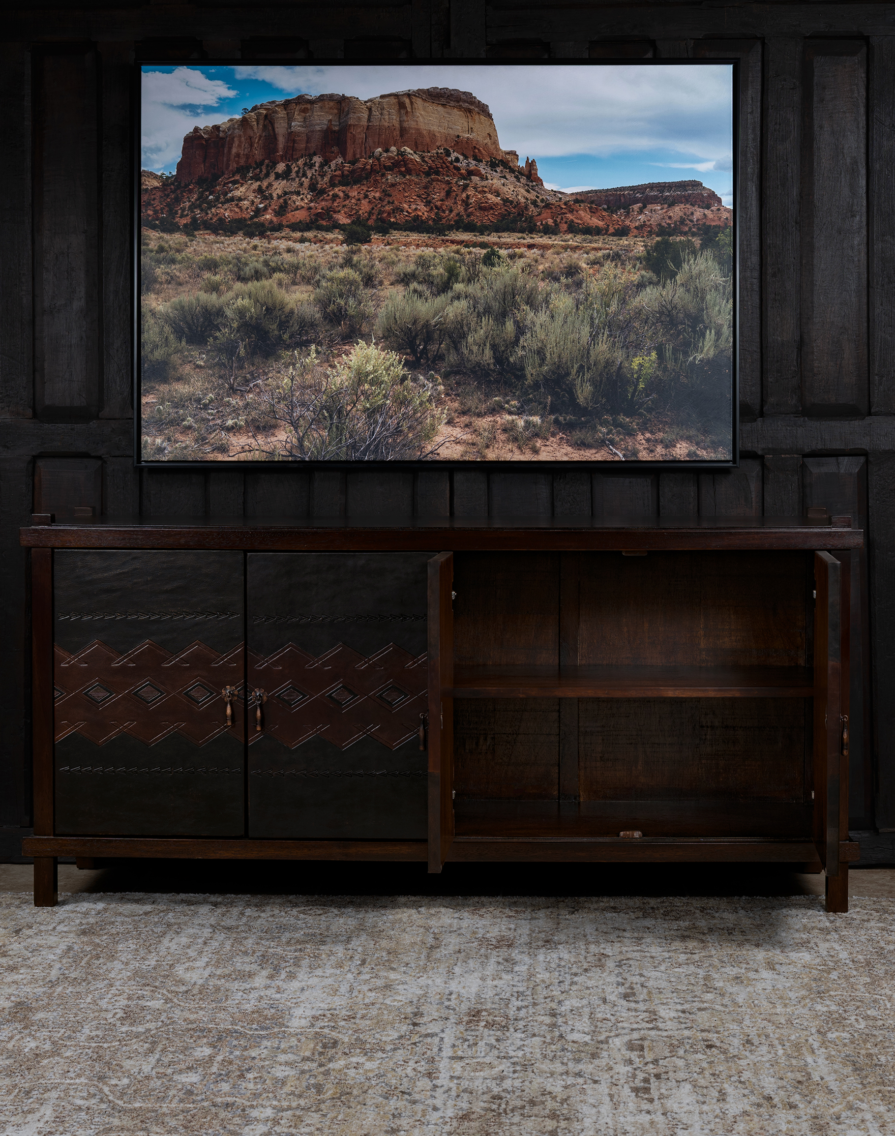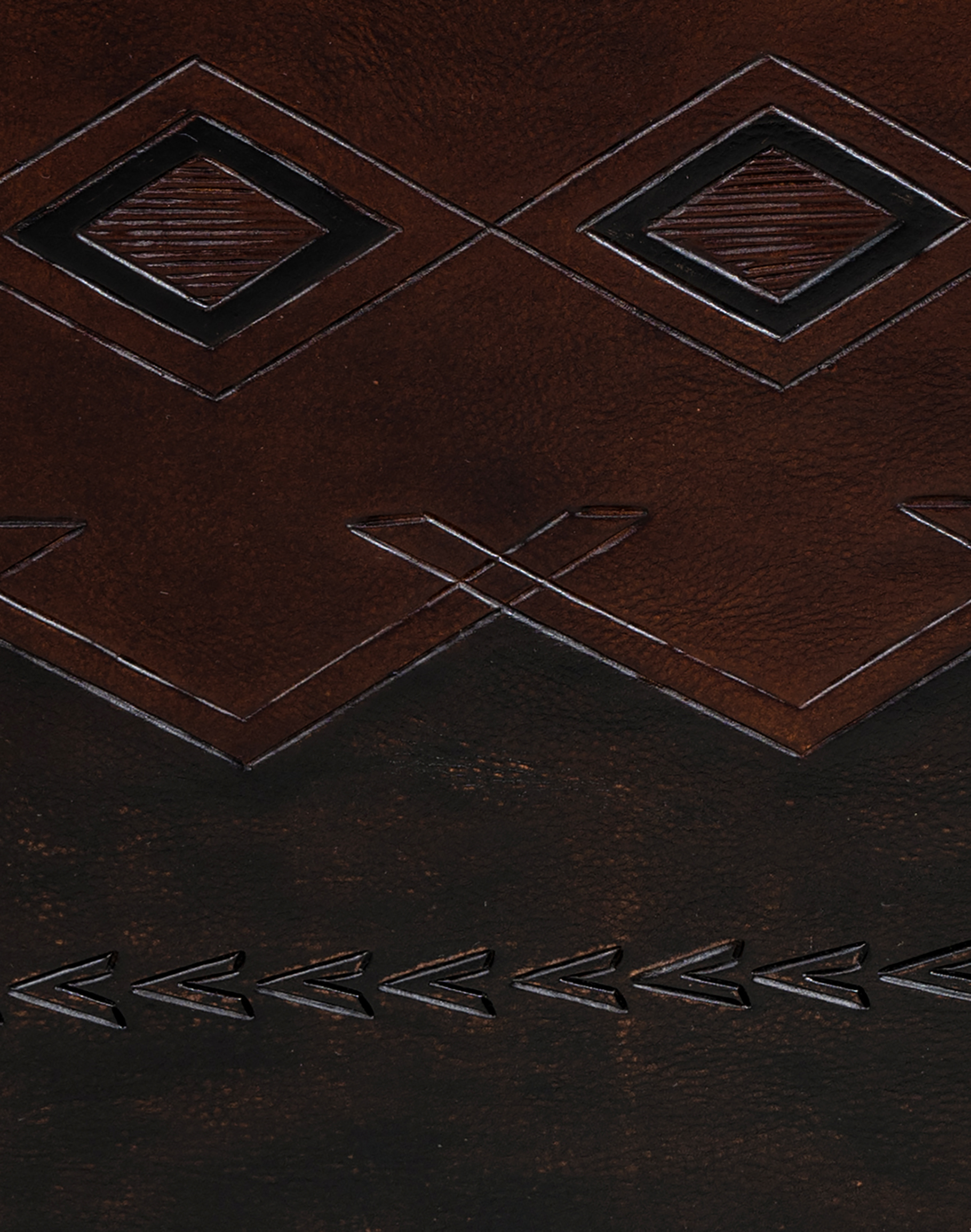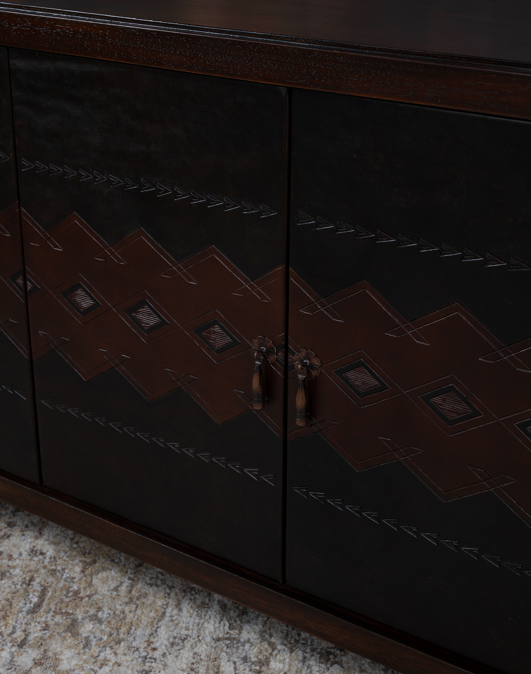 A true artistry lies in the front facade, where hand-tooled leather panels take center stage. Finished in a layered palette of saddle tan and dark chocolate, the leather doors are embossed with intricate geometric patterns inspired by classic Western design. These dimensional details create a sense of movement and texture, elevating the piece beyond traditional rustic furniture into a more refined, designer-driven aesthetic.