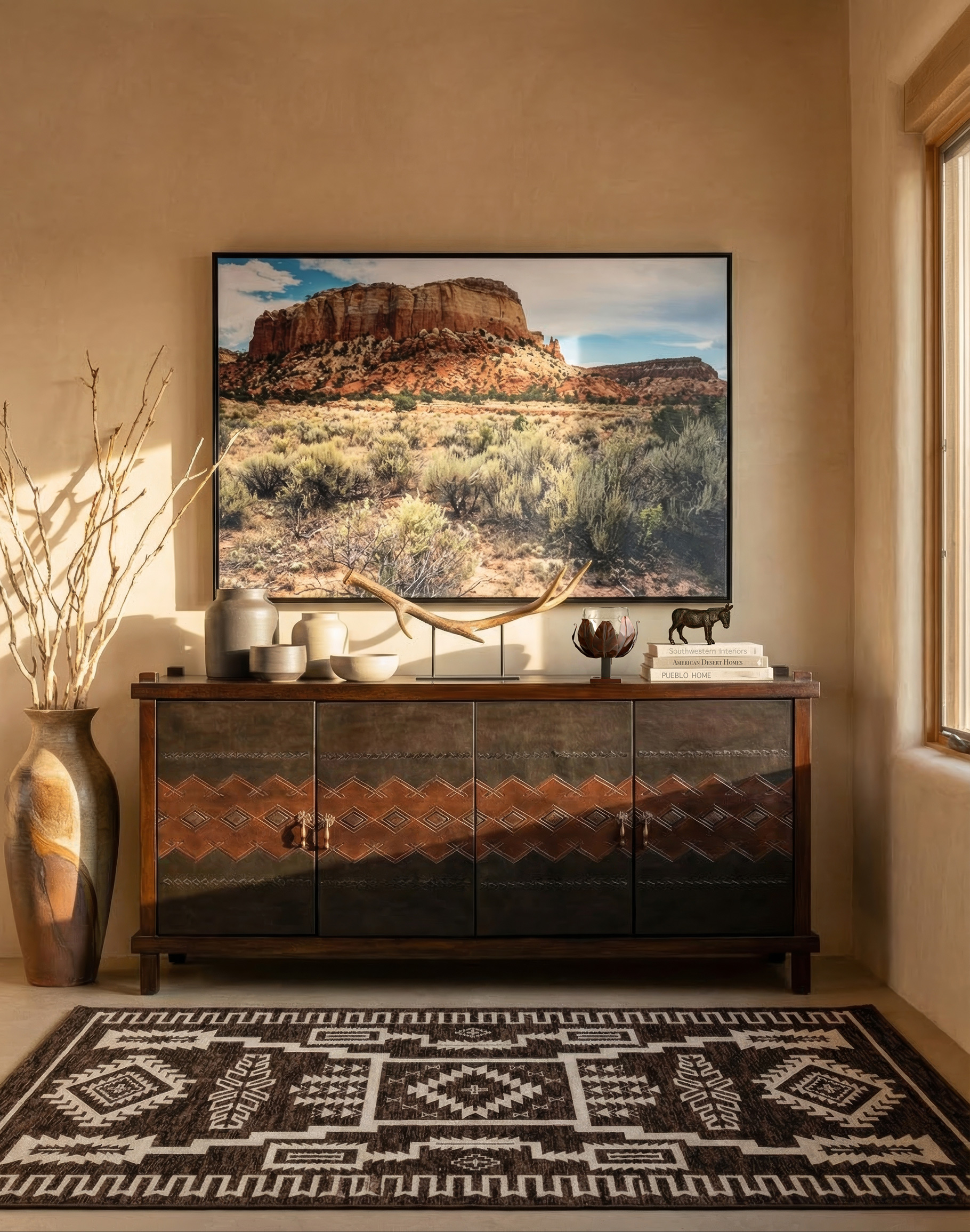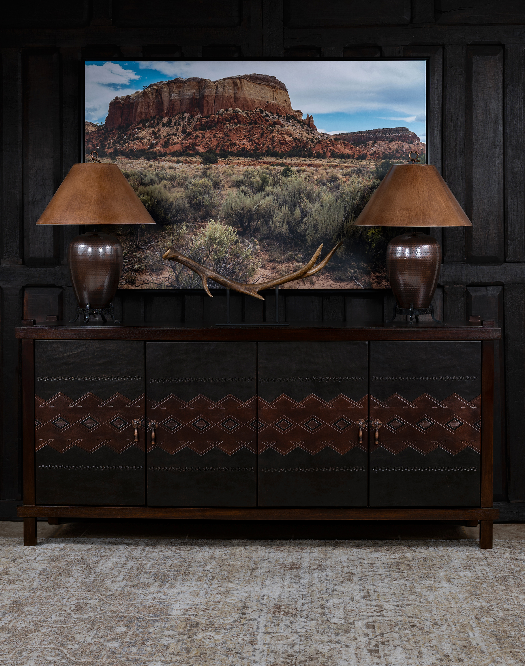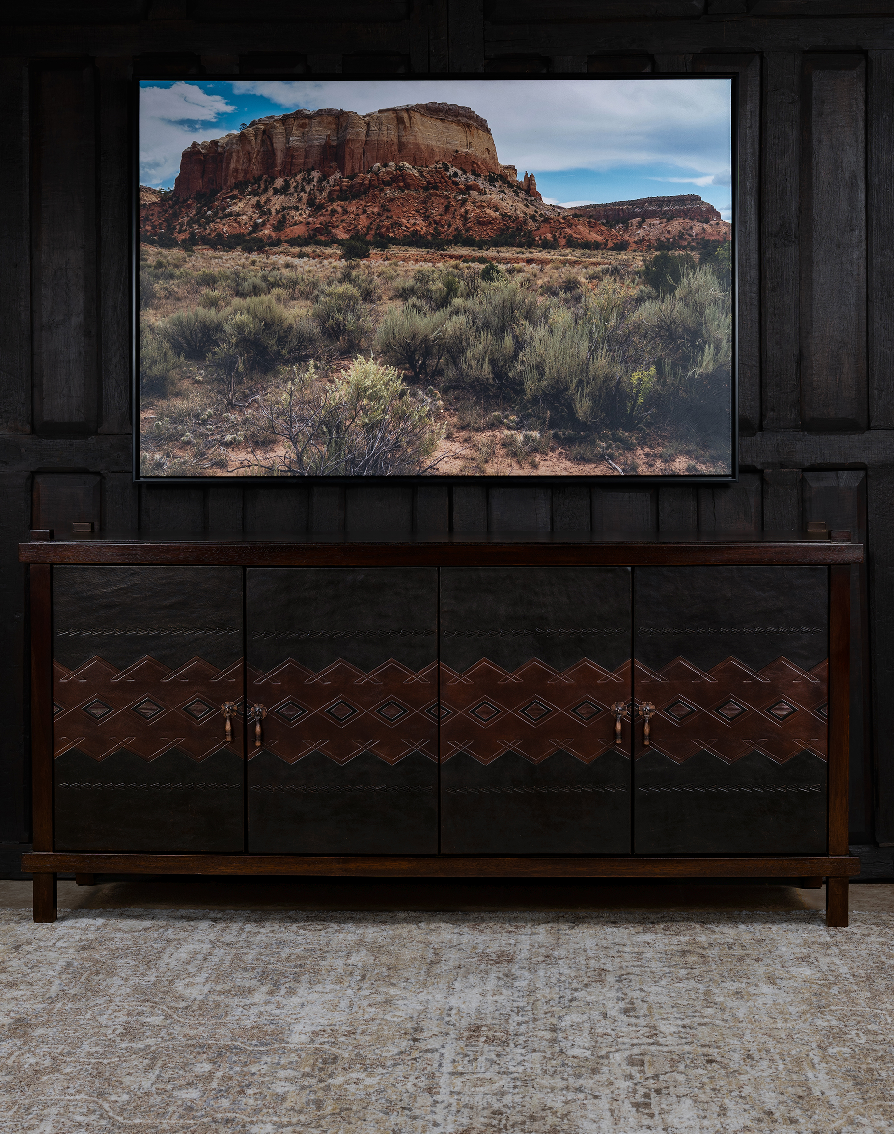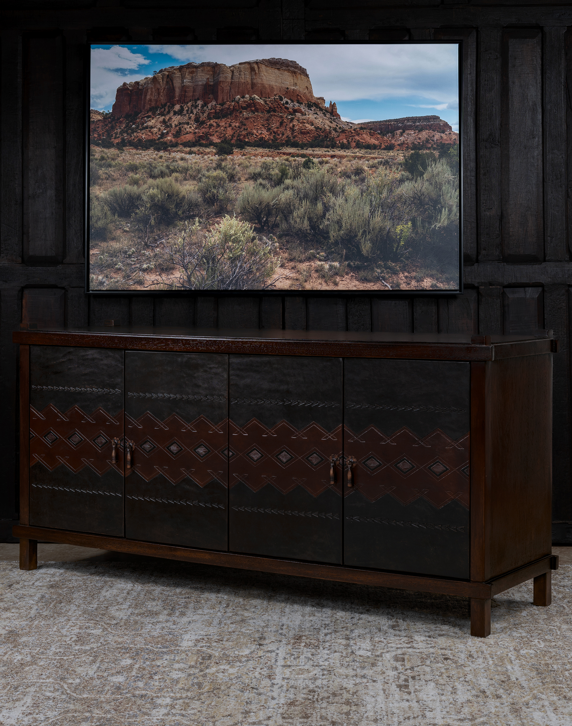 A true artistry lies in the front facade, where hand-tooled leather panels take center stage. Finished in a layered palette of saddle tan and dark chocolate, the leather doors are embossed with intricate geometric patterns inspired by classic Western design. These dimensional details create a sense of movement and texture, elevating the piece beyond traditional rustic furniture into a more refined, designer-driven aesthetic.